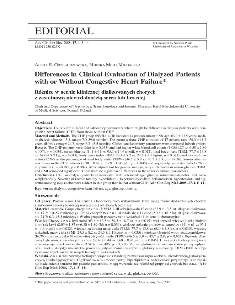 EDITORIAL Adv Clin Exp Med 2008, 17, 1, 5–14 ISSN 1230−025X © Copyright by Silesian Piasts University of Medicine in Wrocław ALICJA E. GRZEGORZEWSKA, MONIKA MŁOT−MICHALSKA Differences in Clinical Evaluation of Dialyzed Patients with or Without Congestive Heart Failure* Różnice w ocenie klinicznej dializowanych chorych z zastoinową niewydolnością serca lub bez niej Chair and Department of Nephrology, Transplantology and Internal Diseases, Karol Marcinkowski University of Medical Sciences, Poznań, Poland Abstract Objectives. To look for clinical and laboratory parameters which might be different in dialysis patients with con− gestive heart failure (CHF) from those without CHF. Material and Methods. The CHF group (NYHA I–III) included 13 patients (mean ± SD age: 63.9 ± 13.5 years, medi− an dialysis vintage: 15.2, range: 7.0–59.6 months). The group without CHF consisted of 17 persons (age: 50.3 ± 18.7 years, dialysis vintage: 24.7, range: 6.3–45.5 months). Clinical and laboratory parameters were compared in both groups. Results. The CHF patients were older (p = 0.035) and had higher white blood cell counts (8.05±1.87 vs. 6.50 ± 1.89 × 109/l, p = 0.034), serum glucose (141 ± 61 vs. 95.1 ± 14.6 mg/dl, p = 0.022), total body mass (TBM: 77.7 ± 13.8 vs. 68.0 ± 8.8 kg, p = 0.035), body mass index (BMI: 29.5 ± 8.2 vs. 24.5 ± 3.1 kg/m2, p = 0.035), and extracellular water (ECW) as the percentage of total body water (TBW) (46.5 ± 5.9 vs. 42.7 ± 2.8, p = 0.026). Serum albumin was lower in the CHF patients (3.38 ± 0.44 vs. 3.69 ± 0.45 g/dl, p = 0.045) and negatively correlated with ECW in all patients (r = –0.485, p = 0.007). After adjustment for gender and age, only differences in serum glucose, TBM, and BMI remained significant. There were no significant differences in the other examined parameters. Conclusions. CHF in dialysis patients is associated with advanced age, glucose intolerance/diabetes, and over− weight/obesity. Severity of uremic toxicity, hyperlidemia, hyperparathyroidism, inflammation, hypertension, and cig− arette smoking may not be more evident in this group than in that without CHF (Adv Clin Exp Med 2008, 17, 1, 5–14). Key words: dialysis, congestive heart failure, age, glucose, obesity. Streszczenie Cel pracy. Poszukiwanie klinicznych i laboratoryjnych wskaźników, które mogą różnić dializowanych chorych z zastoinową niewydolnością serca (z.n.s.) od chorych bez z.n.s. Materiał i metody. Grupa chorych z z.n.s. (NYHA I–III) obejmowała 13 osób (63,9 ± 13,5 lat, długość dializowa− nia 15,2; 7,0–59,6 miesięcy). Grupa chorych bez z.n.s. składała się z 17 osób (50,3 ± 18,7 lat, długość dializowa− nia 24,7; 6,3–45,5 miesięcy). W obu grupach porównywano wskaźniki kliniczne i laboratoryjne. Wyniki. Chorzy z z.n.s. byli starsi (63,9 ± 13,5 vs 50,3 ± 18,7 lat; p = 0,035), wykazywali większą liczbę białych komórek krwi (8,05 ± 1,87 vs 6,50 ± 1,89 G/l; p = 0,034), większe stężenie glukozy w surowicy (141 ± 61 vs 95,1 ± 14,6 mg/dl; p = 0,022), większą całkowitą masę ciała (TBM: 77,7 ± 13,8 vs 68,0 ± 8,8 kg, p = 0,035), większy wskaźnik masy ciała (BMI: 29,5 ± 8,2 vs 24,5 ± 3,1 kg/m2; p = 0,035) i większą objętość wody pozakomórkowej (ECW) wyrażoną jako % całkowitej objętości wody (TBW) (46,5 ± 5,9 vs 42,7 ± 2,8; p = 0,026). Stężenie albu− miny było mniejsze u chorych z z.n.s. (3,38 ± 0,44 vs 3,69 ± 0,45 g/dl; p = 0,045). U wszystkich chorych stężenie albuminy ujemnie korelowało z ECW (r = –0,485; p = 0,007). Po uwzględnieniu w analizie statystycznej wpływu płci i wieku, statystycznie istotne pozostały jedynie różnice w stężeniu glukozy w surowicy, TBM i BMI. Nie by− ło znamiennych różnic w innych badanych wskaźnikach. Wnioski. Z.n.s. u dializowanych chorych wiąże się z bardziej zaawansowanym wiekiem, nietolerancją glukozy/cu− krzycą i nadwagą/otyłością. Ciężkość toksemii mocznicowej, hiperlipidemia, nadczynność przytarczyc, stan zapal− ny, nadciśnienie tętnicze lub palenie papierosów mogą wyraźnie nie różnić tej grupy od chorych bez z.n.s. (Adv Clin Exp Med 2008, 17, 1, 5–14). Słowa kluczowe: dializa, zastoinowa niewydolność serca, wiek, glukoza, otyłość. * This paper was an oral presentation at the 34th ESAO Conference, Krems, Austria, Aug. 5–8, 2007. 6 A.E. GRZEGORZEWSKA, M. MŁOT−MICHALSKA Cardiovascular disease is the leading cause of premature mortality and disability of dialyzed patients. In end−stage renal failure, cardiovascular disease accounts for 40–50% of mortality in the Caucasian adult dialysis population [1] and the mortality rate due to vascular disease is 15 times higher than in the general population [2]. Many of the well−documented (“traditional”) cardiovascular risk factors in the general population (older age, obesity, elevated blood pressure, physical inactivi− ty, cigarette smoking, dyslipidemia, glucose intol− erance, hyperuricemia, hyperfibrinogenemia) are also present in end−stage renal disease. The pres− ence of chronic kidney disease independently pre− dicts risk for the onset or progression of cardiovas− cular disease and mortality, even after adjustment for traditional cardiovascular risk factors [3]. “Uremic” risk factors are related to salt or volume overload with consequent hypertension, anemia, increased oxidative tress, chronic inflammatory process, deranged calcium−phosphate metabolism, loss of residual renal function, accumulation of specific uremic toxins, malnutrition, metabolic aci− dosis, and hemodialysis arterio−venous fistula. All these risk factors of uremic cardiomyopathy, coro− nary artery disease, and valvular disease lead to myocardial damage that may eventually result in congestive heart failure (CHF) [7]. The aim of the present study was to look for clinical and laborato− ry parameters which might be different in patients w