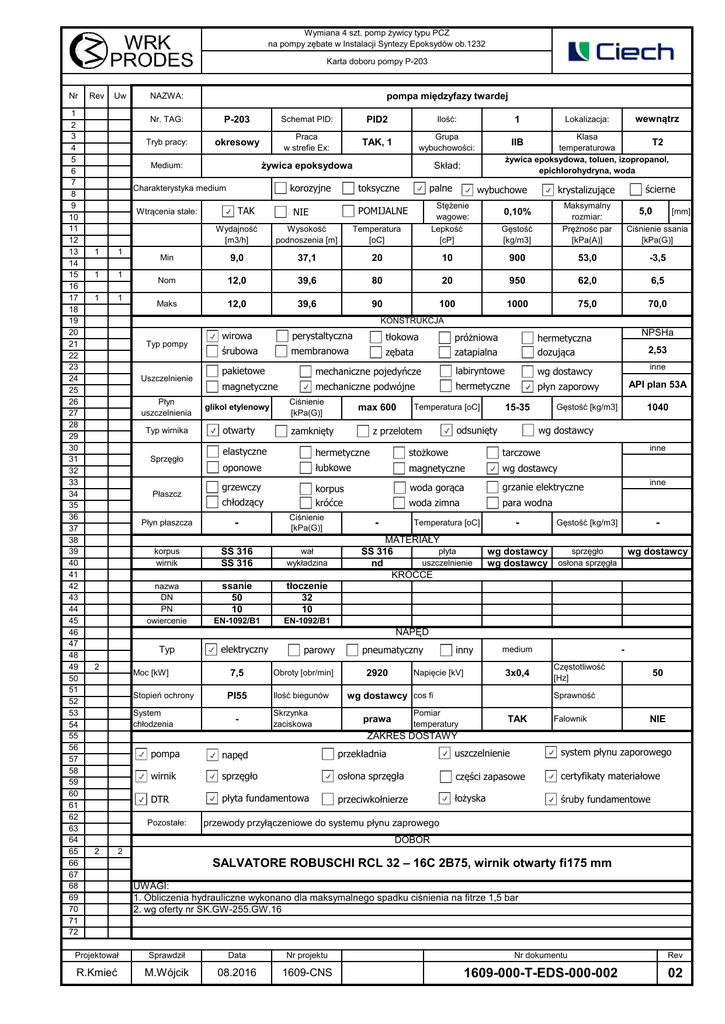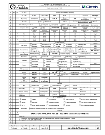 Wymiana 4 szt. pomp żywicy typu PCZ na pompy zębate w Instalacji Syntezy Epoksydów ob.1232 Karta doboru pompy P-203 Nr 1 2 3 4 5 6 7 8 9 10 11 12 13 14 15 16 17 18 19 20 21 22 23 24 25 26 27 28 29 30 31 32 33 34 35 36 37 38 39 40 41 42 43 44 45 46 47 48 49 50 51 52 53 54 55 56 57 58 59 60 61 62 63 64 65 66 67 68 69 70 71 72 Rev Uw pompa międzyfazy twardej NAZWA: Nr. TAG: Tryb pracy: P-203 Schemat PID: okresowy Praca w strefie Ex: korozyjne Charakterystyka medium 1 1 1 1 1 1 Ilość: TAK, 1 Grupa wybuchowości: żywica epoksydowa Medium: Wtrącenia stałe: PID2 TAK NIE 1 Klasa IIB T2 temperaturowa żywica epoksydowa, toluen, izopropanol, epichlorohydryna, woda Skład: toksyczne palne POMIJALNE Stężenie wagowe: Lepkość [cP] wewnątrz Lokalizacja: wybuchowe ścierne krystalizujące Gęstość [kg/m3] Maksymalny rozmiar: Prężnośc par [kPa(A)] Ciśnienie ssania [kPa(G)] 0,10% 5,0 [mm] Wydajność [m3/h] Wysokość podnoszenia [m] Temperatura [oC] Min 9,0 37,1 20 10 900 53,0 -3,5 Nom 12,0 39,6 80 20 950 62,0 6,5 Maks 12,0 39,6 90 100 1000 75,0 70,0 KONSTRUKCJA Typ pompy Uszczelnienie wirowa perystaltyczna tłokowa próżniowa śrubowa membranowa zębata zatapialna hermetyczna dozująca pakietowe mechaniczne pojedyńcze labiryntowe wg dostawcy magnetyczne mechaniczne podwójne hermetyczne płyn zaporowy Płyn uszczelnienia glikol etylenowy Typ wirnika otwarty Sprzęgło Płaszcz Płyn płaszcza Ciśnienie [kPa(G)] max 600 zamknięty z przelotem odsunięty stożkowe tarczowe oponowe łubkowe magnetyczne wg dostawcy grzewczy korpus króćce woda gorąca grzanie elektryczne woda zimna para wodna - korpus wirnik SS 316 SS 316 wał wykładzina nazwa DN PN owiercenie ssanie 50 10 tłoczenie 32 10 EN-1092/B1 EN-1092/B1 - inne - Gęstość [kg/m3] - wg dostawcy wg dostawcy sprzęgło osłona sprzęgła wg dostawcy Temperatura [oC] MATERIAŁY płyta SS 316 uszczelnienie nd KRÓĆCE 1040 inne hermetyczne Ciśnienie [kPa(G)] inne API plan 53A wg dostawcy elastyczne chłodzący 2,53 Gęstość [kg/m3] 15-35 Temperatura [oC] NPSHa NAPĘD Typ 2 Moc [kW] Stopień ochrony System chłodzenia elektryczny parowy 7,5 Obroty [obr/min] PI55 Ilość biegunów - Skrzynka zaciskowa pneumatyczny inny Napięcie [kV] 2920 3x0,4 Częstotliwość [Hz] 50 Sprawność wg dostawcy cos fi Pomiar temperatury prawa - medium TAK Falownik NIE ZAKRES DOSTAWY pompa napęd przekładnia uszczelnienie system płynu zaporowego wirnik sprzęgło osłona sprzęgła części zapasowe certyfikaty materiałowe DTR płyta fundamentowa przeciwkołnierze łożyska śruby fundamentowe Pozostałe: przewody przyłączeniowe do systemu płynu zaprowego DOBÓR 2 2 SALVATORE ROBUSCHI RCL 32 – 16C 2B75, wirnik otwarty fi175 mm UWAGI: 1. Obliczenia hydrauliczne wykonano dla maksymalnego spadku ciśnienia na fitrze 1,5 bar 2. wg oferty nr SK.GW-255.GW.16 Projektował Sprawdził Data Nr projektu Nr dokumentu Rev R.Kmieć M.Wójcik 08.2016 1609-CNS 1609-000-T-EDS-000-002 02