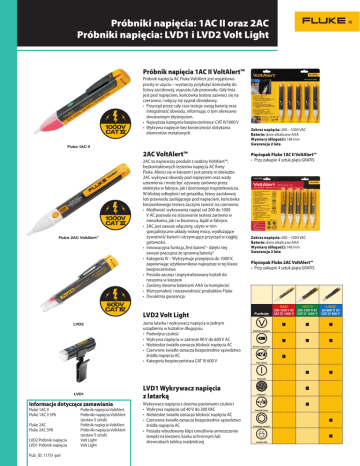 Próbniki napięcia: 1AC II oraz 2AC Próbniki napięcia: LVD1 i LVD2 Volt Light Próbnik napięcia 1AC II VoltAlert™ Próbnik napięcia AC Fluke VoltAlert jest wyjątkowo prosty w użyciu – wystarczy przyłożyć końcówkę do listwy zaciskowej, wypustu lub przewodu. Gdy linia jest pod napięciem, końcówka testera zaświeci się na czerwono, i włączy się sygnał dźwiękowy. • Przyrząd przez cały czas testuje swoją baterię oraz integralność obwodu, informując o tym okresowo dwukrotnym błyśnięciem. • Najwyższa kategoria bezpieczeństwa: CAT IV1000 V • Wykrywa napięcie bez konieczności dotykania elementów metalowych Fluke 1AC II 2AC VoltAlert™ Fluke 2AC VoltAlert™ 2AC to najnowszy produkt z rodziny VoltAlert™, bezkontaktowych testerów napięcia AC firmy Fluke. Mieści się w kieszeni i jest prosty w obsłudze. 2AC wykrywa obwody pod napięciem oraz wady uziemienia i może być używany zarówno przez elektryka w fabryce, jak i domowego majsterkowicza. W bliskiej odległości od gniazdka, listwy zaciskowej lub przewodu zasilającego pod napięciem, końcówka kieszonkowego testera zaczyna świecić na czerwono. • Możliwość wykrywania napięć od 200 do 1000 V AC pozwala na stosowanie testera zarówno w mieszkaniu, jak i w biurowcu, bądź w fabryce. • 2AC jest zawsze włączony, użyto w nim specjalistyczne układy niskiej mocy, wydłużające żywotność baterii i utrzymujące przyrząd w ciągłej gotowości. • Innowacyjna funkcja „Test baterii”- dzięki niej zawsze pracujesz ze sprawną baterią* • Kategoria IV – Wytrzymuje przepięcia do 1000 V, zapewniając użytkownikowi najwyższe w tej klasie bezpieczeństwo • Posiada zaczep i zoptymalizowany kształt do noszenia w kieszeni • Zasilany dwoma bateriami AAA (w komplecie) • Wytrzymałość i niezawodność produktów Fluke • Dwuletnia gwarancja LVD2 Volt Light LVD2 Jasna latarka i wykrywacz napięcia w jednym urządzeniu w kształcie długopisu • Podwójna czułość • Wykrywa napięcia w zakresie 90 V do 600 V AC • Niebieskie światło oznacza bliskość napięcia AC • Czerwone światło oznacza bezpośrednie sąsiedztwo źródła napięcia AC • Kategoria bezpieczeństwa CAT IV 600 V Zakres napięcia: 200 – 1000 VAC Baterie: dwie alkaliczne AAA Wymiary (długość): 148 mm Gwarancja 2 lata Pięciopak Fluke 1AC II VoltAlert™ • Przy zakupie 4 sztuk piąta GRATIS Zakres napięcia: 200 – 1000 VAC Baterie: dwie alkaliczne AAA Wymiary (długość): 148 mm Gwarancja 2 lata Pięciopak Fluke 2AC VoltAlert™ • Przy zakupie 4 sztuk piąta GRATIS Funkcje Detekcja napięcia Baterie w zestawie Test baterii Włącznik LVD1 Informacje dotyczące zamawiania Fluke 1AC II Fluke 1AC II 5PK Fluke 2AC Fluke 2AC 5PK LVD2 Próbnik napięcia LVD1 Próbnik napięcia Pub_ID: 11751-pol Próbnik napięcia VoltAlert Próbniki napięcia VoltAlert (zestaw 5 sztuk) Próbnik napięcia VoltAlert Próbniki napięcia VoltAlert (zestaw 5 sztuk) Volt Light Volt Light LVD1 Wykrywacz napięcia z latarką Wykrywacz napięcia z dwoma poziomami czułości • Wykrywa napięcie od 40 V do 300 VAC • Niebieskie światło oznacza bliskość napięcia AC • Czerwone światło oznacza bezpośrednie sąsiedztwo źródła napięcia AC • Posiada wbudowany klips umożliwia umieszczenie lampki na kieszeni, kasku ochronnym lub drzwiczkach tablicy rozdzielczej Voltbeat™ Dźwięk/cichy Podwójna czułość Latarka LED 2AC 1AC-II 200-1000 V AC 200-1000 V AC CAT IV 1000 V CAT IV 1000 V LVD2 90-600 V AC CAT IV 600 V