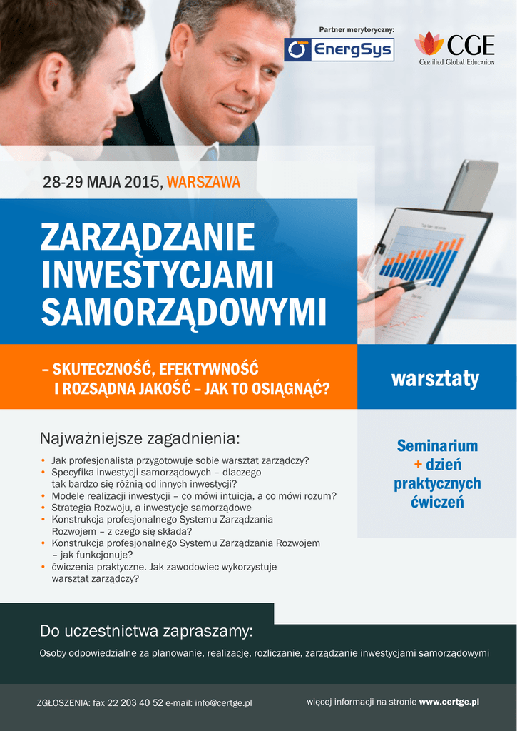 Partner merytoryczny: 28-29 MAJA 2015, WARSZAWA ZARZĄDZANIE INWESTYCJAMI SAMORZĄDOWYMI – SKUTECZNOŚĆ, EFEKTYWNOŚĆ I ROZSĄDNA JAKOŚĆ – JAK TO OSIĄGNĄĆ? warsztaty Najważniejsze zagadnienia: Seminarium + dzień praktycznych ćwiczeń • Jak profesjonalista przygotowuje sobie warsztat zarządczy? • Specyfika inwestycji samorządowych – dlaczego tak bardzo się różnią od innych inwestycji? • Modele realizacji inwestycji – co mówi intuicja, a co mówi rozum? • Strategia Rozwoju, a inwestycje samorządowe • Konstrukcja profesjonalnego Systemu Zarządzania Rozwojem – z czego się składa? • Konstrukcja profesjonalnego Systemu Zarządzania Rozwojem – jak funkcjonuje? • ćwiczenia praktyczne. Jak zawodowiec wykorzystuje warsztat zarządczy? Do uczestnictwa zapraszamy: Osoby odpowiedzialne za planowanie, realizację, rozliczanie, zarządzanie inwestycjami samorządowymi ZGŁOSZENIA: fax 22 203 40 52 e-mail: [email protected] więcej informacji na stronie www.certge.pl ZARZĄDZANIE INWESTYCJAMI SAMORZĄDOWYMI – SKUTECZNOŚĆ, EFEKTYWNOŚĆ I ROZSĄDNA JAKOŚĆ – JAK TO OSIĄGNĄĆ? 28-29 MAJA 2015, WARSZAWA PROGRAM: DZIEŃ I – SEMINARYJNY DZIEŃ II – ĆWICZENIA PRAKTYCZNE Jak profesjonalista przygotowuje sobie warsztat zarządczy? Jak zawodowiec wykorzystuje warsztat zarządczy? GŁÓWNA TEZA: nadmierna, zbędna praca jest hańbiąca… GŁÓWNA TEZA: w dobrym systemie zarządczym wszystko jest proste i relatywnie łatwe… SPECYFIKA INWESTYCJI SAMORZĄDOWYCH – DLACZEGO TAK BARDZO SIĘ RÓŻNIĄ OD INNYCH INWESTYCJI? • Inwestycje kubaturowe • Inwestycje infrastrukturalne liniowe • Inwestycje komunikacyjne • Inwestycje inne MODELE REALIZACJI INWESTYCJI – CO MÓWI INTUICJA, A CO MÓWI ROZUM? • Model Inwestora Bezpośredniego • Model Inwestora Zastępczego • Model GRI • Inżynier Kontraktu i dobre rozumienie jego roli • Ze STRATEGIA ROZWOJU, A INWESTYCJE SAMORZĄDOWE • Pojęcie Strategii Głównej • Pojęcie Strategii Funkcjonalnych • Pojęcie Programów Dziedzinowych • Pojęcie Projektów Składowych • Pojęcie Projektów Towarzyszących • Pojęcie Głównego Programu Rozwoju • Pojęcie Głównego Planu Rozwoju KONSTRUKCJA PROFESJONALNEGO SYSTEMU ZARZĄDZANIA ROZWOJEM – Z CZEGO SIĘ SKŁADA? • Metody • Techniki • Narzędzia KONSTRUKCJA PROFESJONALNEGO SYSTEMU ZARZĄDZANIA ROZWOJEM – JAK FUNKCJONUJE? • Procedury operacyjne • Procedury kontrolno-nadzorcze • Skuteczne techniki audytowania stanu inwestycji KONTAKT Anna Milewska Kierownik projektu [email protected] tel: 604 152 181 fax: 22 203 40 52 ZGŁOSZENIA: fax 22 203 40 52 e-mail: [email protected] STUDIUM PRZYPADKU – NIEZWYKŁA LINIA TROLEJBUSOWA – ZOBACZ, JAKIE TO MOŻE BYĆ PROSTE? • • • • • • Programowanie i definiowanie inwestycji samorządowej Planowanie Inwestycji Zarządzanie Wykonaniem Planu Kontrolowanie Ryzyk Rozstrzyganie kwestii krytycznych Komunikacja pozioma i pionowa w projekcie – typy komunikatów • Utrzymanie jakości i niskiego kosztu zarządzania inwestycją samorządową PODSUMOWANIE – RZUT OKA WSTECZ. POLICZMY KORZYŚCI MIERZALNE I NIEMIERZALNE TAKIEGO PODEJŚCIA. Rozkład zajęć: 10.00 Rozpoczęcie szkolenia 11.00 przerwa na kawę 12.30 – 13.30 Obiad 15.30 przerwa na kawę 16.00 Zakończenie szkolenia SZKOLENIE ZAMKNIĘTE W przypadku zainteresowania tym szkoleniem większej liczby osób z Państwa organizacji z przyjemnością przygotujemy je dla Państwa w wersji szkolenia zamkniętego. Prosimy o kontakt z kierownikiem projektu Anną Milewską [email protected] Serdecznie zapraszamy! więcej informacji na stronie www.certge.pl ZARZĄDZANIE INWESTYCJAMI SAMORZĄDOWYMI – SKUTECZNOŚĆ, EFEKTYWNOŚĆ I ROZSĄDNA JAKOŚĆ – JAK TO OSIĄGNĄĆ? PROWADZĄCY: PARNER MERYTORYCZNY: Badania Systemowe „EnergSys” Sp. z o.o. to polska firma badawczokonsultingowa z długimi tradycjami, wywodząca się z Instytutu Podstawowych Problemów Techniki Polskiej Akademii Nauk. Działa od przeszło 15 lat, świadcząc specjalistyczne i unikalne usługi dla przedsiębiorstw i instytucji sektora publicznego. Jej działalność koncentruje się na projektowaniu, dostarczaniu i wdrażaniu innowacyjnych rozwiązań organizacyjno-technicznych. Wykorzystuje w niej odkryte, unikalne cechy polskiej kultury biznesu oraz administracji, które potrafi przekształcać w wysoko sprawne organizacje realizujące swe cele. Główne segmenty usług: • Innowacyjne strategie i systemy ich wdrażania • Wysokosprawne systemy zarządzanie programami, projektami i portfelami rozwojowymi • Istotne usprawnianie działalności operacyjnej w modelu procesowym • Prace systemowe w zakresie Ładu Korporacyjnego • Analizy systemowe I wspomaganie decyzji w złożonych sytuacjach trudnych wyborów • Usługi audytorskie o charakterze systemowym • Systemowa kontrola ryzyk operacyjnych I projektowych • Specjalizowane analizy, prognozy i usługi dla energetyki. Cechą wyróżniającą jest podejście, polegające na traktowanie każdej organizacji jako złożonego systemu, którego działanie jest wypadkową wielu czynników – i w której zazwyczaj ten sam cel możemy osiągnąć na wiele różnych sposobów. Pomagamy wybrać ten optymalny. Ideą przewodnią jest dążenie do pełnego wykorzystania potencjału rozwoju, jaki tkwi w polskich przedsiębiorstwach, menedżerach i pracownikach, poprzez przygotowanie ich do skutecznego konkurowania w globalnym systemie gospodarczym oraz takie usprawnienie struktur administracyjnych, że będą one wartościowym wsparciem systemowym dla tych działań. dr Tadeusz Lis Ekspert w zakresie organizacji i zarządzania oraz zasad kształtowania Ładu Korporacyjnego Autor kilkunastu wdrożeń nowoczesnych rozwiązań organizacyjnozarządczych wykorzystujących nowoczesne rozumienie pojęcia Ładu Korporacyjnego. Studia na Politechnice Warszawskiej, na Wydziale Mechanicznym-Technologicznym w zakresie pr