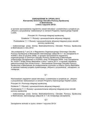 ZARZĄDZENIE Nr 2/POKL/2012 Kierownika Gminnego Ośrodka Pomocy Społecznej w Bełchatowie z dnia 2 stycznia 2012r. w sprawie wprowadzenia regulaminu zasad rekrutacji i uczestnictwa w projekcie pn. „Aktywni z przyszłością” realizowanym w ramach Programu Operacyjnego Kapitał Ludzki, Priorytet VII. Promocja integracji społecznej, Działanie 7.1 Rozwój i upowszechnianie aktywnej integracji, Poddziałanie 7.1.1 Rozwój i upowszechnianie aktywnej integracji przez ośrodki pomocy społecznej - realizowanego przez Gminę Bełchatów/Gminny Ośrodek Pomocy Społecznej w Bełchatowie w roku 2012 Na podstawie § 7 ust 2 lit. k Regulaminu Organizacyjnego Gminnego Ośrodka Pomocy Społecznej w Bełchatowie stanowiącego załącznik nr 1 do zarządzenia nr 4/2008 z dnia 22 grudnia 2008r. w sprawie wprowadzenia regulaminu organizacyjnego w Gminnym Ośrodku Pomocy Społecznej w Bełchatowie zmienionego zarządzeniem nr 6/2009 z dnia 16 listopada 2009r. oraz Zarządzenia Nr 10/2011 Wójta Gminy Bełchatów z dnia 7 marca 2011r. w sprawie udzielenia pełnomocnictwa Pani Annie Kumor – Kierownikowi Gminnego Ośrodka Pomocy Społecznej w Bełchatowie do podejmowania czynności w imieniu Gminy Bełchatów w zakresie realizacji projektu systemowego „Aktywni z przyszłością”, zarządzam, co następuje: §1 Wprowadzam regulamin zasad rekrutacji i uczestnictwa w projekcie pn. „Aktywni z przyszłością” realizowanym w ramach Programu Operacyjnego Kapitał Ludzki, Priorytet VII. Promocja integracji społecznej, Działanie 7.1 Rozwój i upowszechnianie aktywnej integracji, Poddziałanie 7.1.1 Rozwój i upowszechnianie aktywnej integracji przez ośrodki pomocy społecznej - realizowanego przez Gminę Bełchatów/Gminny Ośrodek Pomocy Społecznej w Bełchatowie, stanowiącego załącznik nr 1 do niniejszego zarządzenia. §2 Zarządzenie wchodzi w Ŝycie z dniem 1 stycznia 2012r. Załącznik nr 1 do zarządzenia nr 2/POKL/2012 Kierownika Gminnego Ośrodka Pomocy Społecznej w Bełchatowie z dnia 2 stycznia 2012r. Regulamin zasad rekrutacji i uczestnictwa w projekcie pn.” Aktywni z przyszłością” realizowanym w ramach Programu Operacyjnego Kapitał Ludzki, Priorytet VII. Promocja integracji społecznej, Działanie 7.1 Rozwój i upowszechnianie aktywnej integracji, Poddziałanie 7.1.1 Rozwój i upowszechnianie aktywnej integracji przez ośrodki pomocy społecznej §1 DEFINICJE 1. Projekt – oznacza projekt systemowy pn. „Aktywni z przyszłością” realizowany w ramach Programu Operacyjnego Kapitał Ludzki Priorytet VII. Promocja integracji społecznej, Działanie 7.1 Rozwój i upowszechnianie aktywnej integracji, Poddziałanie 7.1.1 Rozwój i upowszechnianie aktywnej integracji przez ośrodki pomocy społecznej, współfinansowany z Europejskiego Funduszu Społecznego, z budŜetu krajowego oraz budŜetu Gminy Bełchatów. 2. Beneficjent – realizator projektu – Gminny Ośrodek Pomocy Społecznej w Bełchatowie, ul. Kościuszki 13. 3. Kandydat – osoba ubiegająca się o zakwalifikowanie do udziału w Projekcie. 4. Beneficjent ostateczny (BO) – uczestnik projektu, osoba, która spełnia wszystkie wymogi formalne określone we wniosku o dofinansowanie Projektu, otrzymała pozytywną opinię komisji rekrutacyjnej oraz dostarczyła do Biura Projektu wymagane dokumenty. 5. Biuro Projektu – pokój nr 10 w siedzibie beneficjenta. 6. Koordynator Projektu – osoba zarządzająca projektem, odpowiedzialna za jego realizację zgodnie z harmonogramem oraz za monitoring i ewaluację. 7. Komisja rekrutacyjna – komisja powołana w Gminnym Ośrodku Pomocy Społecznej w Bełchatowie do wyłonienia kandydatów spełniających wszystkie wymogi kwalifikacyjne do udziału w Projekcie. 8. Zespół projektowy – pracownicy Gminnego Ośrodka Pomocy Społecznej w Bełchatowie powołani do realizacji projektu systemowego pn. „Aktywni z przyszłością” . §2 POSTANOWIENIA OGÓLNE 1. Niniejszy regulamin określa zasady rekrutacji kandydatów i uczestnictwa beneficjentów ostatecznych w projekcie oraz prawa i obowiązki beneficjentów ostatecznych. 2. 3. 4. 5. 6. 7. 8. 9. Projekt zakłada objecie wsparciem 16 beneficjentów ostatecznych, w tym 11 kobiet i 5 męŜczyzn (w tym 2 osoby niepełnosprawne). Projekt pn. „Aktywni z przyszłością” skierowany jest do osób bezrobotnych, nieaktywnych zawodowo, bądź pracujących zagroŜonych wykluczeniem społecznym. Ogólnym celem projektu jest stworzenie warunków dla osób bezrobotnych, nieaktywnych zawodowo lub pracujących zagroŜonych wykluczeniem społecznym do nabycia wiedzy i umiejętności poruszania się po rynku pracy i nabycia nowych kwalifikacji zawodowych w celu podjęcia zatrudnienia w sektorze handlu i usług. Projekt obejmuje wsparciem beneficjentow ostatecznych poprzez warsztaty, kursy, badania medycyny pracy, zasiłki celowe, działania o charakterze środowiskowym. Udział w projekcie jest bezpłatny. Osoby zakwalifikowane do projektu będą objęte kontraktami socjalnymi w ramach których wezmą udział w szkoleniach. Dane uczestników projektu zostaną wpisane do Podsystemu Monitorowania Europejskiego Funduszu Społecznego PEFS. Projekt jest realizowany w okresie od 1 stycznia 2012r. do 31 grudnia 2012r. §3 ZASADY REKRUTACJI 1. Rekrutacja prowadzona będzie przez pracowników socjalnych, przy współudziale i nadzorze koordynatora . 2. W trakcie procesu rekrutacji zostanie wyłonionych 16 osób ( w tym 2 osoby niepełnosprawne), z którymi zostaną podpisane kontrakty socjalne. 3. Zostanie sporządzona lista rezerwowa osób, które mogą zająć miejsce beneficjentów ostatecznych, którzy przerwą udział w projekcie. 4. Beneficjent w celu przeprowadzenia naboru uczestników do projektu powoła Komisję Rekrutacyjną, w skład której wejdą: koordynator i pracownicy socjalni. 5. Z kandydatami zostaną sporządzone ankiety rekrutacyjne (formularze zgłoszeniowe) stanowiące załącznik nr 1 do niniejszego regulaminu. 6. Rekru
