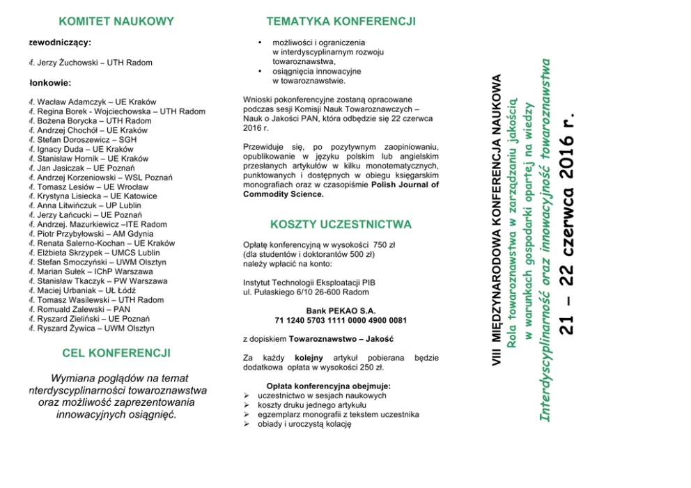 • prof. Jerzy Żuchowski − UTH Radom • Członkowie: prof. Wacław Adamczyk – UE Kraków prof. Regina Borek - Wojciechowska – UTH Radom prof. Bożena Borycka – UTH Radom prof. Andrzej Chochół – UE Kraków prof. Stefan Doroszewicz – SGH prof. Ignacy Duda – UE Kraków prof. Stanisław Hornik – UE Kraków prof. Jan Jasiczak – UE Poznań prof. Andrzej Korzeniowski – WSL Poznań prof. Tomasz Lesiów – UE Wrocław prof. Krystyna Lisiecka – UE Katowice prof. Anna Litwińczuk – UP Lublin prof. Jerzy Łańcucki – UE Poznań prof. Andrzej. Mazurkiewicz –ITE Radom prof. Piotr Przybyłowski – AM Gdynia prof. Renata Salerno-Kochan – UE Kraków prof. Elżbieta Skrzypek – UMCS Lublin prof. Stefan Smoczyński – UWM Olsztyn prof. Marian Sułek – IChP Warszawa prof. Stanisław Tkaczyk – PW Warszawa prof. Maciej Urbaniak – UŁ Łódź prof. Tomasz Wasilewski – UTH Radom prof. Romuald Zalewski – PAN prof. Ryszard Zieliński – UE Poznań prof. Ryszard Żywica – UWM Olsztyn możliwości i ograniczenia w interdyscyplinarnym rozwoju towaroznawstwa, osiągnięcia innowacyjne w towaroznawstwie. Wnioski pokonferencyjne zostaną opracowane podczas sesji Komisji Nauk Towaroznawczych – Nauk o Jakości PAN, która odbędzie się 22 czerwca 2016 r. Przewiduje się, po pozytywnym zaopiniowaniu, opublikowanie w języku polskim lub angielskim przesłanych artykułów w kilku monotematycznych, punktowanych i dostępnych w obiegu księgarskim monografiach oraz w czasopiśmie Polish Journal of Commodity Science. KOSZTY UCZESTNICTWA Opłatę konferencyjną w wysokości 750 zł (dla studentów i doktorantów 500 zł) należy wpłacić na konto: Instytut Technologii Eksploatacji PIB ul. Pułaskiego 6/10 26-600 Radom Bank PEKAO S.A. 71 1240 5703 1111 0000 4900 0081 z dopiskiem Towaroznawstwo – Jakość CEL KONFERENCJI Wymiana poglądów na temat interdyscyplinarności towaroznawstwa oraz możliwość zaprezentowania innowacyjnych osiągnięć. Za każdy kolejny artykuł pobierana dodatkowa opłata w wysokości 250 zł. Ø Ø Ø Ø będzie Opłata konferencyjna obejmuje: uczestnictwo w sesjach naukowych koszty druku jednego artykułu egzemplarz monografii z tekstem uczestnika obiady i uroczystą kolację 21 − 22 czerwca 2016 r. Przewodniczący: Interdyscyplinarność oraz innowacyjność towaroznawstwa TEMATYKA KONFERENCJI VIII MIĘDZYNARODOWA KONFERENCJA NAUKOWA Rola towaroznawstwa w zarządzaniu jakością w warunkach gospodarki opartej na wiedzy KOMITET NAUKOWY TERMINARZ 15.12. 2015 − Deklaracja udziału oraz zgłoszenie tytułu referatu lub posteru 15.01.2016 − Potwierdzenie przyjęcia zgłoszenia referatu i wskazówki dla autorów referatów (Komunikat 2 na stronie internetowej) 30.03.2016 − Przesłanie pełnej wersji referatu oraz uiszczenie opłaty. 31.05.2016 − Informacje finalne KOMITET ORGANIZACYJNY Przewodnicząca dr Małgorzata Lotko Sekretarz mgr Łukasz Wójtowicz Członkowie mgr inż. Leszek Kornatowski mgr Marcin Nowak dr inż. Magdalena Paździor dr inż. Jadwiga Rudecka dr Monika Żuchowska-Grzywacz (Komunikat 3 na stronie internetowej). ADRES DO KORESPONDENCJI KARTA ZGŁOSZENIA Formularz zgłoszeniowy dostępny będzie na stronie internetowej: www.we.uniwersytetradom.pl Bardzo prosimy o wypełnienie formularza oraz jego odesłanie. Katedra Towaroznawstwa i Nauk o Jakości Wydział Ekonomiczny Uniwersytet Technologiczno – Humanistyczny w Radomiu ul. Chrobrego 31, 26−600 Radom z dopiskiem „Jakość” e-mail: [email protected] INFORMACJA TELEFONICZNA tel: 48 361 74 05 48 361 74 06 48 361 74 68 fax: (48) 361-74-51 Bliższe informacje na temat konferencji można znaleźć na stronie internetowej: www.we.uniwersytetradom.pl WYDZIAŁ EKONOMICZNY UTH W RADOMIU KATEDRA TOWAROZNAWSTWA I NAUK O JAKOŚCI POLSKIE TOWARZYSTWO TOWAROZNAWCZE Wydział Ekonomiczny POLSKA AKADEMIA NAUK O/POZNAŃ Komisja Nauk Towaroznawczych − − Nauk o Jakości INSTYTUT TECHNOLOGII EKSPLOATACJI - PIB RADOM zapraszaj na VIII Międzynarodową Naukową Konferencję z cyklu ROLA TOWAROZNAWSTWA W ZARZĄDZANIU JAKOŚCIĄ W WARUNKACH GOSPODARKI OPARTEJ NA WIEDZY Interdyscyplinarność oraz innowacyjność towaroznawstwa Radom 21 - 22 czerwca 2016