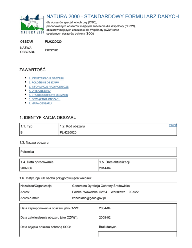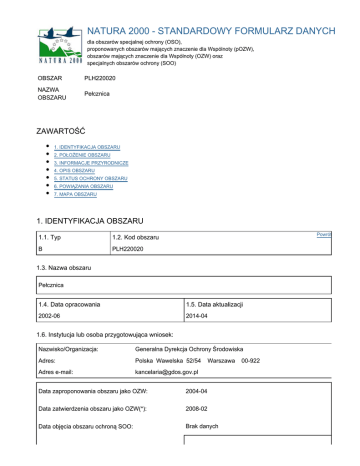NATURA 2000 - STANDARDOWY FORMULARZ DANYCH dla obszarów specjalnej ochrony (OSO), proponowanych obszarów mających znaczenie dla Wspólnoty (pOZW), obszarów mających znaczenie dla Wspólnoty (OZW) oraz specjalnych obszarów ochrony (SOO) OBSZAR PLH220020 NAZWA OBSZARU Pełcznica ZAWARTOŚĆ 1. IDENTYFIKACJA OBSZARU 2. POŁOŻENIE OBSZARU 3. INFORMACJE PRZYRODNICZE 4. OPIS OBSZARU 5. STATUS OCHRONY OBSZARU 6. POWIĄZANIA OBSZARU 7. MAPA OBSZARU 1. IDENTYFIKACJA OBSZARU 1.1. Typ 1.2. Kod obszaru B PLH220020 Powrót 1.3. Nazwa obszaru Pełcznica 1.4. Data opracowania 1.5. Data aktualizacji 2002-06 2014-04 1.6. Instytucja lub osoba przygotowująca wniosek: Nazwisko/Organizacja: Generalna Dyrekcja Ochrony Środowiska Adres: Polska Wawelska 52/54 Adres e-mail: [email protected] Warszawa Data zaproponowania obszaru jako OZW: 2004-04 Data zatwierdzenia obszaru jako OZW(*): 2008-02 Data objęcia obszaru ochroną SOO: Brak danych 00-922 Krajowe odniesienie prawne dla formy ochrony SOO: Nie wydano rozporządzenia 2. POŁOŻENIE OBSZARU Powrót 2.1. Położenie centralnego punktu [wartości dziesiętne stopni]: Długość geograficzna Szerokość geograficzna 18.246 54.5299 2.2. Powierzchnia [ha]: 2.3. Obszar morski [%] 253.06 0.0 2.5. Kod i nazwa regionu administracyjnego Kod poziomu NUTS 2 Nazwa regionu PL63 Pomorskie 2.6. Region biogeograficzny Kontynentalny (100.0 %) 3. INFORMACJE PRZYRODNICZE 3.1. Typy siedlisk przyrodniczych występujących na terenie obszaru i ocena znaczenia obszaru dla tych siedlisk: Typy siedlisk wymienione w załączniku I Kod PF NP Pokrycie [ha] Powrót Ocena obszaru Jaskinie Jakość A|B|C|D [liczba] danych A|B|C Reprezentatywność Powierzchnia względna Stan zachowania Ocena ogólna 3110 19.7 G A C B A 7110 3.02 G B C B C 7140 4.25 G D 7150 0.25 G A C A C 9110 157.4 G A C B B 9160 4.02 G D 9190 1.73 G D 91D0 24.95 G C C B C 91E0 1.46 G D PF: dla typów siedlisk, do których mogą odnosić się zarówno formy priorytetowe, jak i niepriorytetowe (6210, 7130, 9430) należy wpisać „x" w kolumnie PF celem wskazania formy priorytetowej. NP: jeśli dany typ siedliska nie istnieje już na danym terenie, należy wpisać „x" (opcjonalnie). Pokrycie: można wpisywać z dokładnością do wartości dziesiętnych. Jaskinie: w przypadku siedlisk typu 8310 i 8330 (jaskinie) należy podać liczbę jaskiń, jeśli nie są dostępne szacunkowe dane na temat powierzchni. Jakość danych: G = „wysoka" (np. na podstawie badań); M = „przeciętna" (np. na podstawie częściowych danych i ekstrapolacji); P = „niska" (np. zgrubne dane szacunkowe). 3.2. Gatunki objęte art. 4 dyrektywy 2009I147IWE i gatunki wymienione w załączniku II do dyrektywy 92I43IEWG oraz ocena znaczenia obszaru dla tych gatunków Gatunki Grupa Kod Populacja na obszarze Nazwa naukowa S NP Typ Wielkość Min I 1042 P 1831 Leucorrhinia p pectoralis Luronium Jednostka Kategoria Maks 5 Jakość A|B|C|D danych C|R|V|P i p natans Ocena obszaru P Populacja G D M C A|B|C Stan Izolacja Ogólnie zachowania A C B Grupa: A = płazy, B = ptaki, F = ryby, I = bezkręgowce, M = ssaki, P = rośliny, R = gady. S: jeśli dane o gatunku są szczególnie chronione i nie mogą być udostępnione publicznie, należy wpisać „tak". NP: jeśli dany gatunek nie występuje już na danym terenie, należy wpisać „x” (opcjonalnie). Typ: p = osiadłe, r = wydające potomstwo, c = przelotne, w = zimujące (w przypadku roślin i gatunków niemigrujących należy użyć terminu „osiadłe"). Jednostka: i = osobniki pojedyncze, p = pary lub inne jednostki według standardowego wykazu jednostek i kodów zgodnego ze sprawozdawczością na podstawie art. 12 i 17 (zob. portal referencyjny). Kategorie liczebności (kategoria): C = powszechne, R = rzadkie, V = bardzo rzadkie, P = obecne wypełnić, jeżeli brak jest danych (DD), lub jako uzupełnienie informacji o wielkości populacji. Jakość danych: G = „wysoka" (np. na podstawie badań); M = „przeciętna" (np. na podstawie częściowych danych i ekstrapolacji); P = „niska" (np. zgrubne dane szacunkowe); DD = brak danych (kategorię tę należy stosować wyłącznie, jeśli nie da się dokonać nawet zgrubnej oceny wielkości populacji - w takiej sytuacji można pozostawić puste pole dotyczące wielkości populacji, jednak pole „Kategorie liczebności" musi być wypełnione). 3.3. Inne ważne gatunki fauny i flory (opcjonalnie) Gatunek Nazwa Grupa KOD naukowa S NP Populacja na obszarze Motywacja Wielkość Gatunki wymienione Inne kategorie w załączniku Min P P Carex limosa Cladopodiella fluitans Jednostka Kategoria Maks C|R|V|P IV V A B C D R X P X P Convallaria majalis P X P Dactylorhiza majalis P X P Drosera anglica R X P Drosera rotundifolia P X P Frangula alnus C X P P Galium odoratum Helichrysum arenarium P X R X P Huperzia selago R X P Isoetes lacustris P X P Isoetes setacea P X P Ledum palustre C X P Lobelia dortmanna P X P X P Lycopodium annotinum P Nuphar lutea P X P Nuphar pumila R X P Nymphaea alba P X R X R X P X P X P X C X C X P X P X V X P X P X P X P X P P P P P P P P P P P P P P Odontoshisma sphagni Scheuchzeria palustris Sparganium angustifolium Sphagnum angustifolium Sphagnum cuspidatum Sphagnum denticulatum Sphagnum fallax Sphagnum fimbriatum Sphagnum flexuosum Sphagnum fuscum Sphagnum girgensohnii Sphagnum inundatum Sphagnum magellanicum Sphagnum nemoreum P Sphagnum palustre P X P Sphagnum riparium P X P Sphagnum rubellum P X P Sphagnum russowii P X P X P Sphagnum subsecundum P Utricularia minor R X P Utricularia vulgaris R X Grupa: A = płazy, B = ptaki, F = ryby, Fu = grzyby, I = bezkręgowce, L = porosty, M = ssaki, P = rośliny, R = gady. KOD: w odniesieniu do ptaków z gatunków wymienionych w załączniku IV i V należy zastosować nazwę naukową oraz kod podany na portalu referencyjnym. S: jeśli dane o gatunku mają charakter poufny i nie mogą być udostępnione publicznie, należy wpisać „tak". NP: jeśli dany gatunek nie występuje ju