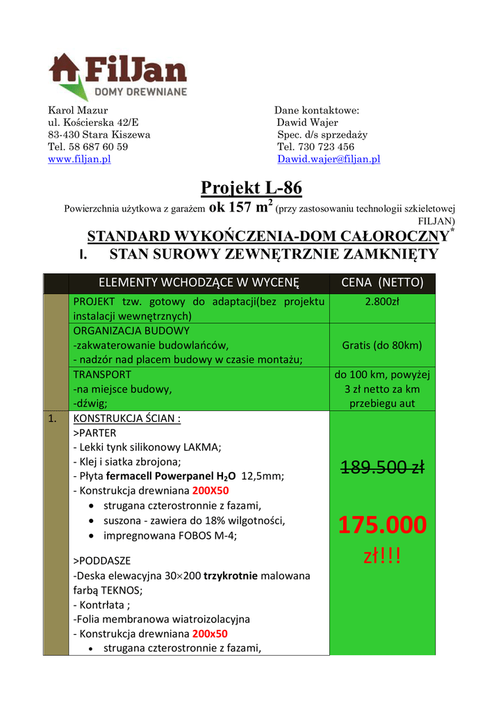 Karol Mazur ul. Kościerska 42/E 83-430 Stara Kiszewa Tel. 58 687 60 59 www.filjan.pl Dane kontaktowe: Dawid Wajer Spec. d/s sprzedaży Tel. 730 723 456 [email protected] Projekt L-86 Powierzchnia użytkowa z garażem ok 157 m2 (przy zastosowaniu technologii szkieletowej FILJAN) * STANDARD WYKOŃCZENIA-DOM CAŁOROCZNY I. STAN SUROWY ZEWNĘTRZNIE ZAMKNIĘTY ELEMENTY WCHODZĄCE W WYCENĘ 1. CENA (NETTO) PROJEKT tzw. gotowy do adaptacji(bez projektu 2.800zł instalacji wewnętrznych) ORGANIZACJA BUDOWY -zakwaterowanie budowlańców, Gratis (do 80km) - nadzór nad placem budowy w czasie montażu; TRANSPORT do 100 km, powyżej -na miejsce budowy, 3 zł netto za km -dźwig; przebiegu aut KONSTRUKCJA ŚCIAN : >PARTER - Lekki tynk silikonowy LAKMA; - Klej i siatka zbrojona; - Płyta fermacell Powerpanel H2O 12,5mm; - Konstrukcja drewniana 200X50 strugana czterostronnie z fazami, suszona - zawiera do 18% wilgotności, impregnowana FOBOS M-4; 189.500 zł 175.000 >PODDASZE -Deska elewacyjna 30200 trzykrotnie malowana farbą TEKNOS; - Kontrłata ; -Folia membranowa wiatroizolacyjna - Konstrukcja drewniana 200x50 strugana czterostronnie z fazami, zł!!! suszona - zawiera do 18% wilgotności, impregnowana FOBOS M-4; OKNA drewniane U=1,0 malowane farbą GORI lub OKNA PCV 8-komorowe PASYWNE U=0,5; DACH: -Folia membranowa wiatroizolacyjna; - Krokwie 180X60 strugane czterostronnie z fazami, suszone - zawiera do 18% wilgotności, impregnowane FOBOS M-4; STROP: - Deska stropopodłogowa 28mm; - Belki stropowe 180X80; - Podciąg 250X150; KONSTRUKCJA ŚCIAN DZIAŁOWYCH 10050; 2x DRZWI TARASOWE DREWNIANE/PCV (jeśli 2. 3. 4. 5. 6. przesuwne HS +3.000zł) 7. 8. 9. 10. 11. 12. DRZWI DREWNIANE/PCV ZEWNĘTRZNE ocieplane; SCHODY sosnowe, policzkowe (bez balustrad); BRAMA GARAŻOWA ręczna lub automatyczna; GANEK wejściowy; WYKUSZ w salonie; Dodatkowe DRZWI do pomieszczenia gospodarczego drewniane/PCV; 13. LUKARNA dachowa z BALKONEM; 14. DRZWI BALKONOWE drewniane/PCV; DODATKI 1. 2. 3. 4. 5. POKRYCIE DACHOWE z ORYNNOWANIEM RAIKO do wyboru : -Blachodachówka; -Dachówka ceramiczna KORAMIC; -Ahi roofing; -Gont bitumiczny(z deskowaniem); KOMIN : 1 kanał dymny+1 kanał wentylacyjny (z montażem i wykończeniem ponad dach) FUNDAMENTY z wykopami; OKNO DACHOWE 78x118cm; SCHODY zmiana sosny na : Jesion, dąb(bez balustrad) 15.300 zł 21.000 zł 27.500 zł 15.300 zł 4.000 zł 20.900 zł 1.400zł/szt. 2.000zł II. STAN DEWELOPERSKI ELEMENTY WCHODZĄCE W WYCENĘ 1. 2. 3. 4. 5. 6. ŚCIANY ZEWNĘTRZNE: - Wełna mineralna PAROC 25cm; - Stelaż metalowy 5cm; - Folia paroizolacyjna ALU STROTEX; -Płyta kartonowo - gipsowa szpachlowana i malowana na biało LUB -Boazeria nie lakierowana; DACH: - Wełna mineralna PAROC 30cm; - Stelaż metalowy 10cm; - Folia paroizolacyjna ALU STROTEX; -Płyta kartonowo - gipsowa szpachlowana i malowana na biało LUB -Boazeria nie lakierowana; ŚCIANY WEWNĘTRZNE: - Wełna dźwiękochłonna URSA 10cm; - Folia paroizolacyjna (dwustronnie); -Płyta kartonowo - gipsowa szpachlowana i malowana na biało LUB -Boazeria nie lakierowana; STROP – PODŁOGA PŁYWAJĄCA : - Folia paroizolacyjna; - Wełna mineralna twarda (stropowa); - Płyta fermacell jastrych lub wylewka 5cm; PARAPETY WEWNĘTRZNE drewniane INSTALACJE: -Instalacja elektryczna(38 punktów gniazdek, 35 punktów świetlne, 1 gniazdo siłowe, 1 rozdzielnia) -Instalacja wodna i kanalizacyjna wg. projektu; -Instalacja grzewcza (bez pieca, grzejników/instalacji podłogowej) 7. 8. WYLEWKA na parterze – jeśli fundamenty są wykonywane przez naszą firmę ; SCHODY strychowe rozkładane na poddasze nieużytkowe DODATKI CENA (NETTO) 119.900 zł + 112.000 zł!!! 1. 2. 3. 4. DODATKOWY PUNKT ELEKTRYCZNY; 60 zł DODATKOWY PUNKT SANITARNY; 300 zł DODATKOWE DRZWI; 1.300 zł PUNKT instalacji grzewczej (grzejnik dwupanelowy 500zł lub instalacja podłogowa) 5. KOMINEK wentylacyjny PCV 350zł/szt. *STANDARD WYKOŃCZENIA – przedstawiona oferta ma charakter informacyjny, powyższe dane mogą się różnić w zależności od wybranego modelu oraz w związku z czasowymi promocjami. Podane ceny są w wartościach netto, ponieważ do określenia należnego vat’u, potrzebna jest decyzja o warunkach zabudowy lub wypis, wyrys z miejscowego planu zagospodarowania przestrzennego(VAT 8% dla działki budowlanej lub letniskowej ; 23% dla działki rekreacyjnej) W koszt fundamentów nie są wliczone ewentualne prace ziemne : wymiana ziemi(jeśli jest czarnoziem, korzenie, gruz etc.), wyrównanie terenu. Czas budowy domu przez naszą firmę : w stanie surowym do 4 tygodni, fundamenty ok. 3 tygodni, prace deweloperskie to okres od 1 do 2 miesięcy.