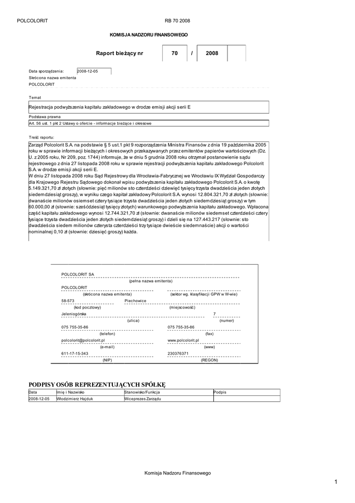 POLCOLORIT RB 70 2008 KOMISJA NADZORU FINANSOWEGO Raport bieŜący nr 70 / 2008 2008-12-05 Data sporządzenia: Skrócona nazwa emitenta POLCOLORIT Temat Rejestracja podwyŜszenia kapitału zakładowego w drodze emisji akcji serii E Podstawa prawna Art. 56 ust. 1 pkt 2 Ustawy o ofercie - informacje bieŜące i okresowe Treść raportu: Zarząd Polcolorit S.A. na podstawie § 5 ust.1 pkt 9 rozporządzenia Ministra Finansów z dnia 19 października 2005 roku w sprawie informacji bieŜących i okresowych przekazywanych przez emitentów papierów wartościowych (Dz. U. z 2005 roku, Nr 209, poz. 1744) informuje, Ŝe w dniu 5 grudnia 2008 roku otrzymał postanowienie sądu rejestrowego z dnia 27 listopada 2008 roku w sprawie rejestracji podwyŜszenia kapitału zakładowego Polcolorit S.A. w drodze emisji akcji serii E. W dniu 27 listopada 2008 roku Sąd Rejestrowy dla Wrocławia-Fabrycznej we Wrocławiu IX Wydział Gospodarczy dla Krajowego Rejestru Sądowego dokonał wpisu podwyŜszenia kapitału zakładowego Polcolorit S.A. o kwotę 5.149.321,70 zł złotych (słownie: pięć milionów sto czterdzieści dziewięć tysięcy trzysta dwadzieścia jeden złotych siedemdziesiąt groszy), w wyniku czego kapitał zakładowy Polcolorit S.A. wynosi 12.804.321,70 zł złotych (słownie: dwanaście milionów osiemset cztery tysiące trzysta dwadzieścia jeden złotych siedemdziesiąt groszy) w tym 60.000,00 zł (słownie: sześćdziesiąt tysięcy złotych) warunkowego podwyŜszenia kapitału zakładowego. Wpłacona część kapitału zakładowego wynosi 12.744.321,70 zł (słownie: dwanaście milionów siedemset czterdzieści cztery tysiące trzysta dwadzieścia jeden złotych siedemdziesiąt groszy) i dzieli się na 127.443.217 (słownie: sto dwadzieścia siedem milionów czterysta czterdzieści trzy tysiące dwieście siedemnaście) akcji o wartości nominalnej 0,10 zł (słownie: dziesięć groszy) kaŜda. POLCOLORIT SA (pełna nazwa emitenta) POLCOLORIT (skróc ona nazwa emitenta) 58-573 (sektor wg. klasyfikacji GPW w W-wie) Piec howice (kod pocztowy) (miejscowość) Jeleniogórska 7 (ulica) (numer) 075 755-35-86 075 755-35-86 (telefon) (fax) [email protected] www.polcolorit.pl (e-mail) (www) 611-17-15-343 230376371 (NIP) (REGON) PODPISY OSÓB REPREZENTUJĄCYCH SPÓŁKĘ Data Imię i Nazwisko Stanowisko/Funkc ja 2008-12-05 Włodzimierz Hajduk Wiceprezes Zarządu Podpis Komisja Nadzoru Finansowego 1