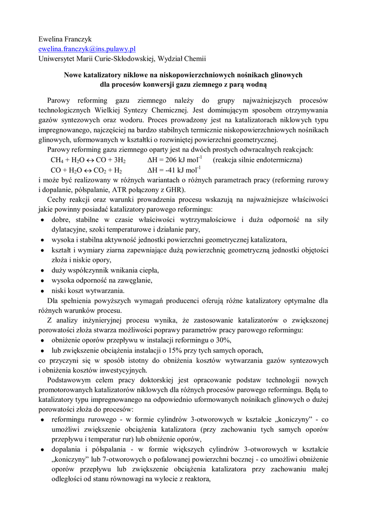 Ewelina Franczyk [email protected] Uniwersytet Marii Curie-Skłodowskiej, Wydział Chemii Nowe katalizatory niklowe na niskopowierzchniowych nośnikach glinowych dla procesów konwersji gazu ziemnego z parą wodną Parowy reforming gazu ziemnego należy do grupy najważniejszych procesów technologicznych Wielkiej Syntezy Chemicznej. Jest dominującym sposobem otrzymywania gazów syntezowych oraz wodoru. Proces prowadzony jest na katalizatorach niklowych typu impregnowanego, najczęściej na bardzo stabilnych termicznie niskopowierzchniowych nośnikach glinowych, uformowanych w kształtki o rozwiniętej powierzchni geometrycznej. Parowy reforming gazu ziemnego oparty jest na dwóch prostych odwracalnych reakcjach: CH4 + H2O CO + 3H2 ΔH = 206 kJ mol-1 (reakcja silnie endotermiczna) CO + H2O CO2 + H2 ΔH = -41 kJ mol-1 i może być realizowany w różnych wariantach o różnych parametrach pracy (reforming rurowy i dopalanie, półspalanie, ATR połączony z GHR). Cechy reakcji oraz warunki prowadzenia procesu wskazują na najważniejsze właściwości jakie powinny posiadać katalizatory parowego reformingu: dobre, stabilne w czasie właściwości wytrzymałościowe i duża odporność na siły dylatacyjne, szoki temperaturowe i działanie pary, wysoka i stabilna aktywność jednostki powierzchni geometrycznej katalizatora, kształt i wymiary ziarna zapewniające dużą powierzchnię geometryczną jednostki objętości złoża i niskie opory, duży współczynnik wnikania ciepła, wysoka odporność na zawęglanie, niski koszt wytwarzania. Dla spełnienia powyższych wymagań producenci oferują różne katalizatory optymalne dla różnych warunków procesu. Z analizy inżynieryjnej procesu wynika, że zastosowanie katalizatorów o zwiększonej porowatości złoża stwarza możliwości poprawy parametrów pracy parowego reformingu: obniżenie oporów przepływu w instalacji reformingu o 30%, lub zwiększenie obciążenia instalacji o 15% przy tych samych oporach, co przyczyni się w sposób istotny do obniżenia kosztów wytwarzania gazów syntezowych i obniżenia kosztów inwestycyjnych. Podstawowym celem pracy doktorskiej jest opracowanie podstaw technologii nowych promotorowanych katalizatorów niklowych dla różnych procesów parowego reformingu. Będą to katalizatory typu impregnowanego na odpowiednio uformowanych nośnikach glinowych o dużej porowatości złoża do procesów: reformingu rurowego - w formie cylindrów 3-otworowych w kształcie „koniczyny” - co umożliwi zwiększenie obciążenia katalizatora (przy zachowaniu tych samych oporów przepływu i temperatur rur) lub obniżenie oporów, dopalania i półspalania - w formie większych cylindrów 3-otworowych w kształcie „koniczyny” lub 7-otworowych o pofalowanej powierzchni bocznej - co umożliwi obniżenie oporów przepływu lub zwiększenie obciążenia katalizatora przy zachowaniu małej odległości od stanu równowagi na wylocie z reaktora, GHR - w formie małych, odpowiednich do dużo mniejszych średnic rur, cienkościennych pierścieni Raschiga - co umożliwi stosowanie wysokich obciążeń katalizatorów, przy niskich oporach i niskiej temperaturze wlotu gazu. Potrzebne właściwości teksturalno-wytrzymałościowe katalizatorów zapewni nowa receptura i dobór odpowiednich parametrów obróbki cieplnej nośników. Drogą do zwiększenia aktywności masy katalitycznej jest optymalizacja zawartości niklu i promotorów (metale ziem rzadkich), a drogą do podwyższenia odporności na zawęglanie jest dodatek alkaliów. W ramach pracy wykonane będą również badania o charakterze podstawowym mające na celu: zbadanie wpływu składu i właściwości teksturalno-powierzchniowych nośników na aktywność właściwą powierzchni niklu w reakcji konwersji metanu z parą wodną, zbadanie kinetyki dezaktywacji termicznej różnego typu katalizatorów parowego reformingu. Praca doktorska jest realizowana w Instytucie Nawozów Sztucznych (INS). INS jest autorem lub współautorem technologii wszystkich katalizatorów aktualnie produkowanych w kraju. Od ponad trzydziestu lat prowadzi prace badawcze i produkuje katalizatory parowego reformingu gazu ziemnego. Są one stosowane we wszystkich krajowych instalacjach produkcji gazów syntezowych, a także eksportowane do szeregu krajów. Katalizatory są zamiennikami katalizatorów oferowanych przez firmy światowe. Praktycznym efektem pracy doktorskiej będzie opracowanie, a następnie wprowadzenie do praktyki przemysłowej nowych katalizatorów dla nowoczesnych procesów parowego reformingu. Zastosowanie nowych katalizatorów opracowywanych w ramach pracy doktorskiej, w pracujących jednostkach, pozwoli obniżyć opory przepływu w instalacji reformingu o 30%, albo zwiększyć wydajność wytwarzania gazów syntezowych o 15% przy tych samych oporach w instalacji. Obniżenie kosztów eksploatacyjnych, w wyniku zmniejszenia zużycia energii sprężania, dwukrotnie przekracza cenę zakupu katalizatora. Koszty inwestycyjne instalacji reformingu, w nowych wytwórniach gazów syntezowych, mogą się zmniejszyć nawet o 20÷40%. Zwiększy się asortyment i konkurencyjność katalizatorów parowego reformingu oferowanych przez INS. Krajowe zakłady, szczególnie przemysłu azotowego i petrochemicznego, są zainteresowane zastosowaniem ulepszonych katalizatorów stwarzających nowe możliwości modernizacji. Zwiększy się także możliwość eksportu, ponieważ przewiduje się, że nowe katalizatory, opracowywane w ramach pracy doktorskiej, będą miały lepsze parametry niż aktualnie oferowane katalizatory czołowych firm światowych. Dodatkowym efektem będzie poszerzenie wiedzy naukowej w dziedzinie katalizy stosowanej - wyniki pracy doktorskiej zostaną wykorzystane w realizowanym przez INS we współpracy z UMCS projekcie rozwojowym Nr N R05 0053 06/2009 pt. „Nowe katalizatory do nowoczesnych procesów reformingu parowego”, w ramach którego planuje się patenty, 