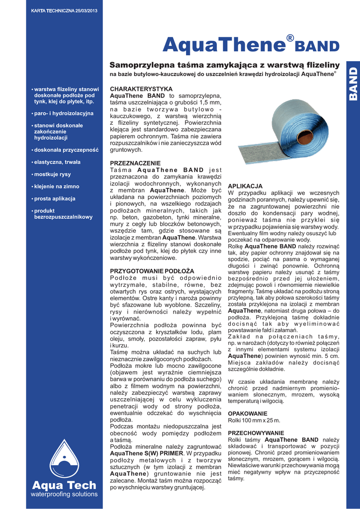 KARTA TECHNICZNA 25/03/2013 ® BAND Samoprzylepna taśma zamykająca z warstwą flizeliny na bazie butylowo-kauczukowej do uszczelnień krawędzi hydroizolacji AquaThene ® warstwa flizeliny stanowi doskonałe podłoże pod tynk, klej do płytek, itp. paro- i hydroizolacyjna stanowi doskonałe zakończenie hydroizolacji doskonała przyczepność elastyczna, trwała mostkuje rysy klejenie na zimno prosta aplikacja produkt bezrozpuszczalnikowy Aqua Tech waterproofing solutions CHARAKTERYSTYKA AquaThene BAND to samoprzylepna, taśma uszczelniająca o grubości 1,5 mm, na bazie tworzywa butylowo kauczukowego, z warstwą wierzchnią z flizeliny syntetycznej. Powierzchnia klejąca jest standardowo zabezpieczana papierem ochronnym. Taśma nie zawiera rozpuszczalników i nie zanieczyszcza wód gruntowych. PRZEZNACZENIE Ta ś m a A q u a T h e n e B A N D j e s t przeznaczona do zamykania krawędzi izolacji wodochronnych, wykonanych z membran AquaThene. Może być układana na powierzchniach poziomych i pionowych, na wszelkiego rodzajach podłożach mineralnych, takich jak np. beton, gazobeton, tynki mineralne, mury z cegły lub bloczków betonowych, wszędzie tam, gdzie stosowane są izolacje z membran AquaThene. Warstwa wierzchnia z flizeliny stanowi doskonałe podłoże pod tynk, klej do płytek czy inne warstwy wykończeniowe. PRZYGOTOWANIE PODŁOŻA Podłoże musi być odpowiednio wytrzymałe, stabilne, równe, bez otwartych rys oraz ostrych, wystających elementów. Ostre kanty i naroża powinny być sfazowane lub wyoblone. Szczeliny, rysy i nierówności należy wypełnić i wyrównać. Powierzchnia podłoża powinna być oczyszczona z kryształków lodu, plam oleju, smoły, pozostałości zapraw, pyłu i kurzu. Taśmę można układać na suchych lub nieznacznie zawilgoconych podłożach. Podłoża mokre lub mocno zawilgocone (objawem jest wyraźnie ciemniejsza barwa w porównaniu do podłoża suchego) albo z filmem wodnym na powierzchni, należy zabezpieczyć warstwą zaprawy uszczelniającej w celu wykluczenia penetracji wody od strony podłoża, ewentualnie odczekać do wyschnięcia podłoża. Podczas montażu niedopuszczalna jest obecność wody pomiędzy podłożem a taśmą. Podłoża mineralne należy zagruntować AquaThene S(W) PRIMER. W przypadku podłoży metalowych i z tworzyw sztucznych (w tym izolacji z membran AquaThene ) gruntowanie nie jest zalecane. Montaż taśm można rozpocząć po wyschnięciu warstwy gruntującej. APLIKACJA W przypadku aplikacji we wczesnych godzinach porannych, należy upewnić się, że na zagruntowanej powierzchni nie doszło do kondensacji pary wodnej, ponieważ taśma nie przyklei się w przypadku pojawienia się warstwy wody. Ewentualny film wodny należy osuszyć lub poczekać na odparowanie wody. Rolkę AquaThene BAND należy rozwinąć tak, aby papier ochronny znajdował się na spodzie, pociąć na pasma o wymaganej długości i zwinąć ponownie. Ochronną warstwę papieru należy usunąć z taśmy bezpośrednio przed jej ułożeniem, zdejmując powoli i równomiernie niewielkie fragmenty. Taśmę układać na podłożu stroną przylepną, tak aby połowa szerokości taśmy została przyklejona na izolacji z membran AquaThene, natomiast druga połowa – do podłoża. Przyklejoną taśmę dokładnie docisnąć tak aby wyeliminować powstawanie fałd i załamań. Z a k ł a d n a p o ł ą c z e n i a c h t a ś m y, np. w narożach (dotyczy to również połączeń z innymi elementami systemu izolacji AquaThene) powinien wynosić min. 5 cm. Miejsca zakładów należy docisnąć szczególnie dokładnie. W czasie układania membranę należy chronić przed nadmiernym promieniowaniem słonecznym, mrozem, wysoką temperaturą i wilgocią. OPAKOWANIE Rolki 100 mm x 25 m. PRZECHOWYWANIE Rolki taśmy AquaThene BAND należy składować i transportować w pozycji pionowej. Chronić przed promieniowaniem słonecznym, mrozem, gorącem i wilgocią. Niewłaściwe warunki przechowywania mogą mieć negatywny wpływ na przyczepność taśmy. BAND AquaThene BAND AquaThene ® BAND Samoprzylepna taśma zamykająca z warstwą flizeliny na bazie butylowo-kauczukowej do uszczelnień krawędzi hydroizolacji AquaThene® CZAS PRZYDATNOŚCI DO UŻYCIA 24 miesiące w oryginalnych opakowaniach, pod warunkiem przechowywania zgodnie z wytycznymi. WŁAŚCIWOŚCI TECHNICZNE baza warstwy klejącej warstwa wierzchnia gęstość grubość odporność na wysokie temperatury odporność na niskie temperatury twardość Shore’a 00 (szczeliwo) temp. otoczenia podczas aplikacji BEZPIECZEŃSTWO I HIGIENA PRACY Podczas układania nosić okulary ochronne. Bezpośrednio po zakończeniu prac ręce umyć ciepłą wodą. butylowo-kauczukowa włóknina syntetyczna (flizelina) ~ 1,2 g/cm2 1,5 mm do +100oC do - 50oC ok. 55 0oC do +30oC Aqua Tech waterproofing solutions Dane zawarte w niniejszej karcie technicznej są oparte na naszych doświadczeniach i badaniach, i stanowią ogólną informacje o produkcie oraz zalecenia dotyczące aplikacji w standardowych warunkach. Producent gwarantuje jakość wyrobu, natomiast nie ma wpływu na warunki i sposób jego użytkowania. W razie wątpliwości prosimy o kontakt lub wykonanie prób własnych. 5/KTE/AQU_112/25032013 Wraz z ukazaniem się tej karty technicznej tracą ważność karty wcześniejsze. Aqua Tech - Leja, Lietz Sp. J ul. Żelazna 67 lok.15 ! 00-871 Warszawa Tel. (22) 847 06 52 ! Fax. (22) 872 19 16 www.aqua-tech.com.pl [email protected]