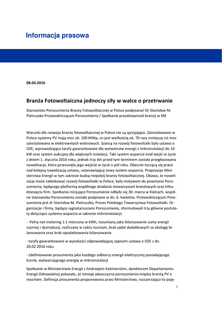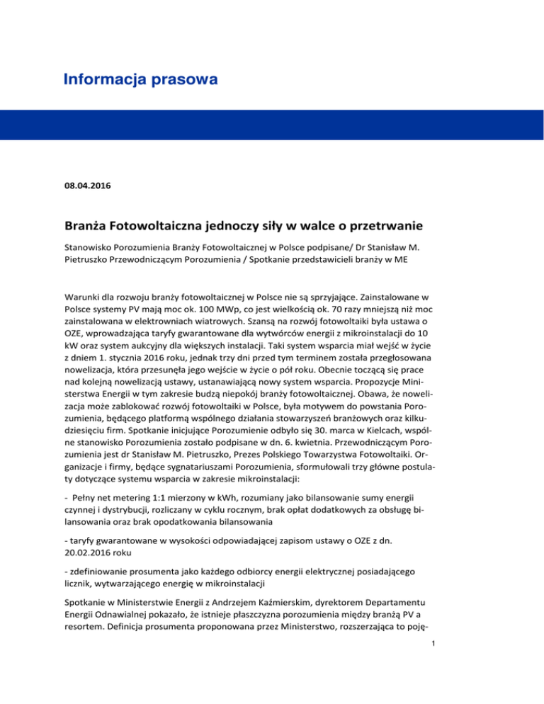 Informacja prasowa 08.04.2016 Branża Fotowoltaiczna jednoczy siły w walce o przetrwanie Stanowisko Porozumienia Branży Fotowoltaicznej w Polsce podpisane/ Dr Stanisław M. Pietruszko Przewodniczącym Porozumienia / Spotkanie przedstawicieli branży w ME Warunki dla rozwoju branży fotowoltaicznej w Polsce nie są sprzyjające. Zainstalowane w Polsce systemy PV mają moc ok. 100 MWp, co jest wielkością ok. 70 razy mniejszą niż moc zainstalowana w elektrowniach wiatrowych. Szansą na rozwój fotowoltaiki była ustawa o OZE, wprowadzająca taryfy gwarantowane dla wytwórców energii z mikroinstalacji do 10 kW oraz system aukcyjny dla większych instalacji. Taki system wsparcia miał wejść w życie z dniem 1. stycznia 2016 roku, jednak trzy dni przed tym terminem została przegłosowana nowelizacja, która przesunęła jego wejście w życie o pół roku. Obecnie toczącą się prace nad kolejną nowelizacją ustawy, ustanawiającą nowy system wsparcia. Propozycje Ministerstwa Energii w tym zakresie budzą niepokój branży fotowoltaicznej. Obawa, że nowelizacja może zablokować rozwój fotowoltaiki w Polsce, była motywem do powstania Porozumienia, będącego platformą wspólnego działania stowarzyszeń branżowych oraz kilkudziesięciu firm. Spotkanie inicjujące Porozumienie odbyło się 30. marca w Kielcach, wspólne stanowisko Porozumienia zostało podpisane w dn. 6. kwietnia. Przewodniczącym Porozumienia jest dr Stanisław M. Pietruszko, Prezes Polskiego Towarzystwa Fotowoltaiki. Organizacje i firmy, będące sygnatariuszami Porozumienia, sformułowali trzy główne postulaty dotyczące systemu wsparcia w zakresie mikroinstalacji: - Pełny net metering 1:1 mierzony w kWh, rozumiany jako bilansowanie sumy energii czynnej i dystrybucji, rozliczany w cyklu rocznym, brak opłat dodatkowych za obsługę bilansowania oraz brak opodatkowania bilansowania - taryfy gwarantowane w wysokości odpowiadającej zapisom ustawy o OZE z dn. 20.02.2016 roku - zdefiniowanie prosumenta jako każdego odbiorcy energii elektrycznej posiadającego licznik, wytwarzającego energię w mikroinstalacji Spotkanie w Ministerstwie Energii z Andrzejem Kaźmierskim, dyrektorem Departamentu Energii Odnawialnej pokazało, że istnieje płaszczyzna porozumienia między branżą PV a resortem. Definicja prosumenta proponowana przez Ministerstwo, rozszerzająca to poję1 Informacja prasowa cie również na wytwórców energii w mikroinstalacji nie będących jej właścicielami, spełnia oczekiwania branży. Również zdefiniowanie przez resort instalacji OZE jako obejmującej co najmniej jedno źródło jest korzystne, gdyż otwiera możliwość stosowania instalacji hybrydowych. Resort jest także zainteresowany sformułowaniem standardów w zakresie odbioru technicznego mikroinstalacji, co jest w pełni zgodne ze zgłaszanymi od dawna postulatami Polskiego Towarzystwa Fotowoltaicznego. Duże rozbieżności istnieją w zakresie systemu wsparcia. Ministerstwo proponuje net metering 1:0,7 dla systemów o mocy do 7 kW, dla systemów od 7 do 14 kW jedynie 1:0,5. W przypadku systemów, które otrzymały wsparcie dotacyjne, ten współczynnik wynosiłby zaledwie 1:0,35. Jest to co prawda net-metering uproszczony, czyli taki, jaki postuluje branża. Problem stanowi jednak wysokość proponowanych przez Ministerstwo współczynników. Przedstawiciele Polskiego Towarzystwa Fotowoltaiki podnieśli kwestię taryf gwarantowanych, wskazując argumenty za ich przywróceniem w kształcie zapisanym w ustawie o OZE z lutego 2015. Wskazali też na zalety instalowania magazynów energii, przytaczając przykłady polskich firm, rozwijających takie rozwiązania. Podkreślali, że fotowoltaika ma szansę stać się polską specjalnością. Istnieją polscy producenci wszystkich kluczowych komponentów instalacji PV. Potrzeba jednak wewnętrznego rynku, aby firmy te mogły się rozwinąć. Barbara Adamska ADM Poland, Polskie Towarzystwo Fotowoltaiki 2