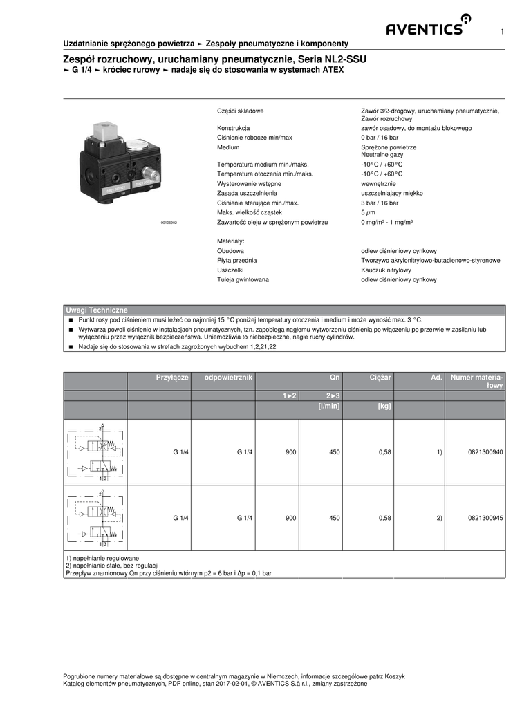 1 Uzdatnianie sprężonego powietrza ► Zespoły pneumatyczne i komponenty Zespół rozruchowy, uruchamiany pneumatycznie, Seria NL2-SSU ► G 1/4 ► króciec rurowy ► nadaje się do stosowania w systemach ATEX 00106902 Części składowe Zawór 3/2-drogowy, uruchamiany pneumatycznie, Zawór rozruchowy Konstrukcja zawór osadowy, do montażu blokowego Ciśnienie robocze min/max 0 bar / 16 bar Medium Sprężone powietrze Neutralne gazy Temperatura medium min./maks. -10°C / +60°C Temperatura otoczenia min./maks. -10°C / +60°C Wysterowanie wstępne wewnętrznie Zasada uszczelnienia uszczelniający miękko Ciśnienie sterujące min./max. 3 bar / 16 bar Maks. wielkość cząstek 5 µm Zawartość oleju w sprężonym powietrzu 0 mg/m³ - 1 mg/m³ Materiały: Obudowa odlew ciśnieniowy cynkowy Płyta przednia Tworzywo akrylonitrylowo-butadienowo-styrenowe Uszczelki Kauczuk nitrylowy Tuleja gwintowana odlew ciśnieniowy cynkowy Uwagi Techniczne ■ Punkt rosy pod ciśnieniem musi leżeć co najmniej 15 °C poniżej temperatury otoczenia i medium i może wynosić max. 3 °C. ■ Wytwarza powoli ciśnienie w instalacjach pneumatycznych, tzn. zapobiega nagłemu wytworzeniu ciśnienia po włączeniu po przerwie w zasilaniu lub wyłączeniu przez wyłącznik bezpieczeństwa. Uniemożliwia to niebezpieczne, nagłe ruchy cylindrów. ■ Nadaje się do stosowania w strefach zagrożonych wybuchem 1,2,21,22 Przyłącze odpowietrznik Qn Ciężar 1▶2 2▶3 [l/min] [kg] Ad. Numer materiałowy G 1/4 G 1/4 900 450 0,58 1) 0821300940 G 1/4 G 1/4 900 450 0,58 2) 0821300945 1) napełnianie regulowane 2) napełnianie stałe, bez regulacji Przepływ znamionowy Qn przy ciśnieniu wtórnym p2 = 6 bar i Δp = 0,1 bar Pogrubione numery materiałowe są dostępne w centralnym magazynie w Niemczech, informacje szczegółowe patrz Koszyk Katalog elementów pneumatycznych, PDF online, stan 2017-02-01, © AVENTICS S.à r.l., zmiany zastrzeżone 2 Uzdatnianie sprężonego powietrza ► Zespoły pneumatyczne i komponenty Zespół rozruchowy, uruchamiany pneumatycznie, Seria NL2-SSU ► G 1/4 ► króciec rurowy ► nadaje się do stosowania w systemach ATEX Charakterystyka ciśnienia wtórnego przy napełnianiu p2 [bar] 8 1) 6 6 4 3 4 2 0 0 25 50 75 100 125 t [sec] 00107182 napełnianie regulowane 1) Całkowicie otwarty p2 = ciśnienie wtórne t = czas napełniania 00107184 napełnianie stałe, bez regulacji p2 = ciśnienie wtórne t = czas napełniania Charakterystyka przepływu 00107186_b p2 = ciśnienie robocze qn = przepływ znamionowy Pogrubione numery materiałowe są dostępne w centralnym magazynie w Niemczech, informacje szczegółowe patrz Koszyk Katalog elementów pneumatycznych, PDF online, stan 2017-02-01, © AVENTICS S.à r.l., zmiany zastrzeżone 3 Uzdatnianie sprężonego powietrza ► Zespoły pneumatyczne i komponenty Zespół rozruchowy, uruchamiany pneumatycznie, Seria NL2-SSU ► G 1/4 ► króciec rurowy ► nadaje się do stosowania w systemach ATEX Rozmiary J L T5 Z K A5 M A2 A1 W1 W Z A6 Z O U T R 00128470 A1 = wejście A2 = wyjście A5 = przyłącze ciśnienia sterującego A6 = króciec odpowietrzający G 1/4 A1 G 1/4 G 1/8 G 1/4 2) 47 43,5 22 L M 3 38 5,4 R T 8 9,5 27,5 G 1/4 G 1/4 G 1/8 G 1/4 1) 47 43,5 22 3 38 5,4 8 9,5 27,5 A1 A2 A5 A6 G 1/4 96 W W1 Z G 1/4 96 52 20 52 J K O – 1) napełnianie regulowane 2) napełnianie stałe, bez regulacji Pogrubione numery materiałowe są dostępne w centralnym magazynie w Niemczech, informacje szczegółowe patrz Koszyk Katalog elementów pneumatycznych, PDF online, stan 2017-02-01, © AVENTICS S.à r.l., zmiany zastrzeżone T5 U