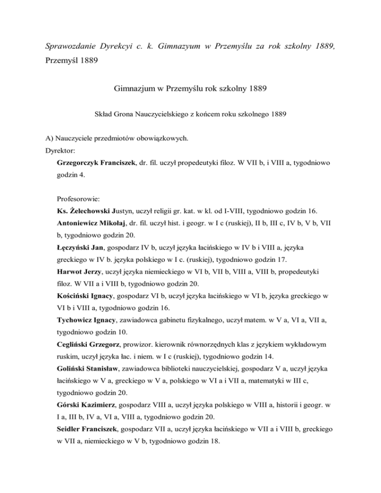Sprawozdanie Dyrekcyi c. k. Gimnazyum w Przemyślu za rok szkolny 1889, Przemyśl 1889 Gimnazjum w Przemyślu rok szkolny 1889 Skład Grona Nauczycielskiego z końcem roku szkolnego 1889 A) Nauczyciele przedmiotów obowiązkowych. Dyrektor: Grzegorczyk Franciszek, dr. fil. uczył propedeutyki filoz. W VII b, i VIII a, tygodniowo godzin 4. Profesorowie: Ks. Żelechowski Justyn, uczył religii gr. kat. w kl. od I-VIII, tygodniowo godzin 16. Antoniewicz Mikołaj, dr. fil. uczył hist. i geogr. w I c (ruskiej), II b, III c, IV b, V b, VII b, tygodniowo godzin 20. Łęczyński Jan, gospodarz IV b, uczył języka łacińskiego w IV b i VIII a, języka greckiego w IV b. języka polskiego w I c. (ruskiej), tygodniowo godzin 17. Harwot Jerzy, uczył języka niemieckiego w VI b, VII b, VIII a, VIII b, propedeutyki filoz. W VII a i VIII b, tygodniowo godzin 20. Kościński Ignacy, gospodarz VI b, uczył języka łacińskiego w VI b, języka greckiego w VI b i VIII a, tygodniowo godzin 16. Tychowicz Ignacy, zawiadowca gabinetu fizykalnego, uczył matem. w V a, VI a, VII a, tygodniowo godzin 10. Cegliński Grzegorz, prowizor. kierownik równorzędnych klas z językiem wykładowym ruskim, uczył języka łac. i niem. w I c (ruskiej), tygodniowo godzin 14. Goliński Stanisław, zawiadowca biblioteki nauczycielskiej, gospodarz V a, uczył języka łacińskiego w V a, greckiego w V a, polskiego w VI a i VII a, matematyki w III c, tygodniowo godzin 20. Górski Kazimierz, gospodarz VIII a, uczył języka polskiego w VIII a, historii i geogr. w I a, III b, IV a, VI a, VIII a, tygodniowo godzin 20. Seidler Franciszek, gospodarz VII a, uczył języka łacińskiego w VII a i VIII b, greckiego w VII a, niemieckiego w V b, tygodniowo godzin 18. Ks. Drozd Józef, dr. teol., uczył religii rzym. katol. W kl. I a, II a, c, IV, V a i VI-VIII, tygodniowo godzin 16. Nauczyciele: Rużycki Jan, gospodarz II a, uczył języka łacińskiego w II a, ruskiego w I a, b, I c (rusk.), V, VI, VII, VIII, tygodniowo godzin 21. Schneider Stanisław, gospodarz VI a, uczył języka łacińskiego w VI a, greckiego w VI a i VIII b, polskiego w III a, tygodniowo godzin 19. Zastępcy nauczycieli: Carewicz Julian, z egzaminem z języka ruskiego w całej i fizyki w niższej szkole realnej od 15. marca z powodu choroby na urlopie. Markowski Ignacy, z egzaminem z matem. i fizyki na całe gimn. gospodarz VII b, uczył matem. w IV a. V b, VII b, VIII b, fizyki w IV a, VII b i VIII b, tygodniowo godzin 21. Trusz Szymon, z egzaminem z historii natur. na całe gimn. z matem. i fizyki na niższe gimnazjum, gospodarz Ic (ruskiej), uczył matem. w I c (ruskiej), II a, II c, fizyki w III a i III c, historii naturalnej w I a, I c (ruskiej), II a, V a, VI a, tygodniowo godzin 19. Zych Franciszek z egzaminem z historii i geografii na całe gimnazjum, gospodarz VIII b, uczył języka polskiego w VII b i VIII b, historii i geografii w I b, VI b, VII a i VIII b, tygodniowo godzin 19. Krywult Walerian, z egzaminem z historii i geografii na całe gimnazjum, uczył języka niemieckiego w III a, historii i geografii w II a, II c, III a, V a, tygodniowo godzin 18. Frank Wincenty, z egzaminem z matematyki i fizyki na całe gimnazjum, uczył matematyki w I a, III a, IV b, VI b, VIII a, fizyki w IV b, VII a, VIII a, tygodniowo godzin 23. Łoziński Florian, z egzaminem z matematyki, fizyki i historii naturalnej na niższe gimnazjum, uczył matematyki w I b, II b i III b, fizyki w III b, historii naturalnej w I b, II b, II c, V b, VI b, tygodniowo godzin 21. Schnobrich Edward, z egzaminem z języka niemieckiego na całe gimnazjum, uczył języka niemieckiego w II a, II c, VI a i VII a, tygodniowo godzin 18. Bielski Józef, gospodarz III b, uczył języka łac. grec. i polskiego w III b i pol. IV a, tygodniowo godzin 17. Malinowski Jan, gospodarz IV a, uczył języka greckiego w IV a, niemieckiego w II b i IV a, ruskiego w II, III i IV, tygodniowo godzin 19. Piekarski Józef, otrzymał urlop na przeciąg II półrocza 1889 w celach naukowych. Olberek Antoni, gospodarz V b, uczył języka łacińskiego w V b, greckiego w V b, polskiego w V b i VI b, tygodniowo godzin 17. Klisiecki Andrzej, gospodarz II b, uczył języka łacińskiego w II b i IV a, polskiego w II b, tygodniowo godzin 17. Kossowicz Jan, gospodarz III a, uczył języka łacińskiego w III a i VII b, greckiego w VII b, polskiego w V a, tygodniowo godzin 18. Czapik Jan, gospodarz I b, uczył języka łacińskiego w I b, polskiego w I b i niemieckiego w I b, tygodniowo godzin 17. Bacior Józef, gospodarz II c, uczył języka łacińskiego w II c, greckiego w III a i polskiego w II c, tygodniowo godzin 16. Swiba Bronisław, gospodarz I a, uczył języka łacińskiego w I a, polskiego w I a i niemieckiego w I a, tygodniowo godzin 17. Frączkiewicz Aleksander, gospodarz III c, uczył języka łacińskiego w III c, greckiego w III c, polskiego w III c i IV b, tygodniowo godzin 17. Stępkowski Tomasz, uczył języka polskiego w II a, niemieckiego w III b, III c, IV b, V a, tygodniowo godzin 19. Ks. Mazanek Jan, dr. i profesor teol. w miejscowym duchownym sem. łac., pomocnik katechety obrz. łac., uczył religii Rzym. Kat. w I b, II b, III b, V b, tygodniowo godzin 8. Ks. Decko Andrzej, z egzaminem z religii na całe gimnazjum, samoistny kooperator gr. kat. parafii w Prałkowcach, uczył religii gr. kat. w I c (ruskiej), tygodniowo godzin 2. B) Nauczyciel pomocniczy: Baumgartem Jakub, uczył rel. mojż. tygodniowo godzin 8. C) Nauczyciele przedmiotów nadobowiązkowych: Nauczyciele hist. i geogr. w kl. III, IV, VI i VII uczyli w każdej z tych klas, także historii kraju rodzinnego, tygodniowo po godzinie. Carewicz Julian, jak wyżej, a od 15 marca b. r. Markowski Ignacy uczył kaligrafii tygodniowo godzin 2. Stypkowski Tomasz, nauczyciel nadetatowy, uczył języka francuskiego w 3 oddziałach, tygodniowo godzin 6. Ratyński Józef w I. półroczu, a Cyrbes Władysław w II. półroczu uczył śpiewu w dwóch
