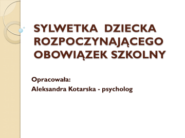 SYLWETKA DZIECKA ROZPOCZYNAJĄCEGO OBOWIĄZEK SZKOLNY Opracowała: Aleksandra Kotarska - psycholog Definicja dojrzałości szkolnej Jest to gotowość dziecka do podjęcia obowiązków szkolnych, a więc do spełniania wymogów w toku edukacji oraz gotowość do adaptacji w sytuacji szkolnej i przyjęcia nowej roli – roli ucznia. Na aktualny poziom rozwoju dziecka wpływa : stan zdrowia, warunki socjalno – bytowe, jakość sprawowanej opieki i oddziaływań wychowawczych NOWY ETAP W ŻYCIU DZIECKA I RODZINY Okres przedszkolny to faza przejściowa – zmiana ze środowiska zamkniętego na otwarte. Edukacja przedszkolna pozwala nabywać nowe doświadczenia w sferze poznawczej, społecznej i emocjonalnej. Teoria rozwoju E. Eriksona Dziecko nabywa umiejętność uczenia się, chłonięcia wiedzy o zróżnicowanym wachlarzu tematycznym przez naśladowanie wzorców zaczerpniętych nie tylko od rodziców, ale w dużej mierze od nauczycieli. Według autora dziecko sześcio-, siedmioletnie będące u progu szkoły jest gotowe do podjęcia aktywności wykraczającej poza zabawę. Rozwija się w nim zmysł pracowitości, co wiąże się z uczuciem satysfakcji ze skończonej pracy, którą osiąga dzięki wytrwałości i wytężonej uwadze. Dojrzałość szkolna 1. Rozwój somatyczny i motoryczny. 2. Rozwój intelektualny. 3. Dojrzałość emocjonalno-społeczna, moralna. Rozwój emocjonalny Zmiany w sferze emocjonalnej, początki refleksji i utraty dziecięcej spontaniczności. Skala przeżyć się wzbogaca i obejmuje różne uczucia połączone z osobistymi pragnieniami, chęcią podporządkowania się grupie i normom szkolnym. Istotna staje się rola bodźców słownych. Dziecko zwiększa kontrolę nad emocjami i organizacją pracy. Rozwój emocjonalny Następuje wzrost odporności i zdolności do znoszenia dłuższych napięć, co powiązane jest z rosnącą umiejętnością odraczania gratyfikacji (nagrody). Wiek szkolny to faza życia o największym znaczeniu w sensie społecznym. Korzyści dla dziecka z działania w różnych układach społecznych Samodzielnie: samodzielność, planowanie, odpowiedzialność Z dorosłym: korzystanie ze wsparcia, różnica kompetencji dziecko-dorosły motywuje do działania Z rówieśnikiem w diadzie: współpraca, przełamywanie egocentryzmu, uwzględnianie innego punktu widzenia niż własny Triada: negocjowanie, rozwiązywanie konfliktów W zróżnicowanej wiekowo grupie: podział ról, udzielanie pomocy, podejmowanie ról lidera i innych grupowych ról Rozwój moralności W wieku 6 lat zaczyna wzrastać wrażliwość moralna i sumienie. Moralność w tym wieku bazuje na porozumieniu we współdziałaniu według ustalonych zasad. Satysfakcję zaczyna przynosić samo postępowanie zgodnie z normą. Dzieci zaczynają dokonywać własnych ocen moralnych, czyli samodzielnie rozważać poprawność swoich działań, a nie tylko przejmować oceny od autorytetów. Sześciolatek (…) dzieci w tym wieku lubią być łagodnie, lecz stanowczo zmuszane do przygody odkrywania, że można się uczyć zdobywania rzeczy, o których nigdy by się nie pomyślało, że są tego warte – rzeczy, których atrakcyjność polega na tym, że nie są produktem zabawy i fantazji, lecz rzeczywistości, praktyczności i logiki, a zatem rzeczy będących źródłem znaczącego poczucia partycypacji w rzeczywistym świecie dorosłych (E. Erikson, 2004)