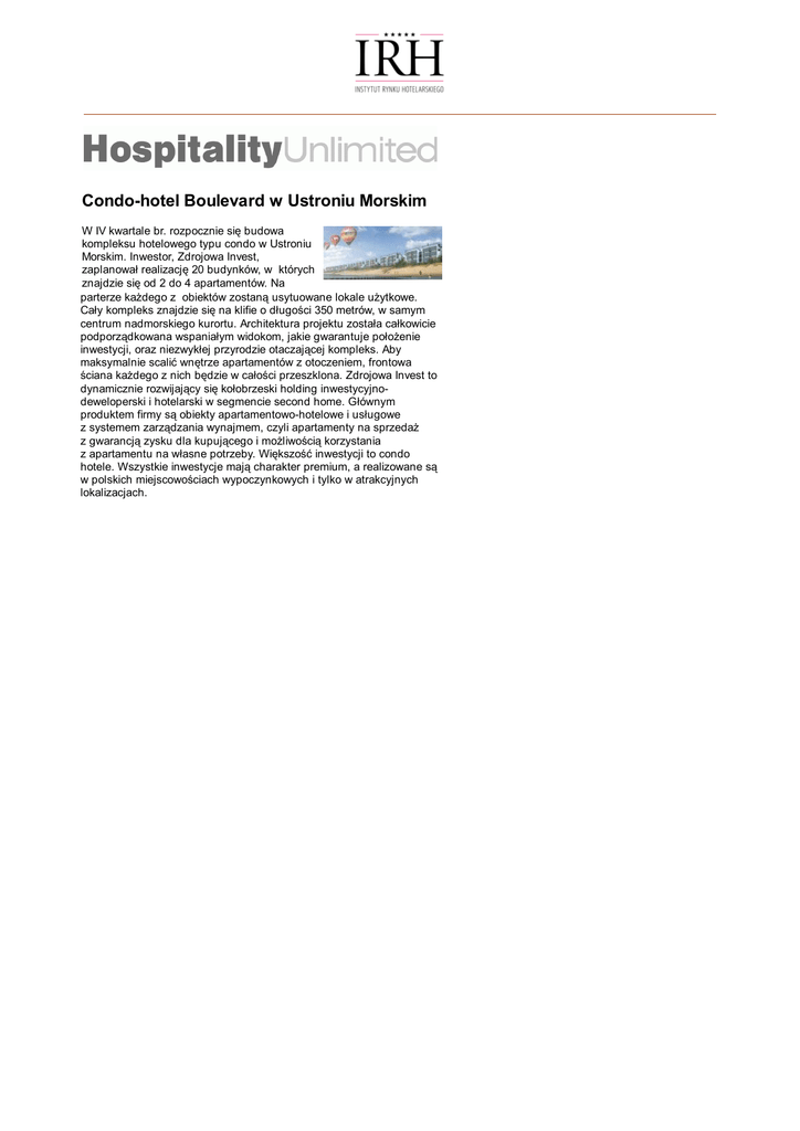 Condo-hotel Boulevard w Ustroniu Morskim W IV kwartale br. rozpocznie się budowa kompleksu hotelowego typu condo w Ustroniu Morskim. Inwestor, Zdrojowa Invest, zaplanował realizację 20 budynków, w których znajdzie się od 2 do 4 apartamentów. Na parterze każdego z obiektów zostaną usytuowane lokale użytkowe. Cały kompleks znajdzie się na klifie o długości 350 metrów, w samym centrum nadmorskiego kurortu. Architektura projektu została całkowicie podporządkowana wspaniałym widokom, jakie gwarantuje położenie inwestycji, oraz niezwykłej przyrodzie otaczającej kompleks. Aby maksymalnie scalić wnętrze apartamentów z otoczeniem, frontowa ściana każdego z nich będzie w całości przeszklona. Zdrojowa Invest to dynamicznie rozwijający się kołobrzeski holding inwestycyjnodeweloperski i hotelarski w segmencie second home. Głównym produktem firmy są obiekty apartamentowo-hotelowe i usługowe z systemem zarządzania wynajmem, czyli apartamenty na sprzedaż z gwarancją zysku dla kupującego i możliwością korzystania z apartamentu na własne potrzeby. Większość inwestycji to condo hotele. Wszystkie inwestycje mają charakter premium, a realizowane są w polskich miejscowościach wypoczynkowych i tylko w atrakcyjnych lokalizacjach.