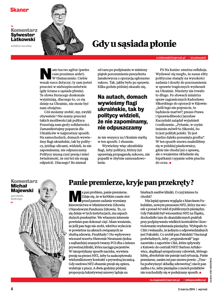 Skaner Komentarz Sylwester Latkowski Gdy u sąsiada płonie redaktor naczelny [email protected] N am tua res agitur (paries cum proximus ardet). W tłumaczeniu: Ciebie wszak rzecz dotyczy; ty sam jesteś przecież w niebezpieczeństwie (gdy ściana u sąsiada płonie). Te słowa Horacego doskonale wyjaśniają, dlaczego to, co się dzieje na Ukrainie, nie może być nam obojętne. Cóż możemy zrobić, my, zwykli obywatele? Nie mamy przecież takich możliwości jak politycy. Pozostają nam gesty solidarności. Zamanifestujmy poparcie dla Ukraińców w najprostszy sposób. Na samochodach, domach wywieśmy flagi ukraińskie, tak by politycy, jeżdżąc ulicami, widzieli, że nie zapominamy, nie odpuszczamy. Politycy muszą czuć presję i mieć świadomość, że oni też nie mogą odpuścić. Dlaczego? Bo niemal szef działu śledczego Na autach, domach wywieśmy flagi ukraińskie, tak by politycy widzieli, że nie zapominamy, nie odpuszczamy że nie wszyscy na Ukrainie myślą w ten sposób. I słusznie. Wywieśmy więc ukraińskie flagi, żeby politycy, którzy już uprawiają propagandę sukcesu, nie popadli w zbytnie samozadowolenie. PS Na koniec smutna refleksja. Wydawać się mogło, że nasze elity polityczne stanęły na wysokości zadania i doszły do porozumienia w sprawie tragicznych wydarzeń na Ukrainie. Niestety nie trwało to długo. Po słowach ministra spraw zagranicznych Radosława Sikorskiego do opozycji w Kijowie: „Jeśli tego nie poprzecie, to będziecie martwi”, prezes Prawa i Sprawiedliwości Jarosław Kaczyński zażądał wyjaśnień i rozliczenia: „Pytanie, w czyim imieniu mówił to Sikorski, bo to jest polityk polski. To jest bardzo daleko posunięta groźba”. W ten sposób znowu znaleźliśmy się w polskiej piaskownicy, gdzie nie chodzi już o sprawę, ale o wzajemne okładanie się łopatkami i sypanie sobie piachu do oczu. ■ Panie premierze, kryje pan przekręty? M a pan problem, panie premierze. Zdaje się, że w krótkim czasie stoi przed panem zadanie wymiany kierownictwa w Ministerstwie Zdrowia i Narodowym Funduszu Zdrowia. To, co się dzieje w tych instytucjach, ma zapach dużych przekrętów. We własnym interesie powinien pan dokonać cięć. Mam wrażenie, że jeśli pan tego nie zrobi, wkrótce wylecicie w powietrze na aferach związanych ze służbą zdrowia. Przykłady? Oto wpływowy wiceszef resortu Sławomir Neumann (jedna z najbardziej znanych twarzy PO) dba o interes prywatnej kliniki, która naciąga pacjentów. W niespotykany sposób naciska, wywiera presję na prezes NFZ, żeby ta zaakceptowała wielomilionowy kontrakt z prywatną lecznicą. Gdy szefowa NFZ słusznie presji się opiera, wylatuje z pracy. A dwie godziny później propozycja lukratywnej umowy ląduje na biurkach szefów kliniki. O czyj interes tu chodzi? Nie lepiej sprawa wygląda z Marcinem Pakulskim, nowym prezesem NFZ, który ma worek z ponad 60 mld zł publicznych pieniędzy. Gdy Pakulski był wiceszefem NFZ na Śląsku, dochodziło tam do skandalicznych praktyk przy podpisywaniu wielkich kontraktów i kontrolowaniu wydawania pieniędzy. Wyłapało to CBA i wskazało, że jednym z odpowiedzialnych jest Pakulski. Co zrobił pan Pakulski? Nacisnął podwładnych, żeby „wygumkowali” jego nazwisko z raportów CBA, które spływały z Katowic do centrali NFZ! Bartosz Arłukowicz, skądinąd sympatyczny człowiek, którego lubię, absolutnie nie panuje nad sytuacją. Panie premierze, zanim mi pan znowu powie: „Trzeba podwyższyć składkę zdrowotną”, niech pan zadba o to, żeby pieniądze z moich podatków nie rozchodziły się w podejrzany sposób. ■ [email protected] 4 @MajewskiMichal 2 marca 2014 | wprost Zdjęcia: arek markowicz Komentarz Michał Majewski od razu po podpisaniu w miniony piątek porozumienia prezydenta Janukowycza z opozycją ogłoszono sukces. Tak, jakby było po sprawie. Kilka godzin później okazało się, @LatkowskiS