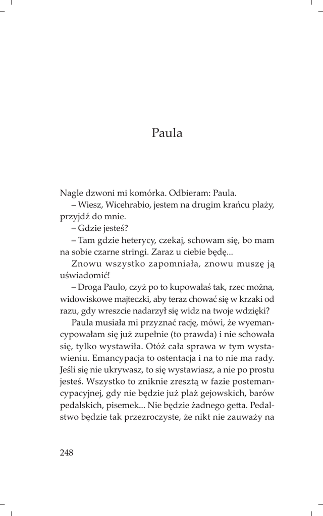 Paula Nagle dzwoni mi komórka. Odbieram: Paula. – Wiesz, Wicehrabio, jestem na drugim krańcu plaży, przyjdź do mnie. – Gdzie jesteś? – Tam gdzie heterycy, czekaj, schowam się, bo mam na sobie czarne stringi. Zaraz u ciebie będę... Znowu wszystko zapomniała, znowu muszę ją uświadomić! – Droga Paulo, czyż po to kupowałaś tak, rzec można, widowiskowe majteczki, aby teraz chować się w krzaki od razu, gdy wreszcie nadarzył się widz na twoje wdzięki? Paula musiała mi przyznać rację, mówi, że wyemancypowałam się już zupełnie (to prawda) i nie schowała się, tylko wystawiła. Otóż cała sprawa w tym wystawieniu. Emancypacja to ostentacja i na to nie ma rady. Jeśli się nie ukrywasz, to się wystawiasz, a nie po prostu jesteś. Wszystko to zniknie zresztą w fazie postemancypacyjnej, gdy nie będzie już plaż gejowskich, barów pedalskich, pisemek... Nie będzie żadnego getta. Pedalstwo będzie tak przezroczyste, że nikt nie zauważy na 248 zwykłej plaży, że facet całuje się z facetem. Ale nas wtedy, Paula, na szczęście już nie będzie na świecie. Jak Paula wyprowadziła w pole Ciotę Pseudointelektualistkę Idąc tu, Wicehrabio, przycupnęłam w grajdole dla odpoczynku i przyplątała się do mnie Pseudointelektualistka. Ja rozłożyłam ręcznik, ona podchodzi, ale należy ci się opis: w chustce kolorowej na głowie, w jakichś buddyjskich koralikach na zwiędłej szyi, w chodakach, jak nasza Pizdencja, rozłożyła się z kocem o parę metrów ode mnie i książkę czyta. No i na mnie spoziera, czemu do niej nie zagaduję, skoro ona taka wielka z tą książką i koralikami. W końcu mówi tak: „Czy można się dosiąść?”. I nie czekając na odpowiedź „dosiada się”, jakby to była kawiarnia. A ważna! Pyta się mnie: „Skąd jest?”, że niby do mnie się zwraca jak do tłumoka kuchennego w trzeciej osobie! To ja mówię, że: „Prawie z Wrocławia”, bo już mam na nią sposób. Ona: „Prawie, to znaczy s p o d Wrocławia?”. I już się cieszy, że jestem ze wsi, że będzie mogła sobie na mnie używać. Gdyby wówczas wiedziała, że z samą panią de Merteuil ma sprawę, pewnie nie kąsałaby i nie uciekała teraz w popłochu. Otóż i ludzie dziś, Wicehrabio! Bez stylu, bez gustu, bez klasy, bez szyku! Szpadą nie potrafią władać, płaszczem, intrygą, miło- 249 ścią, niczym, tylko by żarli! Gdzie spojrzeć wszyscy grubi, chipsy żrą! Sprowokowałam więc ją do tego pytania i teraz odpowiadam: „Prawie, ponieważ jedną nogą mieszkam w Paryżu”. No, to jej mina zrzedła. Ale dalej w trzeciej osobie pyta: „I co tam robi?”. Tłumok, Wicehrabio, tłumok co tam robi, ona się zapytuje. Tłumok zaś odpowiada: „Doktorat”. No to ona cała się w siebie cofnęła, bo całe jej ambicje intelektualne wynikały może z jakichś kilku wierszy opublikowanych w gazetce Robotniczego Klubu Twórców Kultury, oddział w Zgierzu. Ale pyta ostentacyjnie: „O, a to na jaki temat?”. A tłumok wtedy zaczerpnął powietrza i ten twój, Wicehrabio, temat, co nie przeszedł wtedy, wyrecytował: „Dekonstrukcja kartezjańskiego podmiotu w świetle myśli wczesnoderridiańskiej, ze szczególnym uwzględnieniem dekonstrukcji kobiecego podmiotu u Rosi Braidotti!” Masz, żryj! Żryj, intelektualistko! Co tu dużo mówić: bardzo posmutniała, schowała uszy po sobie i polazła... Św. Daria od Relikwii Wyobraź sobie, ciota młoda, gruba, prosta, z wyszczypanymi brwiami, kolekcjonuje relikwie. Cała żyje tymi wszystkimi sprawami kościelnymi, mówi językiem przetykanym łaciną i archaizmami, wszystko wie, 250 a z uciech cielesnych korzysta w obfitości... Jakie ona mi rzeczy opowiadała, Miśka, Boże! Ale powtarzać ci nie kazała. Mówi: „Jak już będę bardzo biedna, to do «Faktu» wszystko sprzedam! A ta królewna Śnieżka po sześciu skrobankach niczego się ode mnie nie dowie...”. – Wrrr! – Tyle tylko, żebyś wiedziała, mogę ci powiedzieć, że głupie, głupie byłyśmy, żeśmy dziesięć lat temu do zakonu nie poszły. Byśmy tam miały, oj tak. Oczywiście, zawsze jest jakaś wredna przeorysza, ciota gruba w okularach, która jest najważniejsza i jak takiej podpadniesz, to masz przechlapane, ale co? Zadowolisz ją i spokój. O najwyższych dostojnikach kościelnych jakie rzeczy! Może wszystko zmyśliła. Ale nie wiem. Cioty to o każdym ci powiedzą, nic dla nich nie ma świętego, wymień nazwisko jakiegoś polityka, proszę: miałam go, jakiegoś świętego męża, zaraz ci powie: ta kurwa, to kurwisko po pikiecie latało, zanim świętym zostało! Tysiąc razy go miałam! Za murkiem kto mi obciągał w osiemdziesiątym drugim? Im kto wyżej postawiony, tym bardziej oczywiste, że to ciota, ciota, z przeszłością parkową. Tak ci one mówią, Wicehrabio, i ciężko słuchać tego, ponieważ ja jestem, jak ci wiadomo, wychowana we dworku szlacheckim, w prastarej rodzinie żydowskiej. W uszanowaniu wartości. – One by chciały! Bo na swoje podobieństwo wszystkich widzą. – Daria mi opowiadała o dwóch ciotach – księżach z Poznania, które mieszkały na plebanii. Całą noc się kurwiły w darkroomach (oczywiście ubrane „po cywilnemu”), a rano szybko na plebanię, bo musiały lecieć 251 odprawiać jutrznię. Więc żeby nie odprawiać tej jutrzni w grzechu, szły na balkon i jedna drugą spowiadała i dawała rozgrzeszenie. Normalnie, tak się jedna zadumana pochylała, zasępiała i słuchała (wiadomych jej) grzechów z nocy, żegnała krzyżem drugą i następowała zamiana ról. Nawet pokutę sobie zadawały. I już takie uduchowione ubierały się w szaty i szły odprawiać. Ze spuszczonymi nabożnie oczami. Też jak geje chcieli ślub brać, to ślubu udzielały w kościele po godzinach, ze stułą, w ornacie, za pieniądze. Daria uszyła sobie taki czepiec czarny z białym, jak mają zakonnice, i na po domu to sobie zakłada. Jakbyś ją zobaczyła w tym na głowi