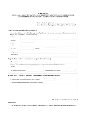 Załącznik nr 2 WZÓR ZGŁOSZENIE ODWOŁANIA ADMINISTRATORA BEZPIECZEŃSTWA INFORMACJI DO REJESTRACJI GENERALNEMU INSPEKTOROWI OCHRONY DANYCH OSOBOWYCH Data wpłynięcia zgłoszenia: ..................................................... (wypełnia Generalny Inspektor Ochrony Danych Osobowych)* Część A. Oznaczenie administratora danych Nazwa administratora danych i adres jego siedziby albo nazwisko, imię i adres zamieszkania administratora danych oraz nr REGON – jeśli został nadany. 1. Administrator: 2. REGON: 3. Adres: ulica: nr domu: nr lokalu: kod pocztowy: miejscowość: Część B. Dane osobowe administratora bezpieczeństwa informacji 1. Imię i nazwisko: 2. Numer PESEL lub, gdy ten numer nie został nadany, nazwa i seria/nr dokumentu stwierdzającego tożsamość: PESEL: nazwa dokumentu tożsamości: seria/nr dokumentu tożsamości: Część C. Data i przyczyna odwołania administratora bezpieczeństwa informacji 1. Data odwołania administratora bezpieczeństwa informacji: 2. Przyczyna odwołania administratora bezpieczeństwa informacji: (data, podpis i pieczęć administratora danych)* Objaśnienia: * Pola nie należy wypełniać, jeżeli zgłoszenie doręczone jest za pomocą środków komunikacji elektronicznej.