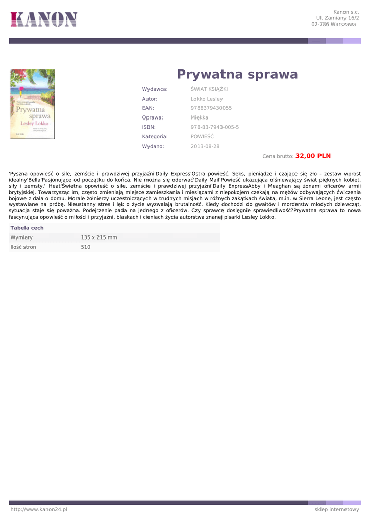 Kanon s.c. Ul. Zamiany 16/2 02-786 Warszawa Prywatna sprawa Wydawca: ŚWIAT KSIĄŻKI Autor: Lokko Lesley EAN: 9788379430055 Oprawa: Miękka ISBN: 978-83-7943-005-5 Kategoria: POWIEŚĆ Wydano: 2013-08-28 Cena brutto: 32,00 PLN 'Pyszna opowieść o sile, zemście i prawdziwej przyjaźni'Daily Express'Ostra powieść. Seks, pieniądze i czające się zło - zestaw wprost idealny'Bella'Pasjonujące od początku do końca. Nie można się oderwać'Daily Mail'Powieść ukazująca olśniewający świat pięknych kobiet, siły i zemsty.' Heat'Świetna opowieść o sile, zemście i prawdziwej przyjaźni'Daily ExpressAbby i Meaghan są żonami oficerów armii brytyjskiej. Towarzysząc im, często zmieniają miejsce zamieszkania i miesiącami z niepokojem czekają na mężów odbywających ćwiczenia bojowe z dala o domu. Morale żołnierzy uczestniczących w trudnych misjach w różnych zakątkach świata, m.in. w Sierra Leone, jest często wystawiane na próbę. Nieustanny stres i lęk o życie wyzwalają brutalność. Kiedy dochodzi do gwałtów i morderstw młodych dziewcząt, sytuacja staje się poważna. Podejrzenie pada na jednego z oficerów. Czy sprawcę dosięgnie sprawiedliwość?Prywatna sprawa to nowa fascynująca opowieść o miłości i przyjaźni, blaskach i cieniach życia autorstwa znanej pisarki Lesley Lokko. Tabela cech Wymiary 135 x 215 mm Ilość stron 510 http://www.kanon24.pl sklep internetowy