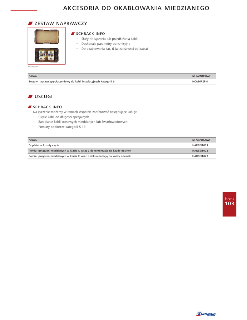 AKCESORIA DO OKABLOWANIA MIEDZIANEGO W ZESTAW NAPRAWCZY W SCHRACK INFO • • • Służy do łączenia lub przedłużania kabli Doskonałe parametry transmisyjne Do okablowania kat. 6 (w zależności od kabla) HCAT6REPKI NAZWA NR KATALOGOWY Zestaw naprawczy/połączeniowy do kabli instalacyjnych kategorii 6 HCAT6REPKI W USŁUGI W SCHRACK INFO Na • • • życzenie możemy w ramach wsparcia zaoferować następujące usługi: Cięcie kabli do długości specjalnych Zarabianie kabli krosowych miedzianych lub światłowodowych Pomiary odbiorcze kategorii 5 i 6 NAZWA NR KATALOGOWY Dopłata za koszty cięcia HARBEIT011 Pomiar połączeń miedzianych w klasie D wraz z dokumentacją na każdy odcinek HARBEIT023 Pomiar połączeń miedzianych w klasie E wraz z dokumentacją na każdy odcinek HARBEIT023 Strona 103