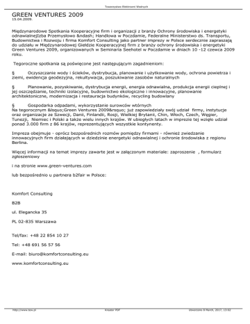Towarzystwo Elektrowni Wodnych GREEN VENTURES 2009 15.04.2009. Międzynarodowe Spotkania Kooperacyjne firm i organizacji z branży Ochrony środowiska i energetyki odnawialnejIzba Przemysłowo – Handlowa w Poczdamie, Federalne Ministerstwo ds. Transportu, Budownictwa i Rozwoju i firma Komfort Consulting jako partner imprezy w Polsce serdecznie zapraszają do udziału w Międzynarodowej Giełdzie Kooperacyjnej firm z branży ochrony środowiska i energetyki Green Ventures 2009, organizowanych w Seminaria Seehotel w Poczdamie w dniach 10 -12 czewca 2009 roku. Tegoroczne spotkania są poświęcone jest następującym zagadnieniom: § Oczyszczanie wody i ścieków, dystrybucja, planowanie i użytkowanie wody, ochrona powietrza i ziemi, ewidencja geodezyjna, rekultywacja, poszukiwanie zasobów naturalnych § Planowanie, pozyskiwanie, dystrybucja energii, energia odnawialna, produkcja energii cieplnej i jej oszczędzanie, techniki izolacyjne, budownictwo ekologiczne i innowacyjne, planowanie architektoniczne, modernizacja i restauracja budynków, recycling budowlany § Gospodarka odpadami, wykorzystanie surowców wtórnych Na tegorocznym ‘Green Ventures 2009’ już zapowiedziały swój udział firmy, instytucje oraz organizacje ze Szwecji, Danii, Finlandii, Rosji, Wielkiej Brytanii, Chin, Włoch, Czech, Węgier, Tunezji, Niemiec i Polski a także wielu innych krajów. W ubiegłych latach w imprezie tej wzięło udział ponad 3.000 firm z 86 krajów, reprezentujących wszystkie kontynenty. Impreza obejmuje - oprócz bezpośrednich rozmów pomiędzy firmami - również zwiedzanie innowacyjnych firm działających w dziedzinie energetyki odnawialnej i ochronie środowiska z regionu Berlina. Więcej informacji na temat imprezy zawarte jest w załączonym materiale: zaproszenie , formularz zgłoszeniowy i na stronie www.green-ventures.com lub bezpośrednio u partnera b2fair w Polsce: Komfort Consulting B2B ul. Elegancka 35 PL 02-835 Warszawa Tel/fax: +48 22 854 10 27 Tel: +48 691 56 57 56 E-mail: [email protected] www.komfortconsulting.eu http://www.tew.pl Kreator PDF Utworzono 8 March, 2017, 13:02