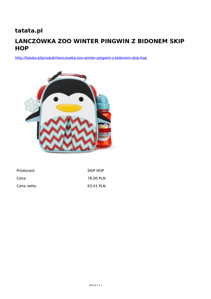 tatata.pl LANCZÓWKA ZOO WINTER PINGWIN Z BIDONEM SKIP HOP http://tatata.pl/produkt/lanczowka-zoo-winter-pingwin-z-bidonem-skip-hop Producent SKIP HOP Cena 78.00 PLN Cena netto 63.41 PLN Strona 1 z 1