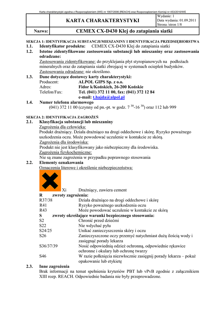 Karta charakterystyki zgodna z Rozporządzeniem (WE) nr 1907/2006 [REACH] oraz Rozporządzeniem Komisji nr 453/2010/WE KARTA CHARAKTERYSTYKI Nazwa: Wydanie: 1 Data wydania: 01.09.2011 Strona /stron 1/8 CEMEX CX-D430 Klej do zatapiania siatki SEKCJA 1: IDENTYFIKACJA SUBSTANCJI/MIESZANINY I IDENTYFIKACJA PRZEDSIĘBIORSTWA 1.1. 1.2. 1.3. 1.4. Identyfikator produktu: CEMEX CX-D430 Klej do zatapiania siatki Istotne zidentyfikowane zastosowania substancji lub mieszaniny oraz zastosowania odradzane: Zastosowania zidentyfikowane: do przyklejania płyt styropianowych na podłożach mineralnych oraz do zatapiania siatki zbrojącej w systemach ociepleń budynków. Zastosowania odradzane: nie określono. Dane dotyczące dostawcy karty charakterystyki: Producent: ALPOL GIPS Sp. z o.o. Adres: Fidor k/Końskich, 26-200 Końskie Telefon/Fax: Tel. (041) 372 11 00, fax: (041) 372 12 84 e-mail: [email protected] Numer telefonu alarmowego (041) 372 11 00 (czynny od pn.-pt. w godz. 7 30-16 30) oraz 112 lub 999 SEKCJA 2: IDENTYFIKACJA ZAGROŻEŃ 2.1. 2.2. 2.3. Klasyfikacja substancji lub mieszaniny Zagrożenia dla człowieka: Produkt drażniący. Działa drażniąco na drogi oddechowe i skórę. Ryzyko poważnego uszkodzenia oczu. Może powodować uczulenie w kontakcie ze skórą. Zagrożenia dla środowiska: Produkt nie jest klasyfikowany jako niebezpieczny dla środowiska. Zagrożenia fizykochemiczne: Nie są znane zagrożenia w przypadku poprawnego stosowania Elementy oznakowania Oznaczenia literowe i określenie niebezpieczeństwa: Xi Drażniący, zawiera cement R zwroty zagrożenia: R37/38 Działa drażniąco na drogi oddechowe i skórę R41 Ryzyko poważnego uszkodzenia oczu R43 Może powodować uczulenie w kontakcie ze skórą S zwroty określające warunki bezpiecznego stosowania: S2 Chronić przed dziećmi S22 Nie wdychać pyłu S24/25 Unikać zanieczyszczenia skóry i oczu S26 Zanieczyszczone oczy przemyć natychmiast dużą ilością wody i zasięgnąć porady lekarza S36/37/39 Nosić odpowiednią odzież ochronną, odpowiednie rękawice ochronne i okulary lub ochronę twarzy S46 W razie połknięcia niezwłocznie zasięgnij porady lekarza – pokaż opakowanie lub etykietę Inne zagrożenia Brak informacji na temat spełnienia kryteriów PBT lub vPvB zgodnie z załącznikiem XIII rozp. REACH. Odpowiednie badania nie były przeprowadzone. Karta charakterystyki zgodna z Rozporządzeniem (WE) nr 1907/2006 [REACH] oraz Rozporządzeniem Komisji nr 453/2010/WE KARTA CHARAKTERYSTYKI Nazwa: Wydanie: 1 Data wydania: 01.09.2011 Strona /stron 2/8 CEMEX CX-D430 Klej do zatapiania siatki SEKCJA 3: SKŁAD/INFORMACJA O SKŁADNIKACH 3.1. Substancje Nie dotyczy 3.2. Mieszaniny < 30% Cement portlandzki Nr CAS: 65997-15-1 Nr WE: 266-043-4 Nr rejestracji właściwej: substancja podlega przepisom okresu przejściowego Klasyfikacja wg 67/548/EWG: Xi, R37/38, R41, R43 Klasyfikacja wg 1272/2008/WE: STOT SE. 3 H335, Skin Irrit. 2 H315, Eye Dam 1 H318, Skin Sens. 1 H317 Produkt jest ubogi w chrom. Zawartość rozpuszczalnego chromu (VI) jest zgodnie z wymaganiami dyrektywy WE 2003/53/WE ograniczona do 0,0002 % (2 ppm) lub mniej w odniesieniu do suchej masy. Substancja z określoną na poziomie krajowym wartością najwyższego dopuszczalnego stężenia w środowisku pracy. < 65% Piasek kwarcowy (kruszywo) Nr CAS: 14808-60-7 Nr WE: 238-878-4 Nr rejestracji właściwej: substancja pochodzenia naturalnego wyłączona z obowiązku rejestracji Klasyfikacja wg 67/548/EWG: nie jest klasyfikowany jako niebezpieczny Klasyfikacja wg 1272/2008/WE: nie jest klasyfikowany jako niebezpieczny Substancja z określoną na poziomie krajowym wartością najwyższego dopuszczalnego stężenia w środowisku pracy. Pełen tekst zwrotów R i H podany został w sekcji 16 karty SEKCJA 4: ŚRODKI PIERWSZEJ POMOCY 4.1. Opis środków pierwszej pomocy Kontakt ze skórą: - zdjąć zabrudzone ubranie - miejsce narażone na kontakt z produktem przemyć dużą ilością wody z mydłem - jeśli to konieczne zwrócić się o pomoc lekarską Kontakt z oczami: - skażone oczy płukać, przy otwartych powiekach, ciągłym strumieniem bieżącej wody przez 10-15 minut; unikać silnego strumienia wody, który może stworzyć ryzyko uszkodzenia rogówki - nie używać żadnych płynów do przemywania oczu ani żadnych maści przed konsultacją medyczną - w przypadku gdy osoba poszkodowana nosi szkła kontaktowe zdjąć je - zwrócić się o pomoc lekarską Uwaga: osoby narażone na skażenie oczu powinny być pouczone o konieczności i sposobie ich natychmiastowego płukania. Spożycie: - wypłukać usta dużą ilością bieżącej wody - zwrócić się o pomoc lekarską Narażenie drogą oddechową: - osobę poszkodowaną przenieść do dobrze wentylowanego pomieszczenia - jeśli to konieczne zwrócić się o pomoc lekarską Karta charakterystyki zgodna z Rozporządzeniem (WE) nr 1907/2006 [REACH] oraz Rozporządzeniem Komisji nr 453/2010/WE KARTA CHARAKTERYSTYKI Nazwa: 4.2. 4.3. Wydanie: 1 Data wydania: 01.09.2011 Strona /stron 3/8 CEMEX CX-D430 Klej do zatapiania siatki Najważniejsze ostre i opóźnione objawy oraz skutki narażenia W kontakcie z oczami: łzawienie, zaczerwienienie, podrażnienie, ryzyko poważnego uszkodzenia oczu. W kontakcie ze skórą: podrażnienie, zaczerwienienie, może powodować wystąpienie reakcji alergicznej. Po inhalacji: kaszel, niewielki ból nosa, gardła podrażnienie układu oddechowego. Po spożyciu: ból brzucha, wymioty, może dojść do zablokowania układu pokarmowego. Wskazania dotyczące wszelkiej natychmiastowej pomocy lekarskiej i szczególnego postępowania z poszkodowanym Decyzję o sposobie postępowania ratunkowego podejmuje lekarz po dokładnej ocenie stanu poszkodowanego SEKCJA 5: POSTĘPOWANIE W PRZYPADKU POŻARU 5.1. 5.2. 5.3. Środki gaśnicze Odpowiednie: dwutlenek węgla, proszek gaśniczy, piana. Odpowiednie w zależności od palących się materiałów Nieodpowiednie: nie stosować strumienia wody 