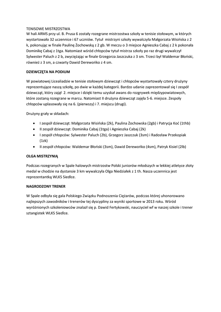 TENISOWE MISTRZOSTWA W hali ARMS przy ul. B. Prusa 6 zostały rozegrane mistrzostwa szkoły w tenisie stołowym, w których wystartowało 32 uczennice i 67 uczniów. Tytuł mistrzyni szkoły wywalczyła Małgorzata Wisińska z 2 k, pokonując w finale Paulinę Żochowską z 2 gb. W meczu o 3 miejsce Agnieszka Cabaj z 2 k pokonała Dominikę Cabaj z 1tga. Natomiast wśród chłopców tytuł mistrza szkoły po raz drugi wywalczył Sylwester Paluch z 2 b, zwyciężając w finale Grzegorza Jaszczuka z 3 sm. Trzeci był Waldemar Błoński, również z 3 sm, a czwarty Dawid Derewońko z 4 sm. DZIEWCZĘTA NA PODIUM W powiatowej Licealiadzie w tenisie stołowym dziewcząt i chłopców wystartowały cztery drużyny reprezentujące naszą szkołę, po dwie w każdej kategorii. Bardzo udanie zaprezentował się I zespół dziewcząt, który zajął 2. miejsce i dzięki temu uzyskał awans do rozgrywek międzypowiatowych, które zostaną rozegrane w marcu. Natomiast II drużyna dziewcząt zajęła 5-6. miejsce. Zespoły chłopców uplasowały się na 6. (pierwszy) i 7. miejscu (drugi). Drużyny grały w składach: I zespół dziewcząt: Małgorzata Wisińska (2k), Paulina Żochowska (2gb) i Patrycja Koć (1thb) II zespół dziewcząt: Dominika Cabaj (1tga) i Agnieszka Cabaj (2k) I zespół chłopców: Sylwester Paluch (2b), Grzegorz Jaszczuk (3sm) i Radosław Przekopiak (1zk) II zespół chłopców: Waldemar Błoński (3sm), Dawid Derewońko (4sm), Patryk Kisiel (2lb) OLGA MISTRZYNIĄ Podczas rozegranych w Spale halowych mistrzostw Polski juniorów młodszych w lekkiej atletyce złoty medal w chodzie na dystansie 3 km wywalczyła Olga Niedziałek z 1 th. Nasza uczennica jest reprezentantką WLKS Siedlce. NAGRODZONY TRENER W Spale odbyła się gala Polskiego Związku Podnoszenia Ciężarów, podczas której uhonorowano najlepszych zawodników i trenerów tej dyscypliny za wyniki sportowe w 2013 roku. Wśród wyróżnionych szkoleniowców znalazł się p. Dawid Fertykowski, nauczyciel wf w naszej szkole i trener sztangistek WLKS Siedlce.