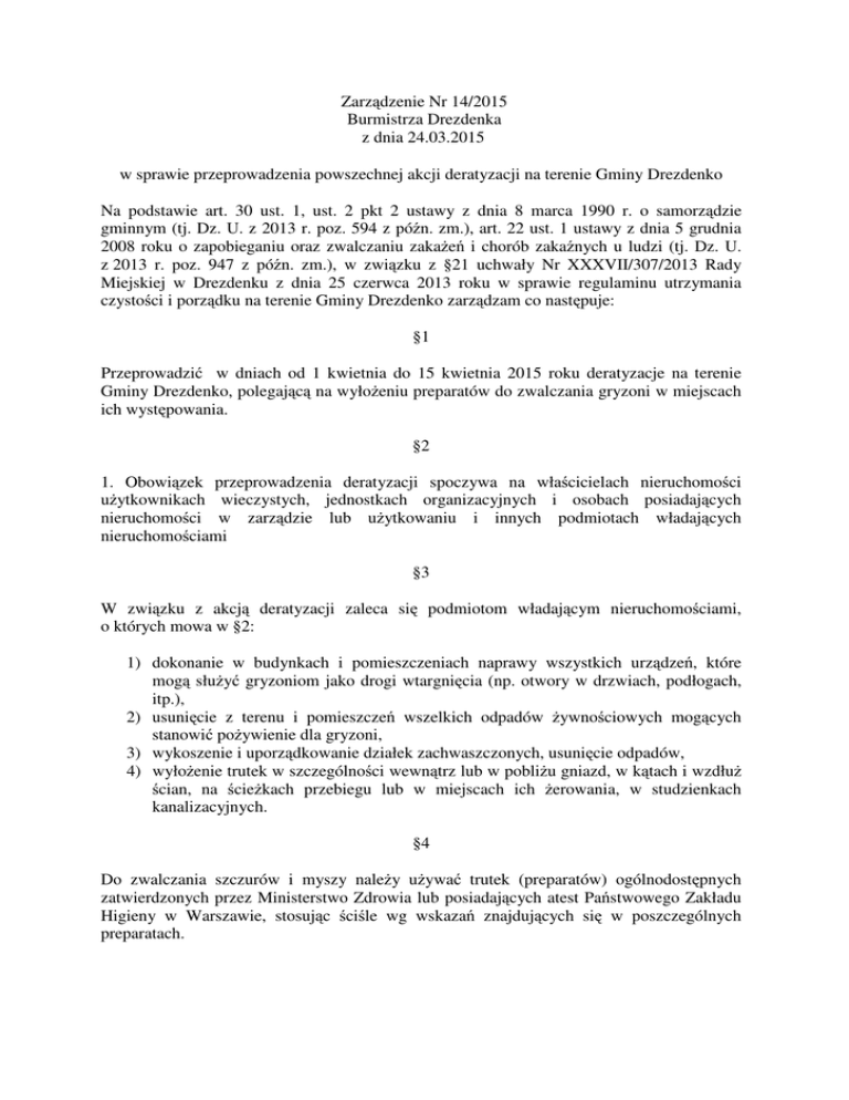 Zarządzenie Nr 14/2015 Burmistrza Drezdenka z dnia 24.03.2015 w sprawie przeprowadzenia powszechnej akcji deratyzacji na terenie Gminy Drezdenko Na podstawie art. 30 ust. 1, ust. 2 pkt 2 ustawy z dnia 8 marca 1990 r. o samorządzie gminnym (tj. Dz. U. z 2013 r. poz. 594 z późn. zm.), art. 22 ust. 1 ustawy z dnia 5 grudnia 2008 roku o zapobieganiu oraz zwalczaniu zakażeń i chorób zakaźnych u ludzi (tj. Dz. U. z 2013 r. poz. 947 z późn. zm.), w związku z §21 uchwały Nr XXXVII/307/2013 Rady Miejskiej w Drezdenku z dnia 25 czerwca 2013 roku w sprawie regulaminu utrzymania czystości i porządku na terenie Gminy Drezdenko zarządzam co następuje: §1 Przeprowadzić w dniach od 1 kwietnia do 15 kwietnia 2015 roku deratyzacje na terenie Gminy Drezdenko, polegającą na wyłożeniu preparatów do zwalczania gryzoni w miejscach ich występowania. §2 1. Obowiązek przeprowadzenia deratyzacji spoczywa na właścicielach nieruchomości użytkownikach wieczystych, jednostkach organizacyjnych i osobach posiadających nieruchomości w zarządzie lub użytkowaniu i innych podmiotach władających nieruchomościami §3 W związku z akcją deratyzacji zaleca się podmiotom władającym nieruchomościami, o których mowa w §2: 1) dokonanie w budynkach i pomieszczeniach naprawy wszystkich urządzeń, które mogą służyć gryzoniom jako drogi wtargnięcia (np. otwory w drzwiach, podłogach, itp.), 2) usunięcie z terenu i pomieszczeń wszelkich odpadów żywnościowych mogących stanowić pożywienie dla gryzoni, 3) wykoszenie i uporządkowanie działek zachwaszczonych, usunięcie odpadów, 4) wyłożenie trutek w szczególności wewnątrz lub w pobliżu gniazd, w kątach i wzdłuż ścian, na ścieżkach przebiegu lub w miejscach ich żerowania, w studzienkach kanalizacyjnych. §4 Do zwalczania szczurów i myszy należy używać trutek (preparatów) ogólnodostępnych zatwierdzonych przez Ministerstwo Zdrowia lub posiadających atest Państwowego Zakładu Higieny w Warszawie, stosując ściśle wg wskazań znajdujących się w poszczególnych preparatach. §5 1.Trutkę należy wyłożyć w dniach od 1 do 15 kwietnia br. i według zasad właściwych dla danego preparatu. 2.W okresie trwania deratyzacji zaleca się kontrolowanie i uzupełnienie wyłożonej trutki. §6 W miejscach wyłożenia trutki należy umieścić napisy ostrzegawcze o treści: ,,Uwaga! Wyłożono trutkę przeciw gryzoniom! Niebezpieczeństwo zatrucia ludzi i zwierząt!’’ §7 Właścicielom nieruchomości zaleca się usunięcie resztek preparatów po dniu 15 kwietnia z jednoczesnym uporządkowaniem miejsc i pomieszczeń, gdzie przeprowadzono deratyzację. §8 Osoby zobowiązane do przeprowadzenia deratyzacji, które nie zastosują się do wskazań i nakazów wynikających z niniejszego zarządzenia, podlegają karze grzywny do 1.500 zł lub karze nagany określonej w art. 117 ustawy z dnia 20 maja 1971 roku Kodeks wykroczeń (tj. Dz. U. z 2013 r. poz. 482 z późn zm.). §9 Zarządzenie podlega ogłoszeniu w sposób zwyczajowo przyjęty, w Biuletynie Informacji Publicznej, na stronie internetowej urzędu miejskiego www.drezdenko.pl, tablicach ogłoszeniowych, w miejscowej prasie. §10 Zarządzenie wchodzi w życie z dniem podpisania. Burmistrz Drezdenka (-) Maciej Pietruszak