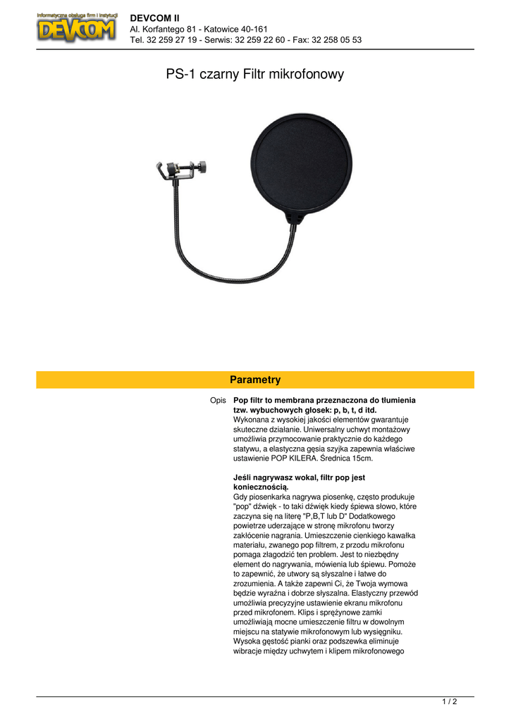DEVCOM II Al. Korfantego 81 - Katowice 40-161 Tel. 32 259 27 19 - Serwis: 32 259 22 60 - Fax: 32 258 05 53 PS-1 czarny Filtr mikrofonowy Parametry Opis Pop filtr to membrana przeznaczona do tłumienia tzw. wybuchowych głosek: p, b, t, d itd. Wykonana z wysokiej jakości elementów gwarantuje skuteczne działanie. Uniwersalny uchwyt montażowy umożliwia przymocowanie praktycznie do każdego statywu, a elastyczna gęsia szyjka zapewnia właściwe ustawienie POP KILERA. Średnica 15cm. Jeśli nagrywasz wokal, filtr pop jest koniecznością. Gdy piosenkarka nagrywa piosenkę, często produkuje "pop" dźwięk - to taki dźwięk kiedy śpiewa słowo, które zaczyna się na literę "P,B,T lub D" Dodatkowego powietrze uderzające w stronę mikrofonu tworzy zakłócenie nagrania. Umieszczenie cienkiego kawałka materiału, zwanego pop filtrem, z przodu mikrofonu pomaga złagodzić ten problem. Jest to niezbędny element do nagrywania, mówienia lub śpiewu. Pomoże to zapewnić, że utwory są słyszalne i łatwe do zrozumienia. A także zapewni Ci, że Twoja wymowa będzie wyraźna i dobrze słyszalna. Elastyczny przewód umożliwia precyzyjne ustawienie ekranu mikrofonu przed mikrofonem. Klips i sprężynowe zamki umożliwiają mocne umieszczenie filtru w dowolnym miejscu na statywie mikrofonowym lub wysięgniku. Wysoka gęstość pianki oraz podszewka eliminuje wibracje między uchwytem i klipem mikrofonowego 1/2 DEVCOM II Al. Korfantego 81 - Katowice 40-161 Tel. 32 259 27 19 - Serwis: 32 259 22 60 - Fax: 32 258 05 53 statywu. Możesz używać tego pop-filtru w domu, biurze. Nieodzowny element każdego studia. Jeśli obrócisz głowę lekko na bnok, gdy śpiewasz "P" lub "B" , filtr pop pomaga zmiękczyć dźwięki. Kolor Czarny 2/2 Powered by TCPDF (www.tcpdf.org)