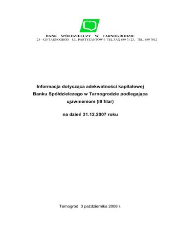BANK SPÓŁDZIELCZY W TARNOGRODZIE 23 - 420 TARNOGRÓD UL. PARTYZANTÓW 9 TEL.FAX 689 71 23, TEL. 689 7012 Informacja dotycząca adekwatności kapitałowej Banku Spółdzielczego w Tarnogrodzie podlegająca ujawnieniom (III filar) na dzień 31.12.2007 roku Tarnogród 3 października 2008 r. SPIS TREŚCI 1. Wprowadzenie...................................................................................................................... 2 1.1. Informacje ogólne o Banku .............................................................................................. 2 1.2. Podstawa sporządzenia Polityki informacyjnej .............................................................. 2 2. Informacje o zasadach zarządzania ryzykiem w Banku .................................................... 2 2.1. Ryzyko kredytowe............................................................................................................. 4 2.1.1 Zarządzanie ryzykiem kredytowym................................................................................ 4 2.1.2. Zarządzanie ryzykiem koncentracji zaangaŜowań....................................................... 8 2.1.3. Zarządzanie ryzykiem kredytowym ekspozycji zabezpieczonych hipotecznie.......... 9 2.1.4. Zarządzanie ryzykiem rezydualnym............................................................................ 10 2.1.5. Techniki redukcji ryzyka kredytowego i polityka zabezpieczeń ............................... 10 2.2. Ryzyko rynkowe .............................................................................................................. 12 2.3. Ryzyko stopy procentowej ............................................................................................. 14 2.4. Ryzyko operacyjne.......................................................................................................... 16 3. Instrumenty kapitałowe w portfelu bankowym ................................................................ 18 4. Fundusze własne ............................................................................................................... 18 4.1. Informacje podstawowe.................................................................................................. 18 4.2. Wartość księgowa funduszy .......................................................................................... 18 4.3. Struktura funduszy własnych......................................................................................... 19 5. Adekwatność kapitałowa................................................................................................... 19 5.1. Opis metody stosowanej do oceny adekwatności poziomu kapitału wewnętrznego 19 5.2. Wymóg z tytułu ryzyka kredytowego............................................................................. 20 5.3. Pozostałe wymogi kapitałowe ........................................................................................ 21 1 1. Wprowadzenie 1.1. Informacje ogólne o Banku Bank Spółdzielczy w Tarnogrodzie jest prawnym następcą powołanej w dniu 22 kwietnia 1928r. Kasy Stefczyka w Tarnogrodzie – spółdzielni z nieograniczoną odpowiedzialnością materialną członków. Od dnia 22 marca 2002 roku Bank zrzeszony jest w Banku Polskiej Spółdzielczości S.A w Warszawie. Siedziba Banku mieści się w Tarnogrodzie przy ul. Partyzantów 9. Bank wpisany jest do rejestru przedsiębiorców prowadzonego przez Sąd Rejonowy w Lublinie , XI Wydział Gospodarczy Krajowego Rejestru Sądowego pod numerem KRS 0000072735 nadanym w dniu 14 grudnia 2001 roku. Bankowi nadano w dniu 5 sierpnia 2001 roku numer statystyczny REGON: 000500582. Według stanu na 31.12.2007r. Bank zrzeszał 1.903 członków – wyłącznie osób fizycznych. Statutowa kwota udziału wynosi 100 zł. Przeciętna kwota udziału na koniec 2007r. wynosiła 259,09 zł. NajwyŜsza kwota udziału wynosi 2 400 zł. 1.2. Podstawa sporządzenia Polityki informacyjnej Niniejszy dokument stanowi realizację postanowień Polityki Informacyjnej Banku Spółdzielczego w Tarnogrodzie oraz Uchwały Nr 6/2007 Komisji Nadzoru Bankowego z dnia 13 marca 2007 r. w sprawie szczegółowych zasad i sposobu ogłaszania przez banki informacji o charakterze jakościowym i ilościowym dotyczących adekwatności kapitałowej oraz zakresu informacji podlegających ogłaszaniu. W związku ze stosowaniem w 2007 r. przez Bank § 14.1 Uchwały Nr 1/2007 KNB w zakresie kalkulacji wymogu z tytułu ryzyka kredytowego, zakres ogłaszanych za 2007 r. informacji uwzględnia specyfikę okresu przejściowego. Wysokość wymogu kapitałowego na ryzyko kredytowe wyliczana była zgodnie z dotychczasową metodologią (Bazylea I). Ponadto do całkowitego wymogu kapitałowego nie wliczano wymogu z tytułu ryzyka operacyjnego. Od dnia 01.01.2008 r. w Banku obowiązują nowe przepisy w zakresie wyliczania wymogów kapitałowych (Bazylea II) zawarte w Uchwale nr 1/2007 KNB, jak równieŜ w zakresie procesu oceny adekwatności kapitału wewnętrznego – tzw. II filar Bazylei II, zawarte w Uchwale nr 4/2007 KNB z dnia 13 marca 2007 r. 2. Informacje o zasadach zarządzania ryzykiem w Banku W Banku funkcjonuje zorganizowany proces zarządzania ryzykiem, w którym uczestniczą organy Banku, wyznaczone komitety i komórki organizacyjne oraz pracownicy. W procesie zarządzania ryzykiem, strategiczne cele określa Rada Nadzorcza, która ocenia skuteczność działań Zarządu Banku, mających na celu zapewnienie efektywności procesu 2 zarządzania ryzykiem. Struktura zarządzania ryzykiem w Banku Spółdzielczym w Tarnogrodzie. Rada Nadzorcza POZIOM NADZORCZY STRATEGICZNY Zarząd Banku POZIOM ZARZĄDCZY Komitet Zarządzania Aktywami i Pasywami oraz Komitety Kredytowe POZIOM DORADCZY Stanowisko audytu wewnętrznego POZIOM NADZORCZY OPERACYJNY Komitet Zarządzania Ryzykami i Analiz Jednostki i komórki organizacyjne Banku POZIOM WSPARCIA METODYCZNEGO I ANALITYCZNEGO POZIOM OPERACYJNY Na proces z