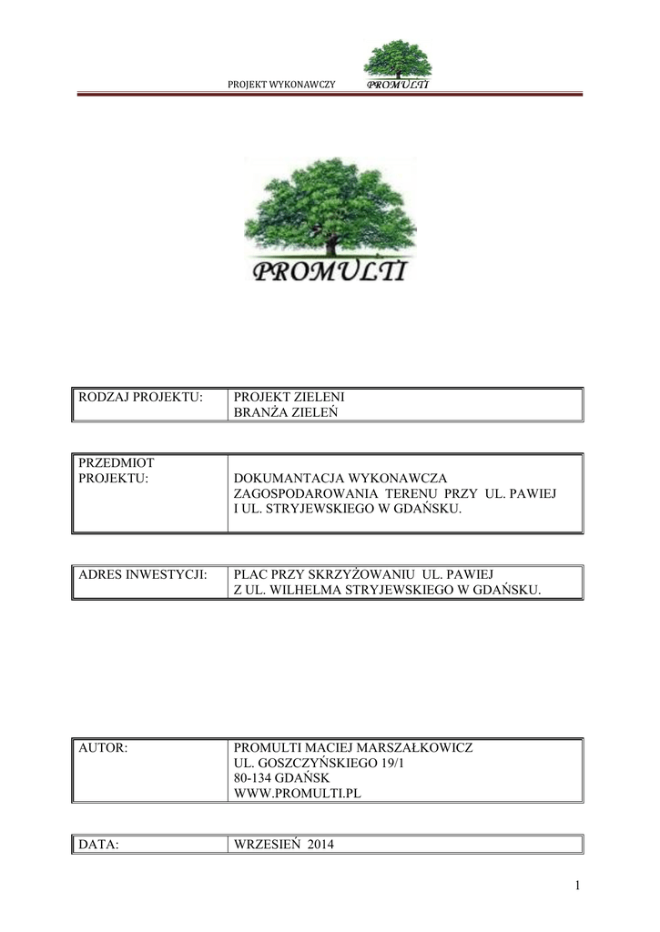 PROJEKT WYKONAWCZY RODZAJ PROJEKTU: PRZEDMIOT PROJEKTU: PROJEKT ZIELENI BRANŻA ZIELEŃ DOKUMANTACJA WYKONAWCZA ZAGOSPODAROWANIA TERENU PRZY UL. PAWIEJ I UL. STRYJEWSKIEGO W GDAŃSKU. ADRES INWESTYCJI: PLAC PRZY SKRZYŻOWANIU UL. PAWIEJ Z UL. WILHELMA STRYJEWSKIEGO W GDAŃSKU. AUTOR: PROMULTI MACIEJ MARSZAŁKOWICZ UL. GOSZCZYŃSKIEGO 19/1 80-134 GDAŃSK WWW.PROMULTI.PL DATA: WRZESIEŃ 2014 1 PROJEKT WYKONAWCZY SPIS TREŚCI: CZĘŚĆ OPISOWA LP TEMAT 1. PRZEDMIOT OPRACOWANIA 2. PODSTAWA OPRACOWANIA 3. CHARAKTERYSTYKA OBIEKTU 4. PRZEDMIAR CZĘŚĆ GRAFICZNA LP TEMAT 1. PLAC PRZY UL PAWIEJ I UL STRYJEWSKIEGO TYCZENIE 2. PLAC PRZY UL PAWIEJ I UL STRYJEWSKIEGOWIZUALIZACJE STR 3 3 4 6 NR. RYS. 01 02 2 PROJEKT WYKONAWCZY 1. PRZEDMIOT OPRACOWANIA Przedmiotem opracowania jest projekt wykonawczy zagospodarowania placu przy budynku usługowym na skrzyżowaniu ul. Pawiej z ul. Wilhelma Stryjewskiego w Gdańsku. Granice terenu przedstawia rysunek nr 01 dołączony do opracowania. Zakres opracowania obejmuje powierzchnie biologicznie czynne przeznaczone do zagospodarowania zielenią niską, tolerującą warunki miejskie oraz niewymagającej częstych prac pielęgnacyjnych. Opracowanie zieleni wzbogacono również o elementy małej architektury, trzy parkowe ławki oraz nawierzchnie utwardzoną, żwirową ozdobną i trawnik, całość projektu została przedstawiona za pomocą wizualizacji 02 oraz rysunku technicznego 01. Szczegółowy opis, zestawienie materiału roślinnego i rodzaje nawierzchni rabat znajduje się w punkcie nr. 2. oraz na rysunkach dołączonych do opracowania. Opracowanie terenu zakłada zachowanie charakteru przestrzeni publicznej. Zaprojektowana przestrzeń ma służyć pobliskim mieszkańcom za miejsce spoczynku w trakcie zakupów, spacerów, miejscem spotkań lub gromadzeniem się ludzi oraz przewidziana jest możliwość spoczynku ludzi oczekujących na tramwaj. Koncepcja projektowa posiada również rozbudowę osiedlowego parkingu. Całość terenu została zaprojektowana z myślą i z uwagami mieszkańców. 2. PODSTAWA OPRACOWANIA Opracowanie wykonano na podstawie: Materiałów dostarczonych przez Inwestora, Uzgodnień z Inwestorem, Wytycznych Inwestora, Materiały własne, Wizja lokalna. 3 PROJEKT WYKONAWCZY 3. CHARAKTERYSTYKA OBIEKTU Zakres opracowania obejmuje powierzchnie biologicznie czynną oraz miejscem parkingowym przy budynku usługowym na skrzyżowaniu ul. Pawiej z ul. Wilhelma Stryjewskiego w Gdańsku. Łączna powierzchnia przeznaczona pod zagospodarowanie ok 870,4_m2, - suma powierzchni liczona teren biologicznie czynny i miejscem parkingowym Łączna powierzchnia przeznaczona biologicznie czynna ok 460,2_m2 - charakter użytkowy (ogólnodostępny) przez mieszkańców osiedla, Łączna powierzchnia przeznaczona pod miejsca parkingowe ok 410,2_m2 - charakter użytkowy przez mieszkańców osiedla. 3.1. Ukształtowanie terenu i stan istniejący. Opracowywany teren jest płaski z licznymi studzienkami instalacji podziemnej, wodociągi, elektryka i kanalizacja. Oprócz tego na powierzchni terenu występują spore elementy betonowe. Występująca zieleń na terenie jest nieliczna, jedno kilkuletnie drzewo oraz wydeptana trawa. 3.2. Projektowane nawierzchnie i ściółki Ostatecznie na zaprojektowanym terenie przewidziano pięć rodzai nawierzchni. Nawierzchnią komunikacyjną w centrum placu jest to nawierzchnia utwardzona, dokładny materiał do uzgodnienia z Inwestorem o powierzchni ok. 189 m2. Nawierzchnia przeznaczona pod miejsca parkingowe jest zbudowana z kratki trawnikowej, która po urośnięciu trawy będzie dodatkowym elementem ozdobnym terenu ok. 382 m2. Oddzielając trawnik, części roślinnej od nawierzchni utwardzonej, części komunikacyjnej przewidziany jest 1,5 m szeroki pas żwirowy. Dodatkowo w nawierzchni żwirowej zostaną ustawione ławki oraz wzdłuż zewnętrznej linii brzegowej nasadzenia krzewów łączna powierzchnia to ok. 98,5 m2. W centralnej części nawierzchni utwardzonej zaplanowane zostały nasadzenie na nawierzchni wyłożonej ozdobną korą w kształcie okręgu o powierzchni ok. 7 m2. Ostatnią opisywaną nawierzchnią jest nawierzchnią trawiasta o łącznej powierzchni ok. 200 m2. Wszystkie rodzaje nawierzchni zostaną oddzielone od siebie obrzeżem separacyjnym, wkopany w ziemię, z równany z nawierzchnią o łącznej długości 138,5mb. 4 PROJEKT WYKONAWCZY Przed przystąpieniem do pracy należy: oczyścić teren, korytowanie ziemi rodzimej na głębokości 30cm, rozłożyć ziemię urodzajną i zagęścić, Po przeprowadzeniu wyżej wymienionych prac można przystąpić do ułożenia nawierzchni utwardzonej, rozłożenia maty pod nasadzenia aby zniwelować rozwój chwastów oraz zakładaniem trawnika metodą siewu rzutowego, ręcznego. 3.3. Materiał szkółkarski Analizę rozwiązań koncepcyjnych w zakresie doboru gatunków i ilości roślin wykonano biorąc pod uwagę następujące elementy istotne z punktu widzenia optymalizacji projektu na etapie wykonania: dostępność materiału roślinnego w czasie prac, kwestie wegetacyjne dobranych nasadzeń. możliwości techniczne wykonania nasadzeń (np. zagęszczenie), walory estetyczne przyjętych gatunków i ich ilości, Materiał szkółkarski musi być zdrowy (bez śladów porażenia przez szkodniki lub choroby), bez uszkodzeń mechanicznych, oznak przesuszenia oraz właściwie rozwinięty i jednorodny w obrębie danego gatunku i odmiany. Proporcje między częścią nadziemną a bryłą korzeniową powinny być zrównoważone. Materiał szkółkarski powinien być dobrze i równomiernie rozgałęziony oraz posiadać wygląd i cechy charakterystyczne dla danego gatunku, odmiany oraz formy pokrojowej. Tabela nasadzeń Nr. Ilość Nazwa Polska Nazwa łacińska 1. 67 Tawuła japońska Spiraea japonica ‘Goldflame’ 2. 99 Dereń biały Cornus alba ‘Elegantissima’ Uwagi 5 PROJEKT WYKONAWCZY 4. PRZEDMIAR Przedmiar projektowanego terenu Lp. 1. 2. 3. 4. 5. 67 99 Nawierzchnia