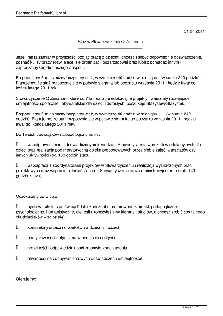 Pobrano z PlatformaKultury.pl 21.07.2011 Staż w Stowarzyszeniu Q Zmianom ____________________________ Jeżeli masz zamiar w przyszłości podjąć pracę z dziećmi, chcesz zdobyć odpowiednie doświadczenie, poznać kulisy pracy rozwijającej się organizacji pozarządowej oraz lubisz pomagać innym zapraszamy Cię do naszego Zespołu. Proponujemy 6-miesięczny bezpłatny staż, w wymiarze 40 godzin w miesiącu (w sumie 240 godzin). Planujemy, że staż rozpocznie się w połowie sierpnia lub początku września 2011 i będzie trwał do końca lutego 2011 roku. Stowarzyszenie Q Zmianom, które od 7 lat realizuje edukacyjne projekty i warsztaty rozwijające umiejętności społeczne i obywatelskie dla dzieci i dorosłych, poszukuje Stażystów/Stażystek. Proponujemy 6-miesięczny bezpłatny staż, w wymiarze 40 godzin w miesiącu (w sumie 240 godzin). Planujemy, że staż rozpocznie się w połowie sierpnia lub początku września 2011 i będzie trwał do końca lutego 2011 roku. Do Twoich obowiązków należeć będzie m. in.: ● współprowadzenie z doświadczonymi trenerkami Stowarzyszenia warsztatów edukacyjnych dla dzieci oraz realizacja pod merytoryczną opieką proponowanych przez siebie zajęć, warsztatów czy innych aktywności (ok. 100 godzin stażu) ● współpraca z koordynatorami projektów w Stowarzyszeniu i realizacja wyznaczonych prac projektowych oraz wsparcie członkiń Zarządu Stowarzyszenia oraz administracyjne prace (ok. 140 godzin stażu) Oczekujemy od Ciebie: ● bycia w trakcie studiów bądź ich ukończenie (preferowane kierunki: pedagogiczne, psychologiczne, humanistyczne, ale jeśli ukończyłeś inny kierunek studiów, a chcesz zrobić coś fajnego dla dzieciaków – zgłoś się) ● komunikatywności i otwartości na dzieci i młodzież ● pomysłowości i optymizmu w podejściu do życia ● rzetelności i odpowiedzialności za powierzone zadania ● otwartości na zdobywanie nowych doświadczeń i umiejętności! Oferujemy: strona 1 / 2 Pobrano z PlatformaKultury.pl ● możliwość rozwijania umiejętności pracy z dziećmi i młodzieżą metodami warsztatowymi ● poznanie funkcjonowania i pracy w organizacji pozarządowej, w tym także specyfiki pracy metodą projektową ● rozwój umiejętności osobistych ● zdobycie doświadczenia zawodowego ● zaświadczenie o ukończonym stażu ● możliwość dalszej współpracy, jeśli obie strony będą z niej zadowolone Szczegółowe informacje, regulamin Stażu i formularz zgłoszeń na www.qzmianom.org Zapraszamy! strona 2 / 2