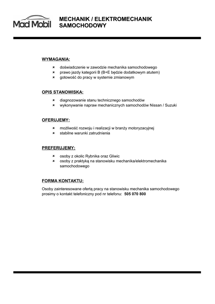 MECHANIK / ELEKTROMECHANIK SAMOCHODOWY WYMAGANIA: doświadczenie w zawodzie mechanika samochodowego prawo jazdy kategorii B (B+E będzie dodatkowym atutem) gotowość do pracy w systemie zmianowym OPIS STANOWISKA: diagnozowanie stanu technicznego samochodów wykonywanie napraw mechanicznych samochodów Nissan / Suzuki OFERUJEMY: możliwość rozwoju i realizacji w branży motoryzacyjnej stabilne warunki zatrudnienia PREFERUJEMY: osoby z okolic Rybnika oraz Gliwic osoby z praktyką na stanowisku mechanika/elektromechanika samochodowego FORMA KONTAKTU: Osoby zainteresowane ofertą pracy na stanowisku mechanika samochodowego prosimy o kontakt telefoniczny pod nr telefonu: 505 070 800 Zastrzegamy sobie prawo do odpowiedzi tylko na wybrane oferty