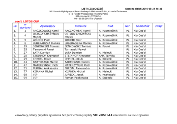 LISTA ZGŁOSZEŃ Stan na dzień 2010-08-31 18:36 9 i 10 runda Wyścigowych Samochodowych Mistrzostw Polski, 4. runda Endurance, 5 i 6 Runda Wyścigowego Pucharu Polski 5 Runda cee’d LOTOS Cup 03 – 05.09.2010 Tor „Poznań” cee’d LOTOS CUP nr Lp. Zgłaszający startowy 1. 1 RACZKOWSKI Kamil OSTOJA-CHYŻYŃSKI 2. 4 Maciej 3. 5 WÓJCIK Piotr 4. 8 LUBERADZKA Monika 5. 19 SENKOWSKI Tomasz 6. 25 Tarnawski Paweł 7. 27 ŁATA Damian 8. 28 STEINHOF Krzysztof 9. 29 CHMIEL Jakub 10. 44 BARTOSZUK Marcin 11. 47 MATERZYŃSKI Piotr 12. 55 FURGAŁ Aleksandra 13. 77 KIJANKA Michał 14. 98 VIP 15. 99 VIP Kierowca RACZKOWSKI Kamil OSTOJA-CHYŻYŃSKI Maciej WÓJCIK Piotr LUBERADZKA Monika SENKOWSKI Tomasz Tarnawski Paweł ŁATA Damian STEINHOF Krzysztof CHMIEL Jakub BARTOSZUK Marcin MATERZYŃSKI Piotr FURGAŁ Aleksandra KIJANKA Michał JURECKI Jacek Roman Popkiewicz Klub Nar. Samochód A. Rzemieślnik PL Kia Cee’d A. Rzemieślnik PL Kia Cee’d A. Rzemieślnik A. Rzemieślnik A. Polski PL PL PL PL PL PL PL PL PL PL PL PL PL Kia Kia Kia Kia Kia Kia Kia Kia Kia Kia Kia Kia Kia A. Kielecki AMK Tarnów A. Kielecki A. Rzemieślnik A. Rzemieślnik A. Rzemieślnik A. Kielecki A. Krakowski A. Sudecki Cee’d Cee’d Cee’d Cee’d Cee’d Cee’d Cee’d Cee’d Cee’d Cee’d Cee’d Cee’d Cee’d Zawodnicy, którzy przysłali zgłoszenia bez potwierdzonej wpłaty NIE ZOSTALI umieszczeni na liście zgłoszeń Uwagi LISTA ZGŁOSZEŃ Stan na dzień 2010-08-31 18:36 9 i 10 runda Wyścigowych Samochodowych Mistrzostw Polski, 4. runda Endurance, 5 i 6 Runda Wyścigowego Pucharu Polski 5 Runda cee’d LOTOS Cup 03 – 05.09.2010 Tor „Poznań” Lp . 1. 2. 3. 4. D4 do 2000 nr Zgłaszający startowy 147 MOCIE Filip 48 RUSZKOWSKI Cezary 50 BYŚKINIEWICZ Łukasz 77 RYBARCZYK Maciej D4 do 3500 nr Lp. Zgłaszający startowy 1. 44 Pachura Motorsport 2. 47 Pachura Motorsport 3. 18 Katrex Karolina Autosport D4 pow. 3500 nr Lp. Zgłaszający startowy 1. 1 Fuchs Star Moto 2. 8 ARC Bratislava 3. 75 Nostress Motorsport 4. 111 ARC Bratislava Kierowca Klub Nar. MOCIE Filip RUSZKOWSKI Cezary BYŚKINIEWICZ Łukasz RYBARCZYK Maciej A. Galicyjski A. Rzemieślnik SSS A. Wielkopolski PL PL PL PL Kierowca Klub Nar. Samochód A. Wielkopolski PL Seat Leon Supercopa A. Orski PL Seat Leon Supercopa A. Wielkopolski PL Renault Megane Klub Nar. PACHURA Sebastian WŁODARCZYK Przemysław LAMPEL-CZAPKA Karolina Kierowca STAŃCO Maciej KONOPKA Matej GAWARECKI Marcin KONOPKA Miro A. Kielecki A. Rzemieślnik PL SK PL SK Samochód Uwagi Renault Clio BMW M3 Renault Clio Skoda Octacia Samochód Ferarri F430 GT3 Porsche 997 Cup Porsche 997 GT3 Saleen SFR Zawodnicy, którzy przysłali zgłoszenia bez potwierdzonej wpłaty NIE ZOSTALI umieszczeni na liście zgłoszeń Uwagi Uwagi LISTA ZGŁOSZEŃ Stan na dzień 2010-08-31 18:36 9 i 10 runda Wyścigowych Samochodowych Mistrzostw Polski, 4. runda Endurance, 5 i 6 Runda Wyścigowego Pucharu Polski 5 Runda cee’d LOTOS Cup 03 – 05.09.2010 Tor „Poznań” Endurance Klasa 2 (do 2000) nr Lp. Zgłaszający startowy 1. 32 Strozik/Bialek 2. 34 Nostress Motorsport 3. 46 MP SPORT 4. 48 5. 50 6. 101 7. 67 Kloc/Ruszkowski Byśkiniewicz/ Głowiński Tomaszewski/ Wydra Głowiński/ Zygmunt Kierowca STROZIK Tomasz BIAŁEK Mariusz BANY Piotr KOŁAKOWSKI Sebastian MARCINKIEWICZ Jakub POTOCKI Paweł KLOC Artur RUSZKOWSKI Cezary RUSZKOWSKA-ROSŁAN Klara BYŚKINIEWICZ Łukasz TBA TOMASZEWSKI Maciej WYDRA Marcin Adam Głowiński Grzegorz Zygmunt Klub Nar. A. Rzemieślnik A. Rzemieślnik A. Rzemieślnik A. Rzemieślnik A. Polski Olsztyński Klub Rajdowy A. Rzemieślnik A. Rzemieślnik A. Rzemieślnik PL PL PL PL PL PL SSS PL PL PL PL PL PL A. A. A. A. Polski Radomski Rzemieślnik Rzemieślnik PL PL PL Samochód Alfa Romeo 156 Alfa Romeo 156 VW Jetta BMW M3 Renault Clio Alfa Romeo 156TS Alfa Romeo 156 Zawodnicy, którzy przysłali zgłoszenia bez potwierdzonej wpłaty NIE ZOSTALI umieszczeni na liście zgłoszeń Uwagi LISTA ZGŁOSZEŃ Stan na dzień 2010-08-31 18:36 9 i 10 runda Wyścigowych Samochodowych Mistrzostw Polski, 4. runda Endurance, 5 i 6 Runda Wyścigowego Pucharu Polski 5 Runda cee’d LOTOS Cup 03 – 05.09.2010 Tor „Poznań” Endurance Klasa 3 (do 3500) nr Lp. Zgłaszający startowy Katrex Karolina 1. 18 Autosport Pachura 2. 44 Motorsport Pachura 3. 47 Motorsport Endurance Klasa 4 (pow 3500) nr Lp. Zgłaszający startowy 1. 7 2. 5 3. 75 ARC Bratislava Nostress Motorsport Nostress Motorsport Kierowca LAMPEL-CZAPKA Karolina PESKOVA Michaela PACHURA Patryk PACHURA Sebastian WŁODARCZYK Przemysław LISOWSKI Mateusz Klub A. Wielkopolski A. Wielkopolski A. Wielkopolski A. Orski Kierowca STUDENIC Andy KONOPKA Miro SCARPACCIO Luis GHIZZI Fabio GAWARECKI Marcin KIWAK Marcin A. A. A. A. Nar. PL CZ PL PL PL Klub Nar. Wielkopolski Polski Rzemieślnik Rzemieślnik SK SK PL PL PL PL Samochód Uwagi Renault Megane Seat Leon Supercopa Seat Leon Supercopa Samochód Porsche GT3RSR Ferrari 360 Porsche GT3 997 Zawodnicy, którzy przysłali zgłoszenia bez potwierdzonej wpłaty NIE ZOSTALI umieszczeni na liście zgłoszeń Uwagi LISTA ZGŁOSZEŃ Stan na dzień 2010-08-31 18:36 9 i 10 runda Wyścigowych Samochodowych Mistrzostw Polski, 4. runda Endurance, 5 i 6 Runda Wyścigowego Pucharu Polski 5 Runda cee’d LOTOS Cup 03 – 05.09.2010 Tor „Poznań” WPP Klasa I nr Lp. startowy 1. 4 2. 5 3. 7 4. 8 5. 10 6. 11 7. 12 8. 14 9. 15 10. 16 11. 18 12. 20 13. 26 14. 29 15. 69 Zgłaszający KNAST Bartosz PACZKOWSKI Jakub MELLER Adrian Rallycross.pl Rallycross.pl Rallycross.pl SZLAWSKI Cezary KOWALSKI Adrian KAŹMIERCZAK Przemysław KOŁPAK Karol Rallycross.pl CHRUSZCZ Mateusz TRZECIAK Łukasz MATUSZEWSKI Wiktor KOSIŃSKI Łukasz WPP Klasa KIA Picanto nr Lp. Zgłaszający startowy STRUK Maciej 1. 63 WIŚNIEWSKI Marek 2. 70 NOWICKI Darek 3. 71 Kierowca KNAST Bartosz PACZKOWSKI Jakub MELLER Adrian RYBIENIK Bartosz WRÓBEL Konrad WYKA Karol SZLAWSKI Cezary Kowalski Adrian KAŹMIERCZAK Przemysław KOŁPAK Karol MAJEWSKI Mił