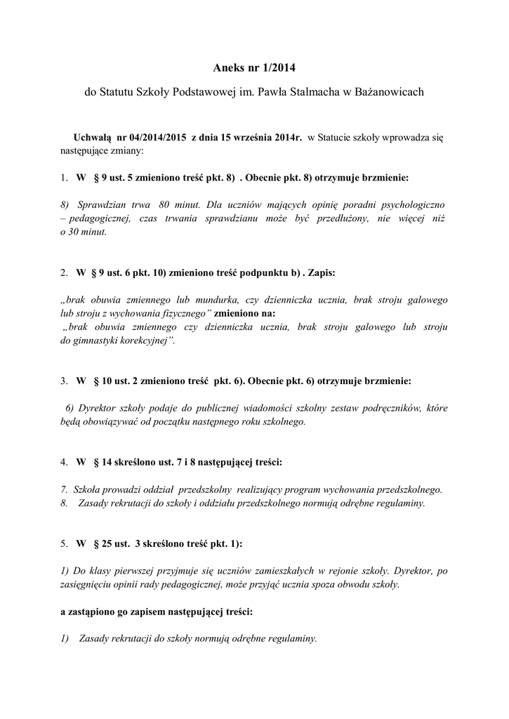 Aneks nr 1/2014 do Statutu Szkoły Podstawowej im. Pawła Stalmacha w Bażanowicach Uchwałą nr 04/2014/2015 z dnia 15 września 2014r. w Statucie szkoły wprowadza się następujące zmiany: 1. W § 9 ust. 5 zmieniono treść pkt. 8) . Obecnie pkt. 8) otrzymuje brzmienie: 8) Sprawdzian trwa 80 minut. Dla uczniów mających opinię poradni psychologiczno – pedagogicznej, czas trwania sprawdzianu może być przedłużony, nie więcej niż o 30 minut. 2. W § 9 ust. 6 pkt. 10) zmieniono treść podpunktu b) . Zapis: „brak obuwia zmiennego lub mundurka, czy dzienniczka ucznia, brak stroju galowego lub stroju z wychowania fizycznego” zmieniono na: „brak obuwia zmiennego czy dzienniczka ucznia, brak stroju galowego lub stroju do gimnastyki korekcyjnej”. 3. W § 10 ust. 2 zmieniono treść pkt. 6). Obecnie pkt. 6) otrzymuje brzmienie: 6) Dyrektor szkoły podaje do publicznej wiadomości szkolny zestaw podręczników, które będą obowiązywać od początku następnego roku szkolnego. 4. W § 14 skreślono ust. 7 i 8 następującej treści: 7. Szkoła prowadzi oddział przedszkolny realizujący program wychowania przedszkolnego. 8. Zasady rekrutacji do szkoły i oddziału przedszkolnego normują odrębne regulaminy. 5. W § 25 ust. 3 skreślono treść pkt. 1): 1) Do klasy pierwszej przyjmuje się uczniów zamieszkałych w rejonie szkoły. Dyrektor, po zasięgnięciu opinii rady pedagogicznej, może przyjąć ucznia spoza obwodu szkoły. a zastąpiono go zapisem następującej treści: 1) Zasady rekrutacji do szkoły normują odrębne regulaminy. 6. W § 26 ust. 2 zmieniono treść pkt. 9). Obecnie pkt. 9) otrzymuje brzmienie: 9) noszenia stroju galowego (biała koszula / bluzka, czarne / granatowe spodnie /spódnica).