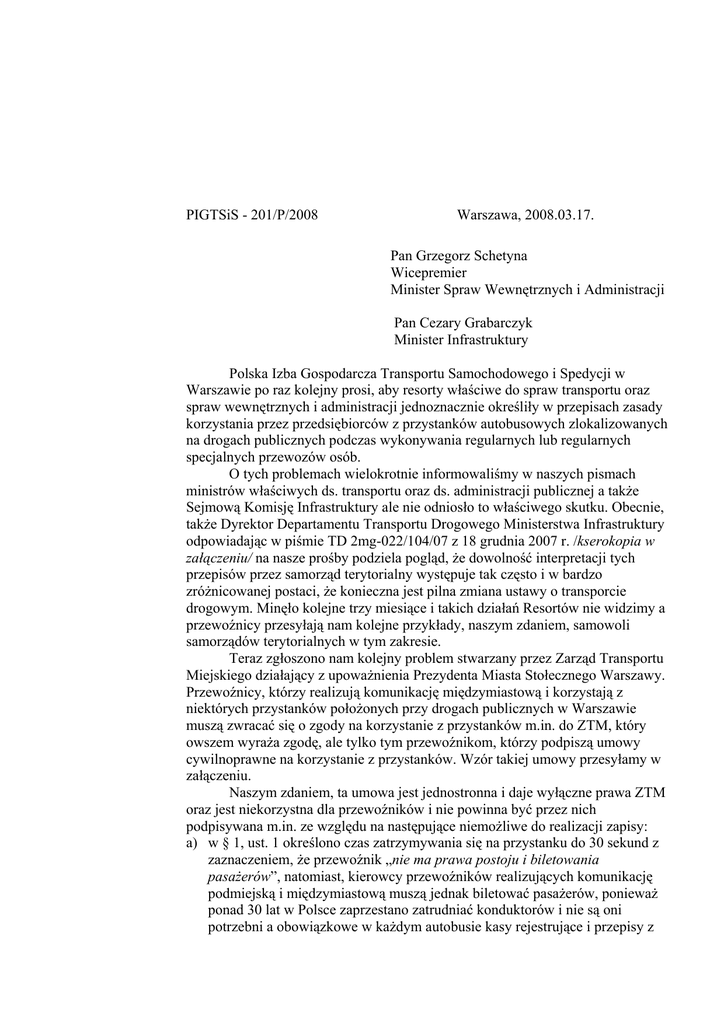 PIGTSiS - 201/P/2008 Warszawa, 2008.03.17. Pan Grzegorz Schetyna Wicepremier Minister Spraw Wewnętrznych i Administracji Pan Cezary Grabarczyk Minister Infrastruktury Polska Izba Gospodarcza Transportu Samochodowego i Spedycji w Warszawie po raz kolejny prosi, aby resorty właściwe do spraw transportu oraz spraw wewnętrznych i administracji jednoznacznie określiły w przepisach zasady korzystania przez przedsiębiorców z przystanków autobusowych zlokalizowanych na drogach publicznych podczas wykonywania regularnych lub regularnych specjalnych przewozów osób. O tych problemach wielokrotnie informowaliśmy w naszych pismach ministrów właściwych ds. transportu oraz ds. administracji publicznej a także Sejmową Komisję Infrastruktury ale nie odniosło to właściwego skutku. Obecnie, także Dyrektor Departamentu Transportu Drogowego Ministerstwa Infrastruktury odpowiadając w piśmie TD 2mg-022/104/07 z 18 grudnia 2007 r. /kserokopia w załączeniu/ na nasze prośby podziela pogląd, że dowolność interpretacji tych przepisów przez samorząd terytorialny występuje tak często i w bardzo zróżnicowanej postaci, że konieczna jest pilna zmiana ustawy o transporcie drogowym. Minęło kolejne trzy miesiące i takich działań Resortów nie widzimy a przewoźnicy przesyłają nam kolejne przykłady, naszym zdaniem, samowoli samorządów terytorialnych w tym zakresie. Teraz zgłoszono nam kolejny problem stwarzany przez Zarząd Transportu Miejskiego działający z upoważnienia Prezydenta Miasta Stołecznego Warszawy. Przewoźnicy, którzy realizują komunikację międzymiastową i korzystają z niektórych przystanków położonych przy drogach publicznych w Warszawie muszą zwracać się o zgody na korzystanie z przystanków m.in. do ZTM, który owszem wyraża zgodę, ale tylko tym przewoźnikom, którzy podpiszą umowy cywilnoprawne na korzystanie z przystanków. Wzór takiej umowy przesyłamy w załączeniu. Naszym zdaniem, ta umowa jest jednostronna i daje wyłączne prawa ZTM oraz jest niekorzystna dla przewoźników i nie powinna być przez nich podpisywana m.in. ze względu na następujące niemożliwe do realizacji zapisy: a) w § 1, ust. 1 określono czas zatrzymywania się na przystanku do 30 sekund z zaznaczeniem, że przewoźnik „nie ma prawa postoju i biletowania pasażerów”, natomiast, kierowcy przewoźników realizujących komunikację podmiejską i międzymiastową muszą jednak biletować pasażerów, ponieważ ponad 30 lat w Polsce zaprzestano zatrudniać konduktorów i nie są oni potrzebni a obowiązkowe w każdym autobusie kasy rejestrujące i przepisy z tym związane nie pozwalają odjechać z przystanku bez zarejestrowania w kasie wniesionej przez pasażera opłaty za bilet. b) w § 5 zmusza się przewoźnika do partycypacji w kosztach utrzymania czystości na przystankach na których przewoźnik się zatrzymuje, a przecież zgodnie z Prawem o ruchu drogowym przystanek jest częścią jezdni za korzystanie z której przewoźnik wnosi do różnych budżetów wiele opłat z różnych tytułów. c) w § 8 ust. 2 określono kary umowne w kwotach od 100 do 2.000 zł za 8 różnych naruszeń i zakazów, w tym za naruszenia, za które ma prawo nakładać kary Inspekcja Transportu Drogowego lub Policja. Na skargę skierowaną do Dyrektora ZTM przewoźnik otrzymał odpowiedź (pismo ZTM/PI-075-79/2-08/HK z 29 lutego 2008 r. w załączeniu) podtrzymujące w całej rozciągłości żądanie podpisania tej Umowy i zawierające ostrzeżenie, że odmowa podpisania będzie skutkować rozwiązaniem poprzedniej, w miarę korzystnej i bardziej równoprawnej Umowy, a to wiązałoby się z zaprzestaniem przewozów. W związku z powyższym konieczna jest zmiana przepisów prawa, która wyeliminuje dowolną ich interpretację przez samorządy. Pretekstem do żądania przez samorządy od przewoźników opłat za korzystanie z przystanków i stawiania przy okazji różnych warunków są niejednoznacznie interpretowane przepisy Ustawy z dnia 13 września 1996 r. o utrzymaniu czystości i porządku w gminach (t.j. Dz. U. z 2005 r. Nr 236, poz. 2008) gdzie w art. 5 w ust. 3 określono, że: „3. Uprzątnięcie i pozbycie się błota, śniegu, lodu i innych zanieczyszczeń z przystanków komunikacyjnych oraz z wydzielonych krawężnikiem lub oznakowaniem poziomym torowisk pojazdów szynowych należy do obowiązków przedsiębiorców użytkujących tereny służące komunikacji publicznej.” Zaraz po wejściu w życie Ustawy z dnia 13 września 1996 r. o utrzymaniu czystości i porządku w gminach pojawiały się wątpliwości, kto odpowiada za czystość na przystankach. Już w 1998 r. pojawiła się wykładnia Departamentu Transportu Drogowego Ministerstwa Transportu i Gospodarki Morskiej określona w piśmie l. dz. TS 4-481/30/98 z 9 marca 1998 roku /kserokopia w załączeniu/, gdzie odnosząc się do art. 5, ust. 3 tej ustawy Ministerstwo jednoznacznie prezentowało stanowisko, że przystanek autobusowy jest częścią drogi a więc przewoźnik mógłby odpowiadać za czystość wokół przystanku tylko wtedy, gdyby teren ten został mu on oddany w użytkowanie. W 1998 r. takie sytuacje jeszcze się zdarzały, ponieważ nie było tylu małych przewoźników. Obecnie, przekazanie terenu wzdłuż przystanków w użytkowanie przewoźnikowi występuje chyba tylko w tych miastach, gdzie miasto jest organizatorem komunikacji lub ma własne przedsiębiorstwo albo zakład budżetowy odpowiedzialny za realizację całości komunikacji. Natomiast na terenie kraju są tysiące przewoźników osób i nie sposób przekazać takiego terenu w użytkowanie tylko jednemu z nich. Od 1996 r. przepis art. 5 Ustawy z dnia 13 września 1996 r. o utrzymaniu czystości i porządku w gminach mają takie same brzmienie, przez 6 lat nie było problemu z porządkowaniem przystanków i realizowały to zarządy dróg a problemy zaczęły się ponownie dopiero w 2002 r. po wprowadzeniu zezwoleń na wykon