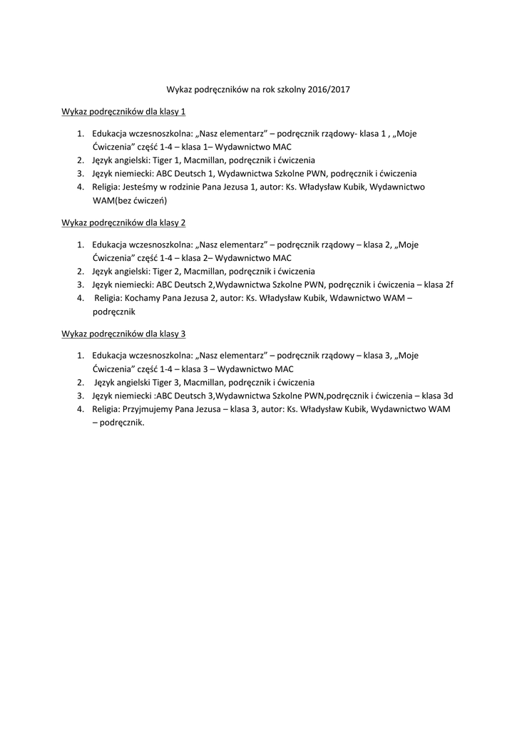 Wykaz podręczników na rok szkolny 2016/2017 Wykaz podręczników dla klasy 1 1. Edukacja wczesnoszkolna: „Nasz elementarz” – podręcznik rządowy- klasa 1 , „Moje Ćwiczenia” część 1-4 – klasa 1– Wydawnictwo MAC 2. Język angielski: Tiger 1, Macmillan, podręcznik i ćwiczenia 3. Język niemiecki: ABC Deutsch 1, Wydawnictwa Szkolne PWN, podręcznik i ćwiczenia 4. Religia: Jesteśmy w rodzinie Pana Jezusa 1, autor: Ks. Władysław Kubik, Wydawnictwo WAM(bez ćwiczeń) Wykaz podręczników dla klasy 2 1. Edukacja wczesnoszkolna: „Nasz elementarz” – podręcznik rządowy – klasa 2, „Moje Ćwiczenia” część 1-4 – klasa 2– Wydawnictwo MAC 2. Język angielski: Tiger 2, Macmillan, podręcznik i ćwiczenia 3. Język niemiecki: ABC Deutsch 2,Wydawnictwa Szkolne PWN, podręcznik i ćwiczenia – klasa 2f 4. Religia: Kochamy Pana Jezusa 2, autor: Ks. Władysław Kubik, Wdawnictwo WAM – podręcznik Wykaz podręczników dla klasy 3 1. Edukacja wczesnoszkolna: „Nasz elementarz” – podręcznik rządowy – klasa 3, „Moje Ćwiczenia” część 1-4 – klasa 3 – Wydawnictwo MAC 2. Język angielski Tiger 3, Macmillan, podręcznik i ćwiczenia 3. Język niemiecki :ABC Deutsch 3,Wydawnictwa Szkolne PWN,podręcznik i ćwiczenia – klasa 3d 4. Religia: Przyjmujemy Pana Jezusa – klasa 3, autor: Ks. Władysław Kubik, Wydawnictwo WAM – podręcznik. WYKAZ PODRĘCZNIKÓW DO KLASY CZWARTEJ Przedmiot Autor Tytuł Wydawnictwo Język polski Ewa Horwath Anita Żegleń Słowa z uśmiechem. Literatura i kultura. Nauka o języku i ortografia. WSiP Język angielski Colin Granger New Hot Spot 1 Podręcznik+ćwiczenia Macmillan Język niemiecki Anna Potapowicz Punkt. Język niemiecki kl. 4 Podręcznik+ zeszyt ćwiczeń Jerzy Chodnicki Mirosław Dąbrowski WSiP Uwagi Kupują rodzice Matematyka 2001 klasa 4 Podręcznik + ćwiczenia WSiP Przyroda Maria MarkoWorłowska Feliks Szlajfer Tajemnice przyrody klasa 4 Podręcznik + ćwiczenia Nowa Era Historia Tomasz Małkowski Historia i społeczeństwo klasa 4 Podręcznik + ćwiczenia GWO Muzyka Teresa Wójcik Muzyczny świat klasa 4 Podręcznik + ćwiczenia MAC Edukacja Plastyka Jadwiga Lukas Krystyna Onak Do dzieła Nowa Era nieobowiązkowo Zajęcia komputerowe Grażyna Koba Zajęcia komputerowe dla szkoły podstawowej IV – VI Migra Na 3 lata Zajęcia techniczne Lech Łabecki Marta Łabecka Religia Agnieszka Banasiak ks Rafał Bednarczyk Matematyka Jak to działa? (4 – 6) Zaproszeni przez Boga Nowa Era WAM Seria – Wehikuł czasu WYKAZ PODRĘCZNIKÓW DO KLASY PIĄTEJ Przedmiot Autor Tytuł Słowa z uśmiechem. Literatura i kultura. Podręcznik. kl.5 Słowa z uśmiechem. Nauka o języku i ortografia. Wydawnictwo Uwagi Język polski Ewa Horwath Anita Żegleń Język angielski Colin Granger New Hot Spot 2 podręcznik ćwiczenia Macmillan Klasa 5b – kupują rodzice Język niemiecki Anna Potapowicz Punkt. Język niemiecki kl. 5 podręcznik ćwiczenia WSiP Wydawnictwo Szkolne PWN Klasy 5a i 5c kupują rodzice Matematyka Jerzy Chodnicki Mirosław Dąbrowski Anna Bazulak Matematyka 2001 klasa 5 podręcznik zbiór zadań ćwiczenia WSiP Przyroda Janina Ślósarczyk Ryszard Kozik Feliks Szlajfer Tajemnice przyrody klasa 5 podręcznik ćwiczenia Nowa Era WSiP Historia i społeczeństwo klasa 5 podręcznik zeszyt ćwiczeń Muzyczny świat klasa V podręcznik ćwiczenia Gdańskie Wydawnictwo Oświatowe Seria – Wehikuł czasu Historia Tomasz Małkowski Muzyka Teresa Wójcik Plastyka Jadwiga Lukas Krystyna Onak Do dzieła Nowa Era nieobowiązkowo Zajęcia komputerowe Grażyna Koba Zajęcia komputerowe dla szkoły podstawowej IV – VI (kontynuacja z kl. IV) Migra nieobowiązkowo Zajęcia techniczne Lech Łabecki Marta Łabecka Jak to działa? (4 – 6) (kontynuacja z klasy IV) Nowa Era Religia Z. Marek Obdarowani przez Boga klasa 5 WAM MAC Edukacja WYKAZ PODRĘCZNIKÓW DO KLASY SZÓSTEJ L.p. 1. Przedmiot Język polski Tytuł podręcznika Słowa z uśmiechem 6 Literatura i kultura Słowa z uśmiechem 6 Nauka o języku Ortografia 6.1 i 6.2 Autor Ewa Hotwath Anita Żeleń Wydawnictwo WSiP 2. Język angielski Colin Granger Macmillan 3. Język niemiecki New Hot Spot 3 plus ćwiczenia Und so weiter 6 plus ćwiczenia Wyd. Szkolne PWN 4. Historia Lucyna Zastąpiło Ewa Krawczyń Marta Kozubska T. Małkowski 5. Matematyka M. Dąbrowski J. Chodnicki WSiP 6. 7. 8. Przyroda Technika Plastyka Nowa Era Nowa Era Nowa Era 9. Zajęcia komputerowe J. Golanko L. Łabecki J. Lukas K. Onak G. Koba 10. Muzyka T. Wójcik Mac Edukacja 11. Religia Z. Marek WAM Historia i społeczeństwo 6 plus ćwiczenia Matematyka 2001 kl. 6 plus ćwiczenia i zbiór zadań Tajemnice przyrody 6 Jak to działa dla klas 4-6 Do dzieła Zajęcia komputerowe dla szkoły podstawowej klas 4-6 Muzyczny świat kl. 6 plus ćwiczenia Przemienieni przez Boga kl. 6 GWO Migra