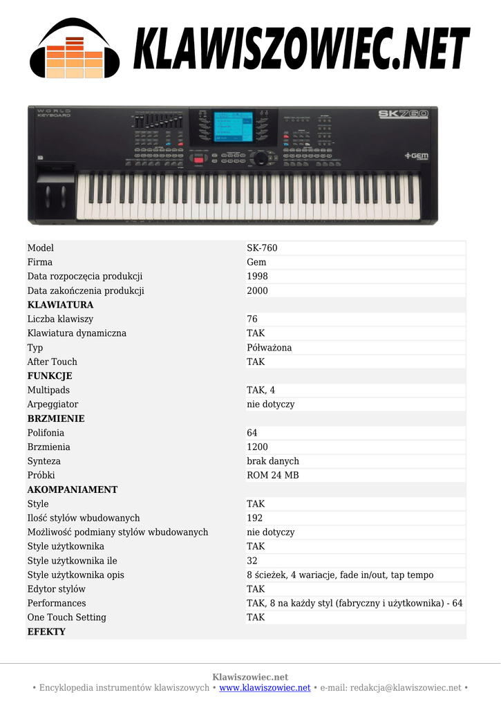 Model SK-760 Firma Gem Data rozpoczęcia produkcji 1998 Data zakończenia produkcji 2000 KLAWIATURA Liczba klawiszy 76 Klawiatura dynamiczna TAK Typ Półważona After Touch TAK FUNKCJE Multipads TAK, 4 Arpeggiator nie dotyczy BRZMIENIE Polifonia 64 Brzmienia 1200 Synteza brak danych Próbki ROM 24 MB AKOMPANIAMENT Style TAK Ilość stylów wbudowanych 192 Możliwość podmiany stylów wbudowanych nie dotyczy Style użytkownika TAK Style użytkownika ile 32 Style użytkownika opis 8 ścieżek, 4 wariacje, fade in/out, tap tempo Edytor stylów TAK Performances TAK, 8 na każdy styl (fabryczny i użytkownika) - 64 One Touch Setting TAK EFEKTY Klawiszowiec.net • Encyklopedia instrumentów klawiszowych • www.klawiszowiec.net • e-mail: [email protected] • Opis i ilość efektów 24 typu reverb, 32 modulacyjne (4 efekty jednocześnie, dodatkowo bass booster i surround 3D) SEQUENCER Sequencer TAK Pojemność sequencera 250000 nut Sequencer opis 16 utworów x 32 ścieżki, rozdzielczość 192, mikroskop KONTROLERY Ilość kontrolerów brak danych Kontrolery opis brak danych Pitch Bender TAK Modulation TAK WYŚWIETLACZ Wyświetlacz graficzny TAK Wyświetlacz rozdzielczość 320x240 Wyświetlacz tekstowy nie dotyczy Wyświetlacz textowy ilość linii/ilość znaków nie dotyczy Lyrics TAK Język wyświetlacza angielski, włoski ZŁĄCZA Zasilanie brak danych USB TO HOST nie dotyczy USB TO DEVICE nie dotyczy MIKROFON IN TAK MIDI IN TAK MIDI OUT TAK MIDI THRU TAK AUX IN TAK AUX OUT TAK LINE IN TAK LINE OUT TAK Headphones Out TAK NAGŁOŚNIENIE Głośniki nie dotyczy Moc głośników nie dotyczy PAMIĘĆ FDD TAK FDD opis 3,5" 2DD/2HD 1,44 MB Klawiszowiec.net • Encyklopedia instrumentów klawiszowych • www.klawiszowiec.net • e-mail: [email protected] • HDD TAK HDD opis max. 2GB, możliwa karta CF z przejściówką ZIP nie dotyczy ZIP opis nie dotyczy CDROM nie dotyczy Pamięć wewnętrzna 8MB - RAM+Backed RAM Pamięć opcjonalna 32 MB RAM SIMM module Czytnik kart pamięci nie dotyczy INNE Waga 22 kg Długość 1260 mm Szerokość 425 mm Grubość 140 mm Kolor CZARNY Inne interfejs SCSI, video out, vocal processor, computer host, 3x pedał, MIDI player, sampler (wave, aiff, dźwięk designer1, Akai ? kurzweil ? ) UWAGI Uwagi Klawiatura: FATAR TP9 OPIS Więcej na stronie www.klawiszowiec.net Klawiszowiec.net • Encyklopedia instrumentów klawiszowych • www.klawiszowiec.net • e-mail: [email protected] •