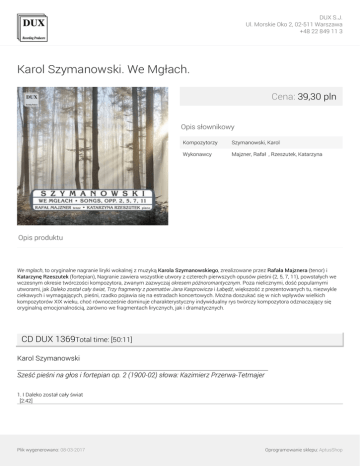 DUX S.J. Ul. Morskie Oko 2, 02-511 Warszawa +48 22 849 11 3 Karol Szymanowski. We Mgłach. Cena: 39,30 pln Opis słownikowy Kompozytorzy Szymanowski, Karol ∎ Wykonawcy Majzner, Rafał ∎, Rzeszutek, Katarzyna ∎ Opis produktu We mgłach, to oryginalne nagranie liryki wokalnej z muzyką Karola Szymanowskiego, zrealizowane przez Rafała Majznera (tenor) i Katarzynę Rzeszutek (fortepian), Nagranie zawiera wszystkie utwory z czterech pierwszych opusów pieśni (2, 5, 7, 11), powstałych we wczesnym okresie twórczości kompozytora, zwanym zazwyczaj okresem późnoromantycznym. Poza nielicznymi, dość popularnymi utworami, jak Daleko został cały świat, Trzy fragmenty z poematów Jana Kasprowicza i Łabędź, większość z prezentowanych tu, niezwykle ciekawych i wymagających, pieśni, rzadko pojawia się na estradach koncertowych. Można doszukać się w nich wpływów wielkich kompozytorów XIX wieku, choć równocześnie dominuje charakterystyczny indywidualny rys twórczy kompozytora odznaczający się oryginalną emocjonalnością, zarówno we fragmentach lirycznych, jak i dramatycznych. CD DUX 1369Total time: [50:11] Karol Szymanowski Sześć pieśni na głos i fortepian op. 2 (1900-02) słowa: Kazimierz Przerwa-Tetmajer 1. I Daleko został cały świat [2:42] Plik wygenerowano: 08-03-2017 Oprogramowanie sklepu: AptusShop DUX S.J. Ul. Morskie Oko 2, 02-511 Warszawa +48 22 849 11 3 2. II Tyś nie umarła [2:03] 3. III We mgłach [1:58] 4. IV Czasem gdy długo na pół sennie marzę [2:47] 5. V Słyszałem ciebie [2:47] 6. VI Pielgrzym [2:14] Karol Szymanowski Trzy fragmenty z poematów Jana Kasprowicza na głos i fortepian op. 5 (1902) 7. I Święty Boże [3:53] 8. II Jestem i płaczę [7:29] 9. III Moja pieśń wieczorna (Błogosławioną niech będzie ta chwila) [5:54] Karol Szymanowski Łabędź na głos i fortepian op. 7 (do słów Wacława Berenta) 10. Łabędź na głos i fortepian op. 7 | Swan for voice and piano, Op. 7 (1904) słowa | words: Tadeusz Berent [6:24] Karol Szymanowski Cztery pieśni na głos i fortepian op. 11 (1904-05), słowa: Tadeusz Miciński 11. I Tak jestem smętny Plik wygenerowano: 08-03-2017 Oprogramowanie sklepu: AptusShop DUX S.J. Ul. Morskie Oko 2, 02-511 Warszawa +48 22 849 11 3 [3:45] 12. II W zaczarowanym lesie [2:49] 13. III Nade mną leci [2:09] 14. IV Rycz burzo [3:17] Wykonawcy: Katarzyna Rzeszutek /fortepian/ Rafał Majzner /tenor/ Plik wygenerowano: 08-03-2017 Powered by TCPDF (www.tcpdf.org) Oprogramowanie sklepu: AptusShop