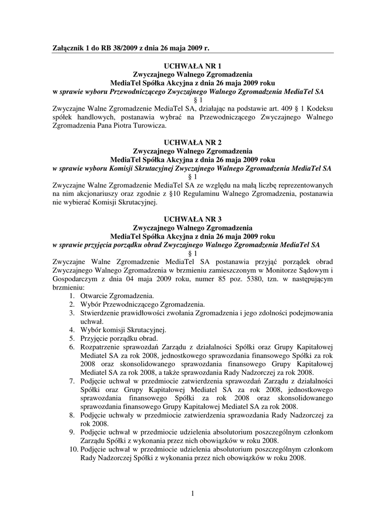 Załącznik 1 do RB 38/2009 z dnia 26 maja 2009 r. UCHWAŁA NR 1 Zwyczajnego Walnego Zgromadzenia MediaTel Spółka Akcyjna z dnia 26 maja 2009 roku w sprawie wyboru Przewodniczącego Zwyczajnego Walnego Zgromadzenia MediaTel SA §1 Zwyczajne Walne Zgromadzenie MediaTel SA, działając na podstawie art. 409 § 1 Kodeksu spółek handlowych, postanawia wybrać na Przewodniczącego Zwyczajnego Walnego Zgromadzenia Pana Piotra Turowicza. UCHWAŁA NR 2 Zwyczajnego Walnego Zgromadzenia MediaTel Spółka Akcyjna z dnia 26 maja 2009 roku w sprawie wyboru Komisji Skrutacyjnej Zwyczajnego Walnego Zgromadzenia MediaTel SA §1 Zwyczajne Walne Zgromadzenie MediaTel SA ze względu na małą liczbę reprezentowanych na nim akcjonariuszy oraz zgodnie z §10 Regulaminu Walnego Zgromadzenia, postanawia nie wybierać Komisji Skrutacyjnej. UCHWAŁA NR 3 Zwyczajnego Walnego Zgromadzenia MediaTel Spółka Akcyjna z dnia 26 maja 2009 roku w sprawie przyjęcia porządku obrad Zwyczajnego Walnego Zgromadzenia MediaTel SA §1 Zwyczajne Walne Zgromadzenie MediaTel SA postanawia przyjąć porządek obrad Zwyczajnego Walnego Zgromadzenia w brzmieniu zamieszczonym w Monitorze Sądowym i Gospodarczym z dnia 04 maja 2009 roku, numer 85 poz. 5380, tzn. w następującym brzmieniu: 1. Otwarcie Zgromadzenia. 2. Wybór Przewodniczącego Zgromadzenia. 3. Stwierdzenie prawidłowości zwołania Zgromadzenia i jego zdolności podejmowania uchwał. 4. Wybór komisji Skrutacyjnej. 5. Przyjęcie porządku obrad. 6. Rozpatrzenie sprawozdań Zarządu z działalności Spółki oraz Grupy Kapitałowej Mediatel SA za rok 2008, jednostkowego sprawozdania finansowego Spółki za rok 2008 oraz skonsolidowanego sprawozdania finansowego Grupy Kapitałowej Mediatel SA za rok 2008, a także sprawozdania Rady Nadzorczej za rok 2008. 7. Podjęcie uchwał w przedmiocie zatwierdzenia sprawozdań Zarządu z działalności Spółki oraz Grupy Kapitałowej Mediatel SA za rok 2008, jednostkowego sprawozdania finansowego Spółki za rok 2008 oraz skonsolidowanego sprawozdania finansowego Grupy Kapitałowej Mediatel SA za rok 2008. 8. Podjęcie uchwały w przedmiocie zatwierdzenia sprawozdania Rady Nadzorczej za rok 2008. 9. Podjęcie uchwał w przedmiocie udzielenia absolutorium poszczególnym członkom Zarządu Spółki z wykonania przez nich obowiązków w roku 2008. 10. Podjęcie uchwał w przedmiocie udzielenia absolutorium poszczególnym członkom Rady Nadzorczej Spółki z wykonania przez nich obowiązków w roku 2008. 1 11. Podjęcie uchwał w przedmiocie udzielenia absolutorium poszczególnym członkom Zarządu spółki przejętej przez Mediatel SA - Elterix Holding Sp. z o.o. z wykonania przez nich obowiązków od dnia 1 stycznia 2008r. do dnia połączenia z Mediatel SA. 12. Podjęcie uchwały w sprawie przeznaczenia zysku Spółki za rok 2008. 13. Podjęcie uchwały w sprawie zmiany Statutu Spółki i upoważnienia Zarządu Spółki do podwyższenia kapitału zakładowego Spółki w ramach kapitału docelowego. 14. Podjęcie uchwały w sprawie upoważnienia Rady Nadzorczej do ustalenia tekstu jednolitego Statutu Spółki. 15. Podjęcie uchwały w sprawie upoważnienia Zarządu do zawarcia z Krajowym Depozytem Papierów Wartościowych S.A. w Warszawie umowy o rejestrację akcji nowej emisji i dematerializację akcji nowej emisji oraz do podjęcia działań celem ubiegania się o dopuszczenie akcji nowej emisji do obrotu na rynku regulowanym oraz ich dematerializacji. 16. Podjęcie uchwały w sprawie wprowadzenia w Spółce zasad rachunkowości opartych na Międzynarodowych Standardach Rachunkowości. 17. Podjęcie uchwały w sprawie zatwierdzenia systemu opcji pracowniczych na akcje. 18. Podjęcie uchwały w sprawie ustalenia liczby członków Rady Nadzorczej Spółki. 19. Podjęcie uchwały w sprawie zmian w składzie Rady Nadzorczej Spółki. 20. Wolne wnioski. 21. Zamknięcie Zgromadzenia. W tym miejscu Prezes Zarządu MediaTel SA – Pan Marcin Kubit omówił wyniki przedstawione w jednostkowym sprawozdaniu finansowym Spółki za rok 2008 oraz skonsolidowanym sprawozdaniu finansowym Grupy Kapitałowej Mediatel SA za rok 2008. UCHWAŁA NR 4 Zwyczajnego Walnego Zgromadzenia MediaTel Spółka Akcyjna z dnia 26 maja 2009 roku w sprawie zatwierdzenia sprawozdania Zarządu z działalności MediaTel S.A. za rok obrotowy od dnia 1 stycznia 2008 r. do dnia 31 grudnia 2008 r. §1 Stosownie do przepisów art. 393 pkt 1) i 395 § 2 pkt 1) Kodeksu spółek handlowych oraz § 16 pkt 1 Statutu MediaTel S.A., Zwyczajne Walne Zgromadzenie MediaTel S.A. postanawia zatwierdzić sprawozdanie Zarządu z działalności Spółki za rok obrotowy od dnia 1 stycznia 2008 r. do dnia 31 grudnia 2008 r. UCHWAŁA NR 5 Zwyczajnego Walnego Zgromadzenia MediaTel Spółka Akcyjna z dnia 26 maja 2009 roku w sprawie zatwierdzenia sprawozdania Zarządu z działalności Grupy Kapitałowej MediaTel S.A. za rok obrotowy zakończony dnia 31 grudnia 2008 r. §1 Stosownie do przepisów art. 395 § 5 Kodeksu spółek handlowych, Zwyczajne Walne Zgromadzenie MediaTel S.A. postanawia zatwierdzić sprawozdanie Zarządu z działalności Grupy Kapitałowej MediaTel S.A. za rok obrotowy zakończony dnia 31 grudnia 2008 r. 2 UCHWAŁA NR 6 Zwyczajnego Walnego Zgromadzenia MediaTel Spółka Akcyjna z dnia 26 maja 2009 roku w sprawie zatwierdzenia jednostkowego sprawozdania finansowego MediaTel S.A. za rok obrotowy od dnia 1 stycznia 2008 r. do dnia 31 grudnia 2008 r. §1 Stosownie do przepisów art. 393 pkt 1) i 395 § 2 pkt 1) Kodeksu spółek handlowych oraz § 16 pkt 1 Statutu MediaTel S.A., Zwyczajne Walne Zgromadzenie MediaTel S.A. postanawia zatwierdzić jednostkowe sprawozdanie finansowe Spółki za rok obrotowy od dnia 1 stycznia 2008 r. do dnia 31 grudnia 2008 r., na które składają się w szczególności: 1) bilans sporządzony na dzień 31 grudnia 2008 r., który po stronie aktywów i pasywów wykazuje sumę: 93.315.581,05 zł (słownie: dziewięćdziesiąt trzy miliony trzys