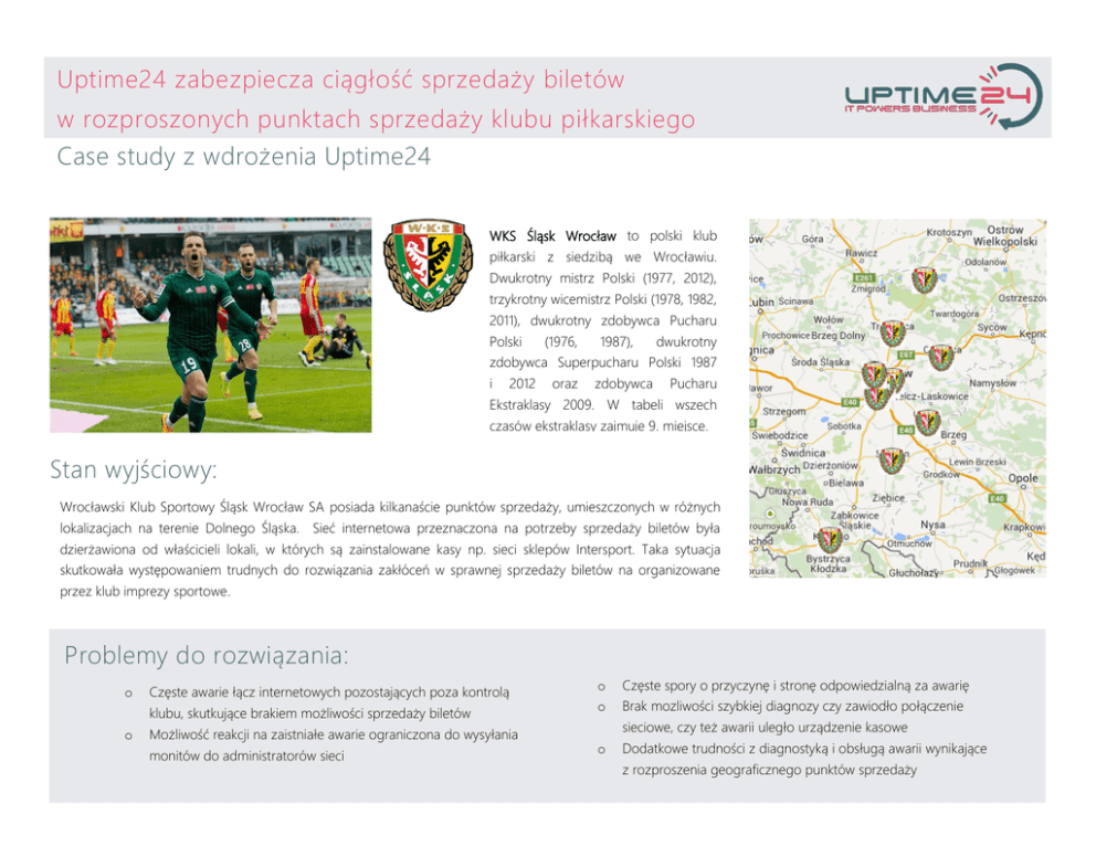 Uptime24 zabezpiecza ciągłość sprzedaży biletów w rozproszonych punktach sprzedaży klubu piłkarskiego Case study z wdrożenia Uptime24 WKS Śląsk Wrocław to polski klub piłkarski z siedzibą we Wrocławiu. Dwukrotny mistrz Polski (1977, 2012), trzykrotny wicemistrz Polski (1978, 1982, 2011), dwukrotny zdobywca Pucharu Polski (1976, 1987), dwukrotny zdobywca Superpucharu Polski 1987 i 2012 oraz zdobywca Pucharu Ekstraklasy 2009. W tabeli wszech czasów ekstraklasy zajmuje 9. miejsce. Stan wyjściowy: Wrocławski Klub Sportowy Śląsk Wrocław SA posiada kilkanaście punktów sprzedaży, umieszczonych w różnych lokalizacjach na terenie Dolnego Śląska. Sieć internetowa przeznaczona na potrzeby sprzedaży biletów była dzierżawiona od właścicieli lokali, w których są zainstalowane kasy np. sieci sklepów Intersport. Taka sytuacja skutkowała występowaniem trudnych do rozwiązania zakłóceń w sprawnej sprzedaży biletów na organizowane przez klub imprezy sportowe. Problemy do rozwiązania: o Częste awarie łącz internetowych pozostających poza kontrolą klubu, skutkujące brakiem możliwości sprzedaży biletów o Możliwość reakcji na zaistniałe awarie ograniczona do wysyłania monitów do administratorów sieci o Częste spory o przyczynę i stronę odpowiedzialną za awarię o Brak mozliwości szybkiej diagnozy czy zawiodło połączenie sieciowe, czy też awarii uległo urządzenie kasowe o Dodatkowe trudności z diagnostyką i obsługą awarii wynikające z rozproszenia geograficznego punktów sprzedaży Rozwiązanie: W celu rozwiązania zidentyfikowanych problemów i oczekiwań klubu wdrożono dedykowane rozwiązanie bazujące na autorskim systemie Uptime24 w specjalnie zaprojektowanej konfiguracji. W urządzeniach sond, zainstalowanych we wszystkich punktach kasowych i pełniących standardową rolę monitorującą, zintegrowano dodatkowe funkcje sieciowe routingu. Korzyści: Możliwość precyzyjnego wskazania strony odpowiedzialnej za awarię system jednoznacznie rozstrzyga czy winne jest niepoprawne działanie łącza internetowego dostawcy, czy też problem z działaniem sprzętu będącego własnością klubu. Integracja sieciowej funkcji routingu połączona ze standardowym wyposażeniem sondy Uptime24 w modem GSM, umożliwia stosowanie łącza GSM jako zapasowego w przypadku awarii podstawowego łącza dostawcy. W efekcie nawet podczas jego awarii, sprzedaż biletów odbywa się nieprzerwanie z wykorzystaniem łącza GSM. Łącze to powoduje również, że informacja monitoringu dostępna jest w sposób nieprzerwany, niezależnie od działania lokalnej infrastruktury sieciowej punktów kasowych. Możliwość wykorzystania sondy do przeprowadzania zdalnych akcji naprawczych spowodowała, że 80% awarii, które dotychczas wymagały pozamiejscowych wyjazdów serwisowych, obsługiwana jest zdalnie z siedziby SSK. Również w tym przypadku ma zastosowanie zapasowe łącze GSM sondy. Nawet kiedy awaria dotyczy połączeń fizycznych, serwisant jest w stanie połączyć się z urządzeniami sieciowymi, odczytać stan portów i poinstruować pracownika stanowiska kasowego o nieprawidłowo wpiętym przewodzie sieciowym. O nas: SSK SA jest polską spółka informatyczno-technologiczną. Projektujemy i wdrażamy rozwiązania z dziedziny ICT dla sektora prywatnego i publicznego w oparciu o najnowsze trendy technologii teleinformatycznych. Znaczącym elementem naszej oferty są produkty i usługi pozwalające klientom bezpiecznie prowadzić działalność, chroniąc przed potencjalnymi skutkami awarii urządzeń i systemów.