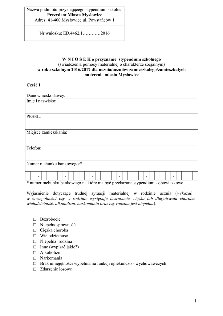 Nazwa podmiotu przyznającego stypendium szkolne: Prezydent Miasta Mysłowice Adres: 41-400 Mysłowice ul. Powstańców 1 Nr wniosku: ED.4462.1…………2016 W N I O S E K o przyznanie stypendium szkolnego (świadczenia pomocy materialnej o charakterze socjalnym) w roku szkolnym 2016/2017 dla ucznia/uczniów zamieszkałego/zamieszkałych na terenie miasta Mysłowice Część I Dane wnioskodawcy: Imię i nazwisko: PESEL: Miejsce zamieszkania: Telefon: Numer rachunku bankowego:* - - - - - - * numer rachunku bankowego na które ma być przekazane stypendium - obowiązkowe Wyjaśnienie dotyczące trudnej sytuacji materialnej w rodzinie ucznia (wskazać w szczególności czy w rodzinie występuje bezrobocie, ciężka lub długotrwała choroba, wielodzietność, alkoholizm, narkomania oraz czy rodzina jest niepełna): □ □ □ □ □ □ □ □ □ □ Bezrobocie Niepełnosprawność Ciężka choroba Wielodzietność Niepełna rodzina Inne (wypisać jakie?) Alkoholizm Narkomania Brak umiejętności wypełniania funkcji opiekuńczo - wychowawczych Zdarzenie losowe 1 Występuję z wnioskiem o przyznanie stypendium szkolnego dla: 1. Imię i nazwisko: ……..………………………………………………………………… PESEL Miejsce zamieszkania: …….. ………………………………………………………………………………………. Nazwa i adres szkoły: Klasa: ……..……………………………………………………………………………………… ……..………………………………………………………………………………………. 2. Imię i nazwisko: ……..………………………………………………………………… PESEL Miejsce zamieszkania: …….. ………………………………………………………………………………………. Nazwa i adres szkoły: Klasa: ……..……………………………………………………………………………………… ……..………………………………………………………………………………………. 3. Imię i nazwisko: ……..………………………………………………………………… PESEL Miejsce zamieszkania: …….. ………………………………………………………………………………………. Nazwa i adres szkoły: Klasa: ……..……………………………………………………………………………………… ……..………………………………………………………………………………………. 4. Imię i nazwisko: ……..………………………………………………………………… PESEL Miejsce zamieszkania: …….. ………………………………………………………………………………………. Nazwa i adres szkoły: Klasa: ……..……………………………………………………………………………………… ……..………………………………………………………………………………………. 5. Imię i nazwisko: ……..………………………………………………………………… PESEL Miejsce zamieszkania: …….. ………………………………………………………………………………………. Nazwa i adres szkoły: Klasa: ……..……………………………………………………………………………………… ……..………………………………………………………………………………………. 2 Część II 1. Dane o rodzicach i rodzinie ucznia: Imię i nazwisko matki: PESEL: miejsce zamieszkania: Imię i nazwisko ojca: PESEL: miejsce zamieszkania: 3. Oświadczenie o liczbie osób pozostających we wspólnym gospodarstwie domowym: Data Stopień Lp. Imię i nazwisko Miejsce pracy/nauki urodzenia pokrewieństwa 1. 2. 3. 4. 5. 6. 7. 8. 9. 10. 11. 4. Źródła dochodu netto w rodzinie z miesiąca poprzedzającego złożenie wniosku (do oświadczenia należy dołączyć odrębne zaświadczenia o dochodach dla każdej osoby wymienionej w pkt. 3): Lp. Rodzaj dochodu Kwota 1. Wynagrodzenie za pracę (łączna kwota) 2. Świadczenia rodzinne 3. 4. Emerytury, renty inwalidzkie i rodzinne, w tym również zagraniczne, świadczenia przedemerytalne Stałe lub okresowe zasiłki z pomocy społecznej 5. Dodatek mieszkaniowy 6. Alimenty i świadczenia alimentacyjne 7. Zasiłek dla bezrobotnych 8. Dochody z gospodarstwa rolnego 9. Dochody z działalności gospodarczej 3 10. Pobierane stypendia o charakterze socjalnym ze środków publicznych (miesięczna wartość stypendium pobieranego przez członka rodziny) 11. Inne dochody DOCHÓD RAZEM Średni dochód miesięczny netto na jedną osobę w rodzinie 5. W załączeniu przedkładam odpowiednie dokumenty potwierdzające dochody rodziny: 1. Zaświadczenie o zarobkach w ilości ...........................; 2. Zaświadczenie o korzystaniu ze świadczeń pieniężnych z pomocy społecznej; 3. Zaświadczenie o korzystaniu ze świadczeń rodzinnych; 4. Kserokopie decyzji w sprawie przyznania dodatku mieszkaniowego; 5. Kserokopie wyroku rozwodowego bądź przyznającego alimenty; 6. Zaświadczenie o zarejestrowaniu w Powiatowym Urzędzie Pracy; 7. Zaświadczenie ze szkoły potwierdzające uczęszczanie dziecka do szkoły 6. Wnioskowana forma pomocy materialnej: 1. podręczniki, zeszyty, słowniki, encyklopedie, atlasy, tablice matematyczne, lektury szkolne, 2. tornister, plecak szkolny, 3. obuwie sportowe i strój na W-F, 4. przybory do nauki zawodu, 5. piórnik, artykuły szkolne (np. bloki, kredki, pędzle, klej, flamastry, papier kolorowy, ołówki, długopisy, pióra, gumki, temperówki, bibuła, nożyczki, kalkulatory, brystol, papier kancelaryjny, taśma klejąca, korektory, przybory geometryczne, plastelina, modelina) 6. tusze do drukarek, pokrycie kosztów abonamentu internetowego (od września do czerwca), multimedial