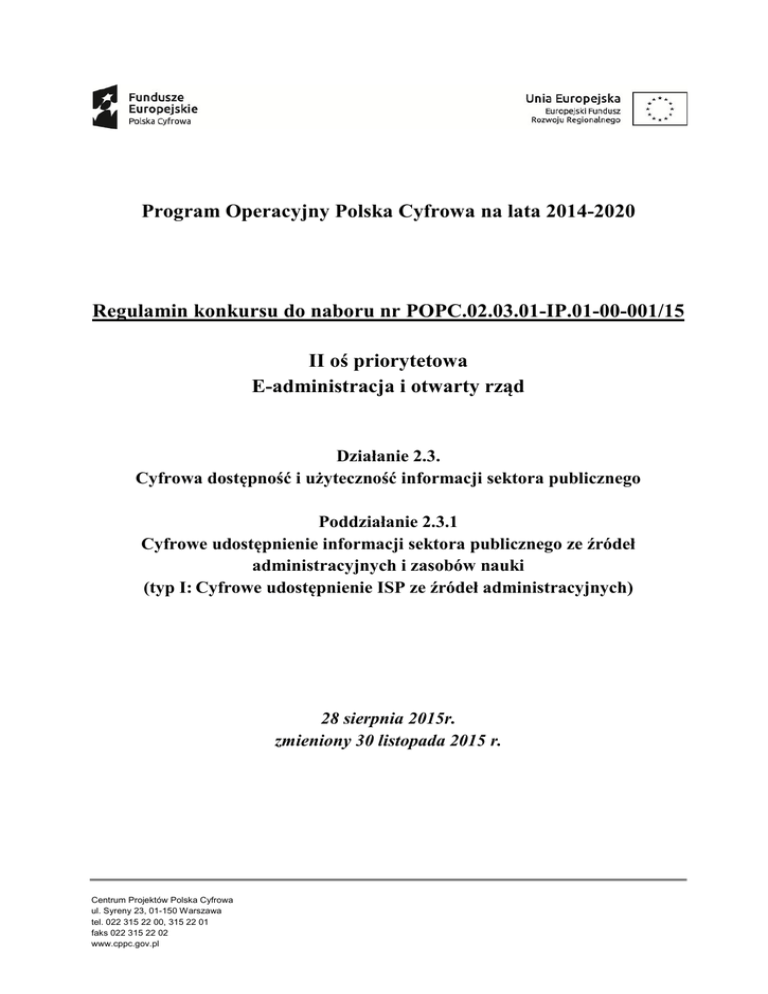 Program Operacyjny Polska Cyfrowa na lata 2014-2020 Regulamin konkursu do naboru nr POPC.02.03.01-IP.01-00-001/15 II oś priorytetowa E-administracja i otwarty rząd Działanie 2.3. Cyfrowa dostępność i użyteczność informacji sektora publicznego Poddziałanie 2.3.1 Cyfrowe udostępnienie informacji sektora publicznego ze źródeł administracyjnych i zasobów nauki (typ I: Cyfrowe udostępnienie ISP ze źródeł administracyjnych) 28 sierpnia 2015r. zmieniony 30 listopada 2015 r. Centrum Projektów Polska Cyfrowa ul. Syreny 23, 01-150 Warszawa tel. 022 315 22 00, 315 22 01 faks 022 315 22 02 www.cppc.gov.pl Spis treści: Wykaz skrótów i pojęć specjalistycznych 1. Podstawy prawne 2. Postanowienia ogólne 3. Warunki uczestnictwa 4. Zasady finansowania projektów 5. Zasady ubiegania się o wsparcie 6. Zasady dokonywania oceny wniosków o dofinansowanie 7. Informacja o przyznaniu dofinansowania 8. Procedura odwoławcza 9. Postanowienia końcowe Załączniki do Regulaminu konkursu 2 Wykaz skrótów i pojęć specjalistycznych: IOK – Instytucja Organizująca Konkurs IZ POPC – Instytucja Zarządzająca Programem Operacyjnym Polska Cyfrowa na lata 2014-2020 IP POPC– Instytucja Pośrednicząca w zarządzaniu PO PC (CPPC) KOP – Komisja Oceny Projektów POPC – Program Operacyjny Polska Cyfrowa na lata 2014-2020 portal – portal internetowy, o którym mowa w art. 115 ust. 1 lit. b rozporządzenia Parlamentu Europejskiego i Rady nr 1303/2014 z dnia 17 grudnia 2013 r. SZOOP – Szczegółowy opis osi priorytetowych Programu Operacyjnego Polska Cyfrowa na lata 2014-2020 Projekt – przedsięwzięcie realizowane w ramach programu operacyjnego na podstawie porozumienia/umowy o dofinansowanie ze środków UE w ramach POPC, zawieranej między beneficjentem a Instytucja Pośredniczącą Partner – należy przez to rozumieć, podmiot w rozumieniu art. 33. ustawy, o której mowa w § 1, ust. 2, lit. c niniejszego Regulaminu konkursu, który jest wymieniony w zatwierdzonym wniosku o dofinansowanie projektu, realizujący wspólnie z beneficjentem (i ewentualnie innymi partnerami) projekt na warunkach określonych w umowie o dofinansowanie i porozumieniu albo umowie o partnerstwie i wnoszący do projektu zasoby ludzkie, organizacyjne, techniczne lub finansowe. CPPC – Centrum Projektów Polska Cyfrowa 3 §1 Podstawy prawne 1. W celu wyłonienia Projektów organizowany jest konkurs. 2. Konkurs jest organizowany w oparciu o następujące akty prawne: a. Rozporządzenie Parlamentu Europejskiego i Rady (UE) Nr 1303/2013 z dnia 17 grudnia 2013 r. ustanawiające wspólne przepisy dotyczące Europejskiego Funduszu Rozwoju Regionalnego, Europejskiego Funduszu Społecznego, Funduszu Spójności, Europejskiego Funduszu Rolnego na rzecz Rozwoju Obszarów Wiejskich oraz Europejskiego Funduszu Morskiego i Rybackiego oraz ustanawiające przepisy ogólne dotyczące Europejskiego Funduszu Rozwoju Regionalnego, Europejskiego Funduszu Społecznego, Funduszu Spójności i Europejskiego Funduszu Morskiego i Rybackiego oraz uchylające rozporządzenie Rady (WE) nr 1083/2006; b. Rozporządzenie Parlamentu Europejskiego i Rady (UE) Nr 1301/2013 z dnia 17 grudnia 2013 r. w sprawie Europejskiego Funduszu Rozwoju Regionalnego i przepisów szczególnych dotyczących celu „Inwestycje na rzecz wzrostu i zatrudnienia” oraz w sprawie uchylenia rozporządzenia (WE) nr 1080/2006; c. Ustawa z dnia 11 lipca 2014 r. o zasadach realizacji programów w zakresie polityki spójności finansowanych w perspektywie finansowej 2014-2020; d. Program Operacyjny Polska Cyfrowa na lata 2014-2020, przyjęty decyzją Komisji Europejskiej z dnia 5 grudnia 2014 r. §2 Postanowienia ogólne 1. 2. 3. 4. 5. Instytucją Organizującą Konkurs (IOK) jest Centrum Projektów Polska Cyfrowa, adres: ul. Syreny 23, 01-150 Warszawa. Przedmiotem konkursu jest wyłonienie projektów, które w największym stopniu przyczynią się do osiągnięcia celu szczegółowego 4 Cyfrowa dostępność i użyteczność informacji sektora publicznego Programu Operacyjnego Polska Cyfrowa na lata 2014-2020. Cel ten będzie realizowany w II osi priorytetowej E-administracja i otwarty rząd, poprzez działanie 2.3 Cyfrowa dostępność i użyteczność informacji sektora publicznego, poddziałanie 2.3.1 Cyfrowe udostepnienie informacji sektora publicznego ze źródeł administracyjnych i zasobów nauki. W ramach niniejszego konkursu dopuszcza się jeden typ projektu, tj. Typ I: cyfrowe udostępnienie ISP ze źródeł administracyjnych, zdefiniowany w SZOOP. Kwota środków z Europejskiego Funduszu Rozwoju Regionalnego przeznaczonych na dofinansowanie projektów w niniejszym konkursie wynosi 99 863 400,00 zł (słownie: dziewięćdziesiąt dziewięć milionów osiemset sześćdziesiąt trzy tysiące czterysta złotych i 00/100) oraz 18 136 600,00 zł (słownie: osiemnaście milionów sto trzydzieści sześć tysięcy sześćset złotych i 00/100) współfinansowania krajowego z budżetu państwa. Konkurs przeprowadzany jest jawnie z zapewnieniem publicznego dostępu do informacji o zasadach jego przeprowadzania oraz do list projektów ocenionych w poszczególnych etapach oceny i listy projektów wybranych do dofinansowania. Wszelkie terminy realizacji określonych czynności wskazane w niniejszym Regulaminie konkursu zwanym dalej Regulaminem, jeśli nie określono inaczej, wyrażone są w dniach kalendarzowych, 4 liczone są zgodnie z art 57 ustawy z dnia 14 czerwca 1960 r. Kodeks postępowania administracyjnego (tekst jednolity Dz. U. z 2013 r., poz. 267 z późn. zm.: dalej „Kpa”). Jeżeli koniec terminu przypada na dzień ustawowo wolny od pracy, za ostatni dzień terminu uważa się najbliższy następny dzień powszedni. Wyjaśnień w kwestiach dotyczących konkursu udziela IOK w odpowiedzi na zapytania kierowane na adres poczty elektronicznej: [email protected]. Wyjaśnienia o charakterze ogólnym publikowane są na stronie internetowej IOK. 6. W zakresie d