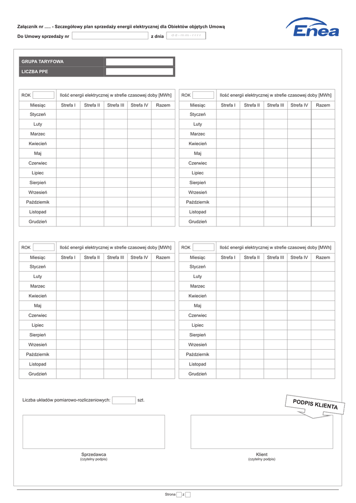 Załącznik nr ..... - Szczegółowy plan sprzedaży energii elektrycznej dla Obiektów objętych Umową Do Umowy sprzedaży nr z dnia dd-mm-rrrr GRUPA TARYFOWA LICZBA PPE Ilość energii elektrycznej w strefie czasowej doby [MWh] ROK Miesiąc Strefa I Strefa II Strefa III Strefa IV Ilość energii elektrycznej w strefie czasowej doby [MWh] ROK Razem Miesiąc Styczeń Styczeń Luty Luty Marzec Marzec Kwiecień Kwiecień Maj Maj Czerwiec Czerwiec Lipiec Lipiec Sierpień Sierpień Wrzesień Wrzesień Październik Październik Listopad Listopad Grudzień Grudzień Ilość energii elektrycznej w strefie czasowej doby [MWh] ROK Miesiąc Strefa I Strefa II Strefa III Strefa IV Miesiąc Styczeń Styczeń Luty Luty Marzec Marzec Kwiecień Kwiecień Maj Maj Czerwiec Czerwiec Lipiec Lipiec Sierpień Sierpień Wrzesień Wrzesień Październik Październik Listopad Listopad Grudzień Grudzień Liczba układów pomiarowo-rozliczeniowych: Strefa II Strefa III Strefa IV Strefa I Strefa II Strefa III szt. Strefa IV PODPIS Sprzedawca Klient (czytelny podpis) (czytelny podpis) Strona z Razem Ilość energii elektrycznej w strefie czasowej doby [MWh] ROK Razem Strefa I Razem KLIENTA