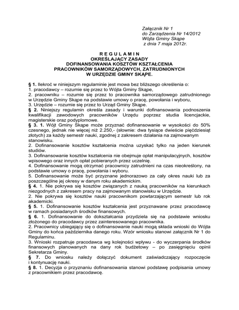 Załącznik Nr 1 do Zarządzenia Nr 14/2012 Wójta Gminy Skąpe z dnia 7 maja 2012r. REGULAMIN OKREŚLAJĄCY ZASADY DOFINANSOWANIA KOSZTÓW KSZTAŁCENIA PRACOWNIKÓW SAMORZĄDOWYCH, ZATRUDNIONYCH W URZĘDZIE GMINY SKĄPE. § 1. Ilekroć w niniejszym regulaminie jest mowa bez bliższego określenia o: 1. pracodawcy – rozumie się przez to Wójta Gminy Skąpe, 2. pracowniku – rozumie się przez to pracownika samorządowego zatrudnionego w Urzędzie Gminy Skąpe na podstawie umowy o pracę, powołania i wyboru, 3. Urzędzie – rozumie się przez to Urząd Gminy Skąpe. § 2. Niniejszy regulamin określa zasady i warunki dofinansowania podnoszenia kwalifikacji zawodowych pracowników Urzędu poprzez studia licencjackie, magisterskie oraz podyplomowe. § 3. 1. Wójt Gminy Skąpe może przyznać dofinansowanie w wysokości do 50% czesnego, jednak nie więcej niż 2.250,- (słownie: dwa tysiące dwieście pięćdziesiąt złotych) za każdy semestr nauki, zgodnej z zakresem działania na zajmowanym stanowisku. 2. Dofinansowanie kosztów kształcenia można uzyskać tylko na jeden kierunek studiów. 3. Dofinansowanie kosztów kształcenia nie obejmuje opłat manipulacyjnych, kosztów wpisowego oraz innych opłat pobieranych przez uczelnię. 4. Dofinansowanie mogą otrzymać pracownicy zatrudnieni na czas nieokreślony, na podstawie umowy o pracę, powołania i wyboru. 5. Dofinansowanie może być przyznane jednorazowo za cały okres nauki lub za poszczególne jej okresy w danym roku akademickim. § 4. 1. Nie pokrywa się kosztów związanych z nauką pracowników na kierunkach niezgodnych z zakresem pracy na zajmowanym stanowisku w Urzędzie. 2. Nie pokrywa się kosztów nauki pracownikom powtarzającym semestr lub rok akademicki. § 5. 1. Dofinansowanie kosztów kształcenia jest przyznawane przez pracodawcę w ramach posiadanych środków finansowych. § 6. 1. Dofinansowanie do dokształcania przydziela się na podstawie wniosku złożonego do pracodawcy przez zainteresowanego pracownika. 2. Pracownicy ubiegający się o dofinansowanie nauki mogą składa wnioski do Wójta Gminy do końca października danego roku. Wzór wniosku stanowi załącznik Nr 1 do Regulaminu. 3. Wnioski rozpatruje pracodawca wg kolejności wpływu - do wyczerpania środków finansowych planowanych na dany rok budżetowy – po zasięgnięciu opinii Sekretarza Gminy. § 7. Do wniosku należy dołączyć dokument zaświadczający rozpoczęcie i kontynuację nauki. § 8. 1. Decyzja o przyznaniu dofinansowania stanowi podstawę podpisania umowy z pracownikiem przez pracodawcę. 2. Z każdą osobą otrzymującą dofinansowanie zawierana jest umowa określająca wzajemne zobowiązania pracodawcy i pracownika. Wzór umowy stanowi załącznik Nr 2 do Regulaminu. 3. Odmowa zawarcia umowy traktowana będzie jednoznacznie jako rezygnacja z ubiegania się do dofinansowanie. 4. Podpisanie umowy o dofinansowaniu skutkuje nabyciem praw do dofinansowania na czas trwania nauki z uwzględnieniem § 4 pkt 2 w kolejnych latach budżetowych. § 9. 1. Dofinansowanie odbywa się wyłącznie na podstawie przedstawionych oryginalnych dowodów wpłat czesnego. 2. Pracodawca zrefunduje poniesione koszty w ciągu 1 miesiąca po przedłożeniu dowodów wpłat za czesne. 3. Jeżeli czesne wpłacane jest w ratach miesięcznych o dofinansowanie można ubiegać się po upływie jednego semestru – na zasadzie refundacji. § 10. Osoba korzystająca z dofinansowania na dokształcanie, która przedłożyła sfałszowany dokument lub w inny sposób świadomie i celowo wprowadziła Urząd w błąd zobowiązana jest do zwrotu wypłaconych środków w terminie 10 dni, z należnymi odsetkami określonymi odrębnymi przepisami i traci bezpowrotnie prawo do korzystania z dofinansowania na dokształcanie. § 11. 1. Pracownik, któremu nie przydzielono dofinansowania do dokształcania ma prawo złożyć odwołanie do pracodawcy w terminie do 14 dni od dnia uzyskania informacji o negatywnym rozpatrzeniu wniosku. 2. Pracodawca rozpatruje odwołanie w obecności osoby wnioskującej w terminie 14 dni od daty wpływu ponownego wniosku. 3. W przypadku negatywnie rozpatrzonego wniosku, osobie zainteresowanej należy przedłożyć decyzję wraz z uzasadnieniem (decyzja ta nie stanowi decyzji, do której mają zastosowanie przepisy kpa). § 12. Zmian w regulaminie dokonuje się w trybie właściwym do jego ustalenia. § 13. Regulamin wchodzi w życie z dniem podjęcia. Załącznik Nr 1 do Regulaminu WNIOSEK O DOFINANSOWANIE KOSZTÓW DOKSZTAŁCANIA I. Wypełnia Wnioskodawca Imię i Nazwisko ………………………………………………………………………………………………… w Urzędzie Gminy Pracuję od ………………………………………………………………………………………………… ostatnio na stanowisku ………………………………………………………………………………………………… Wnioskuję o przyznanie dofinansowania ………………………………………………………………………………………………… ………………………………………………………………………………………………… Informacje na temat formy dokształcania (nazwa uczelni, rodzaj i okres dokształcania, data rozpoczęcia i zakończenia studiów, wysokość odpłatności za semestr) ………………………………………………………………………………………………..… ………………………………………………………………………………………………… ………………………………………………………………………………………………… ………………………………………………………………………………………………… Uzasadnienie wniosku: ………………………………………………………………………………………………
