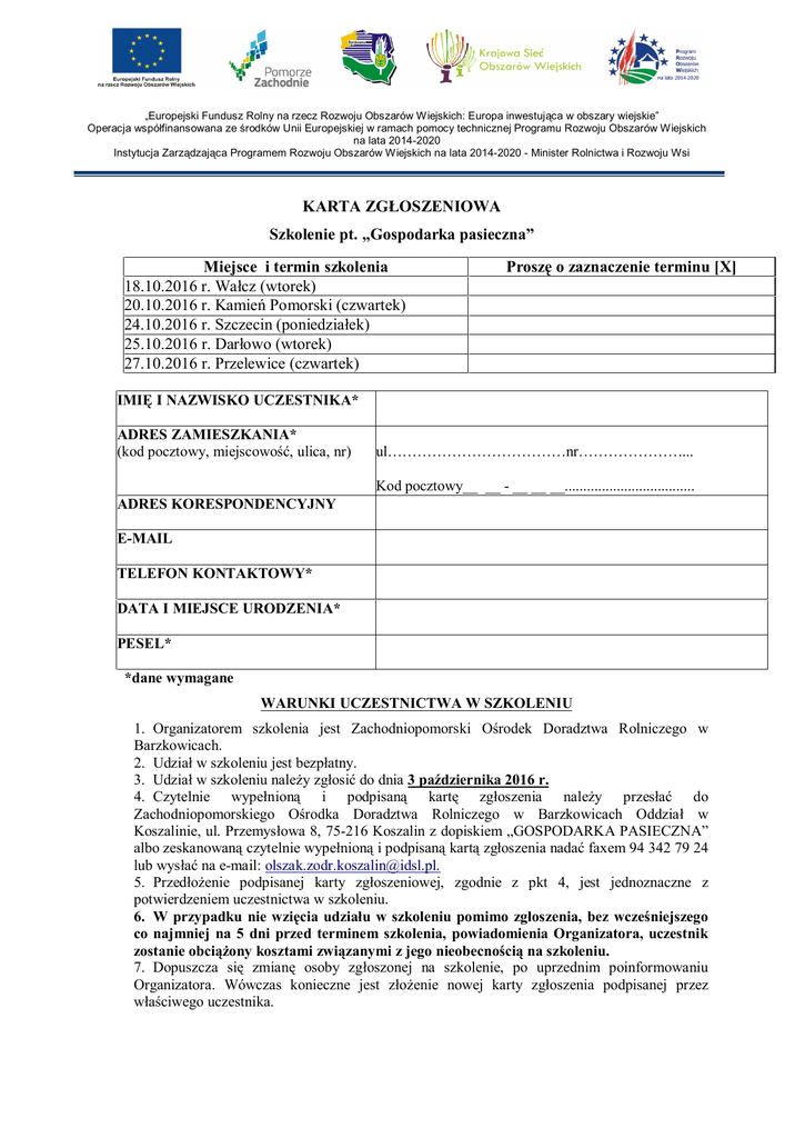 „Europejski Fundusz Rolny na rzecz Rozwoju Obszarów Wiejskich: Europa inwestuj ca w obszary wiejskie” Operacja wspó finansowana ze rodków Unii Europejskiej w ramach pomocy technicznej Programu Rozwoju Obszarów Wiejskich na lata 2014-2020 Instytucja Zarz dzaj ca Programem Rozwoju Obszarów Wiejskich na lata 2014-2020 - Minister Rolnictwa i Rozwoju Wsi KARTA ZG OSZENIOWA Szkolenie pt. „Gospodarka pasieczna” Miejsce i termin szkolenia 18.10.2016 r. Wa cz (wtorek) 20.10.2016 r. Kamie Pomorski (czwartek) 24.10.2016 r. Szczecin (poniedzia ek) 25.10.2016 r. Dar owo (wtorek) 27.10.2016 r. Przelewice (czwartek) Prosz o zaznaczenie terminu [X] IMI I NAZWISKO UCZESTNIKA* ADRES ZAMIESZKANIA* (kod pocztowy, miejscowo , ulica, nr) ul………………………………nr…………………... Kod pocztowy__ __ - __ __ __................................... ADRES KORESPONDENCYJNY E-MAIL TELEFON KONTAKTOWY* DATA I MIEJSCE URODZENIA* PESEL* *dane wymagane WARUNKI UCZESTNICTWA W SZKOLENIU 1. Organizatorem szkolenia jest Zachodniopomorski O rodek Doradztwa Rolniczego w Barzkowicach. 2. Udzia w szkoleniu jest bezp atny. 3. Udzia w szkoleniu nale y zg osi do dnia 3 pa dziernika 2016 r. 4. Czytelnie wype nion i podpisan kart zg oszenia nale y przes do Zachodniopomorskiego O rodka Doradztwa Rolniczego w Barzkowicach Oddzia w Koszalinie, ul. Przemys owa 8, 75-216 Koszalin z dopiskiem „GOSPODARKA PASIECZNA” albo zeskanowan czytelnie wype nion i podpisan kart zg oszenia nada faxem 94 342 79 24 lub wys na e-mail: [email protected]. 5. Przed enie podpisanej karty zg oszeniowej, zgodnie z pkt 4, jest jednoznaczne z potwierdzeniem uczestnictwa w szkoleniu. 6. W przypadku nie wzi cia udzia u w szkoleniu pomimo zg oszenia, bez wcze niejszego co najmniej na 5 dni przed terminem szkolenia, powiadomienia Organizatora, uczestnik zostanie obci ony kosztami zwi zanymi z jego nieobecno ci na szkoleniu. 7. Dopuszcza si zmian osoby zg oszonej na szkolenie, po uprzednim poinformowaniu Organizatora. Wówczas konieczne jest z enie nowej karty zg oszenia podpisanej przez ciwego uczestnika. „Europejski Fundusz Rolny na rzecz Rozwoju Obszarów Wiejskich: Europa inwestuj ca w obszary wiejskie” Operacja wspó finansowana ze rodków Unii Europejskiej w ramach pomocy technicznej Programu Rozwoju Obszarów Wiejskich na lata 2014-2020 Instytucja Zarz dzaj ca Programem Rozwoju Obszarów Wiejskich na lata 2014-2020 - Minister Rolnictwa i Rozwoju Wsi wiadczenie uczestnika: 1. Zapozna em si z Warunkami uczestnictwa w szkoleniu i je w ca ci akceptuj . 2. Wyra am zgod na przetwarzanie moich danych osobowych zawartych w niniejszej Karcie zg oszeniowej, w celach zwi zanych z niniejszym szkoleniem, zgodnie z Ustaw z dnia 29 sierpnia 1997 roku o ochronie danych osobowych (t.j. Dz. U. z 2016 r. poz. 922). 3. Wyra am zgod na publikacj fotografii z moim wizerunkiem w celach zwi zanych z niniejszym szkoleniem. ………..……………………………………. (data i czytelny podpis uczestnika)