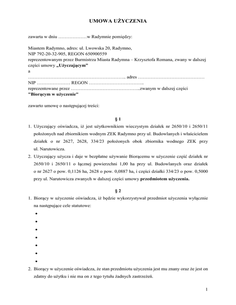 UMOWA UŻYCZENIA zawarta w dniu ………………w Radymnie pomiędzy: Miastem Radymno, adres: ul. Lwowska 20, Radymno, NIP 792-20-32-905, REGON 650900559 reprezentowanym przez Burmistrza Miasta Radymna – Krzysztofa Romana, zwany w dalszej części umowy „Użyczającym” a …………………………………………………….. adres …………………………………… NIP ………………… REGON …………………………….. reprezentowane przez ……………………………………..zwanym w dalszej części "Biorącym w użyczenie" zawarto umowę o następującej treści: §1 1. Użyczający oświadcza, iż jest użytkownikiem wieczystym działek nr 2650/10 i 2650/11 położonych nad zbiornikiem wodnym ZEK Radymno przy ul. Budowlanych i właścicielem działek o nr 2627, 2628, 334/23 położonych obok zbiornika wodnego ZEK przy ul. Narutowicza. 2. Użyczający użycza i daje w bezpłatne używanie Biorącemu w użyczenie część działek nr 2650/10 i 2650/11 o łącznej powierzchni 1,00 ha przy ul. Budowlanych oraz działek o nr 2627 o pow. 0,1126 ha, 2628 o pow. 0,0887 ha, i części działki 334/23 o pow. 0,5000 przy ul. Narutowicza zwanych w dalszej części umowy przedmiotem użyczenia. §2 1. Biorący w użyczenie oświadcza, iż będzie wykorzystywał przedmiot użyczenia wyłącznie na następujące cele statutowe: • • • • • • • 2. Biorący w użyczenie oświadcza, że stan przedmiotu użyczenia jest mu znany oraz że jest on zdatny do użytku i nie ma on z tego tytułu żadnych zastrzeżeń. 1 §3 1. Biorącemu w użyczenie przysługuję prawo korzystania: a) z gruntu stanowiący przedmiot użyczenia niniejszej umowy, b) z terenów parkingowych znajdujących się przy plażach zbiornika wodnego ZEK Radymno i pobierania opłat parkingowych. 2. Biorący w użyczenie oświadcza, iż: a) utrzyma porządek i czystość na użyczonym terenie oraz terenach określonych w złączniku graficznym nr 1 do niniejszej umowy, w tym będzie dokonywać regularnego koszenia trawy, b) w związku z brzmieniem ust. 1 pkt b) będzie obsługiwał miejsca parkingowe, o których mowa w ust. 1 pkt b) tj. dokona ich wyznaczenia i pobierania opłat parkingowych, w dniach i godzinach otwarcia miejsca wykorzystywanego do kąpieli. §4 1. Umowa zostaje zawarta na okres od dnia 20.06.2015r. do dnia 23.08.2015r. 2. Każda ze stron umowy może wypowiedzieć niniejszą umowę z zachowaniem miesięcznego okresu wypowiedzenia; 3. W przypadku naruszenia przez Biorącego w użyczenie obowiązków określonych w § 5 niniejszej umowy Użyczający ma prawo rozwiązać niniejszą umowę ze skutkiem natychmiastowym bez zachowania okresu wypowiedzenia. 4. Na okoliczność przekazania przedmiotu użyczenia zostanie sporządzona dokumentacja fotograficzna. §5 1. Biorący w użyczenie oświadcza, że nie będzie oddawał przedmiotu użyczenia w użyczenie ani najem innym osobom trzecim. 2. Przez okres trwania umowy Biorącego w użyczenie obciążać będą wszelkie wydatki i nakłady związane z bieżącym używaniem przedmiotu umowy, pozwalające zachować przedmiot w stanie niepogorszonym, utrwalającym jej właściwości i przeznaczenie. §6 Użyczający zastrzega sobie prawo kontroli sposobu korzystania przez Biorącego w użyczenie z przedmiotu użyczenia. 2 §7 Po upływie okresu obowiązywania niniejszej umowy Biorący w użyczenie zwróci przedmiot użyczenia bez dodatkowych wezwań w stanie niepogorszonym w terminie 7 dni od daty wygaśnięcia lub rozwiązania niniejszej umowy. §8 Wszelkie zmiany i uzupełnienia oraz przedłużenie niniejszej umowy wymagają formy pisemnej pod rygorem nieważności. §9 W sprawach nieunormowanych niniejszą umową mają zastosowanie przepisy Kodeksu cywilnego. § 10 Umowa zostaje sporządzona w dwóch jednobrzmiących egzemplarzach, po jednym dla każdej ze stron. Użyczający Biorący w użyczenie Załączniki: 1. Mapa ewidencyjna z naniesionymi terenami do utrzymania porządku i czystości. 3