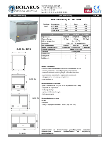 www.bolarus.com.pl e-mail: [email protected] tel. +48 14 61 49 300 fax +48 14 61 49 301; +48 14 61 49 303 Typ: Stół chłodniczy Opis techniczny Art. Nr Stół chłodniczy S-... BL INOX Wymiary: [mm] Zewnętrzne Dł. Szer. Wys. S-70 INOX 710 700 890 S-90 INOX 905 700 890 S-140 INOX 1363 700 890 S-70 INOX S-90 INOX S-140 INOX 184 [dm3] 234 [dm3] 364 [dm3] 80 [kg] 90 [kg] 100 [kg] TYP Pojemność: Ciężar własny: Zakres temperatur: Otoczenie: Moc znamionowa: Nomin. zużycie energii: Czynnik chłodniczy: S-90 BL INOX +2... +10 [ºC] +16… +25 [ºC] przy 60% HR 250 [W] 250 [W] 270 [W] 2,1 [kWh/24h] 2,43 [kWh/24h] 3,6 [kWh/24h] R-404a lub R-134a Zasilanie: 230/50 [V/Hz] Ilość komór: Ilość półek: 1 1 2 3 Ilość drzwi: 1 2 3 Wersja nierdzewna: - izolacja wykonana z ekologicznej pianki poliuretanowej 40 mm - drzwi wyposażone w uszczelkę magnetyczną wciskaną - elektroniczne sterowanie z cyfrowym wyświetlaczem temp. - automatyczne odszranianie i odparowanie kondensatu - obieg powietrza wymuszony wentylatorem S-70 BL - nogi regulowane Wyposażenie standardowe: - półki o wymiarze GN 1/1 (w S-70 INOX półka 465 x 514 mm) - wsporniki do pojemników - instrukcja obsługi - wykaz punktów serwisowych - karta gwarancyjna S-90 BL Wyposażenie opcjonalne: - kółka - rant tylni - wersja Tropik (otoczenie +16... +32ºC przy 60% HR) S-140 BL Zastosowanie: do krótkotrwałego przechowywania produktów spożywczych uprzednio wychłodzonych do temperatury przechowywania. 9/3