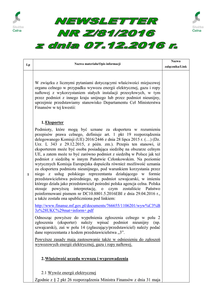 Nazwa materiału/Opis informacji Lp W związku z licznymi pytaniami dotyczącymi właściwości miejscowej organu celnego w przypadku wywozu energii elektrycznej, gazu i ropy naftowej z wykorzystaniem stałych instalacji przesyłowych, w tym przez podmiot z innego kraju unijnego lub przez podmiot nieunijny, uprzejmie przedstawiamy stanowisko Departamentu Ceł Ministerstwa Finansów w tej kwestii: 1. Eksporter 1 Podmioty, które mogą być uznane za eksportera w rozumieniu przepisów prawa celnego, definiuje art. 1 pkt 19 rozporządzenia delegowanego Komisji (UE) 2016/2446 z dnia 28 lipca 2015 r. (…) (Dz. Urz. L 343 z 29.12.2015, z późn. zm.). Przepis ten stanowi, iż eksporterem może być osoba posiadająca siedzibę na obszarze celnym UE, a zatem może to być zarówno podmiot z siedzibą w Polsce jak też podmiot z siedzibą w innym Państwie Członkowskim. Na poziomie wytycznych Komisja Europejska dopuściła również możliwość uznania za eksportera podmiotu nieunijnego, pod warunkiem korzystania przez niego z usług polskiego reprezentanta działającego w formie przedstawicielstwa pośredniego, np. podmiot szwajcarski, w imieniu którego działa jako przedstawiciel pośredni polska agencja celna. Polska stosuje powyższą interpretację, o czym zostaliście Państwo poinformowani pismem nr DC10.8801.5.2016EBI z dnia 29.04.2016 r., a także została ona upubliczniona pod linkiem: http://www.finanse.mf.gov.pl/documents/766655/1106201/wyw%C3%B 3z%28UKC%29mat+inform+.pdf Odnosząc powyższe do wypełnienia zgłoszenia celnego w polu 2 zgłoszenia (eksporter) należy wpisać podmiot nieunijny (np. szwajcarski), zaś w polu 14 (zgłaszający/przedstawiciel) należy podać dane reprezentanta z kodem przedstawicielstwa „3”. Powyższe zasady mają zastosowanie także w odniesieniu do zgłoszeń wywozowych energii elektrycznej, gazu i ropy naftowej. 2. Właściwość urzędu wywozu i wyprowadzenia 2.1 Wywóz energii elektrycznej Zgodnie z § 2 pkt 26 rozporządzenia Ministra Finansów z dnia 31 maja Nazwa załącznika/Link 2016 r. w sprawie właściwości miejscowej organów celnych (Dz. U. poz. 801) właściwość urzędu (urząd wywozu) w przypadku objęcia procedurą celną energii elektrycznej w transporcie przesyłowym określa się według miejsca zamieszkania lub siedziby osoby, na rzecz której dokonuje się zgłoszenia celnego. Dotyczy to przypadków gdy eksporterem jest podmiot polski. W przypadku, gdy eksporterem jest podmiot nieposiadający siedziby w Polsce, czyli podmiot unijny z siedzibą w innym kraju UE lub podmiot nieunijny z siedzibą w kraju spoza UE - właściwość urzędu celnego do złożenia zgłoszenia wywozowego należy ustalić mając na uwadze zasady ogólne prawa celnego, tj. art. 221 ust. 2 rozporządzenia wykonawczego Komisji (UE) 2015/2447 z dnia 24 listopada 2015 r. (Dz. Urz. L 343 z 29.12.2015, z późn. zm), zwane dalej rozporządzeniem wykonawczym. Zatem w przypadku gdy eksporterem energii elektrycznej jest podmiot inny niż podmiot mający miejsce zamieszkania lub siedzibę na terytorium Polski zgłoszenie wywozowe należy złożyć w urzędzie celnym właściwym dla miejsca, gdzie towary są pakowane lub ładowane do transportu wywozowego (urząd wywozu) (art. 221 ust. 2 lit b rozporządzenia wykonawczego). W przypadku braku możliwości ustalenia takiego miejsca (np. gdy podmiot kupuje towar już wprowadzony do stałego urządzenia przesyłowego) urzędem wywozu będzie urząd celny właściwy dla danej operacji ze względu na siedzibę reprezentanta (ze względów administracyjnych, o których mowa art. 221 ust. 2 lit. c) rozporządzenia wykonawczego). Zgłoszenie wywozowe składa się w miesięcznych okresach rozliczeniowych, w terminie do 10. dnia miesiąca następnego za miesiąc poprzedni (§ 34 ust. 1 rozporządzenia Ministra Finansów z dnia 8 września 2016 r. w sprawie zgłoszeń celnych, Dz. U. poz. 1498). Wyjątki od tej zasady dotyczą sytuacji: a) wymiany energii elektrycznej wynikającej z naturalnych przepływów w połączonych systemach elektroenergetycznych krajów sąsiadujących – w tych przypadkach zgłoszenie wywozowe składa się na podstawie salda wymiany w okresach rozliczeniowych nie dłuższych niż miesiąc, w terminie 3 dni od dnia uzgodnienia sald. b) przy wyprowadzaniu energii elektrycznej na zaopatrzenie miejscowości w strefie przygranicznej dokonywanych na podstawie protokołów wskazań urządzeń pomiarowych sporządzanych przez przedsiębiorstwa energetyczne – wg zasad wskazanych w lit. a. W przypadku gdy energia elektryczna opuści obszar celny UE stałym transportem przesyłowym urzędem wyprowadzenia jest urząd wywozu (art. 329 ust. 2 rozporządzenia wykonawczego). 2.2 Wywóz gazu, ropy naftowej Przepisy krajowe nie regulują kwestii właściwości urzędu celnego w przypadku wywozu gazu i ropy naftowej, zatem właściwość urzędu celnego do złożenia zgłoszenia wywozowego ustala się mając na uwadze zasady ogólne prawa celnego, tj. art. 221 ust. 2 rozporządzenia wykonawczego. Pierwszym kryterium dla określenia właściwości urzędu wywozu jest siedziba eksportera (art. 221 ust. 2 lit a rozporządzenia wykonawczego). W przypadku braku możliwości zastosowania kryterium siedziby eksportera (np. eksporterem jest podmiot nieunijny) zgłoszenie wywozowe należy złożyć w urzędzie celnym właściwym dla miejsca, gdzie towary są pakowane lub ładowane do transportu wywozowego (urząd wywozu) - art. 221 ust. 2 lit b rozporządzenia wykonawczego. W przypadku braku możliwości ustalenia takiego miejsca (np. gdy podmiot kupuje towar już wprowadzony do stałego urządzenia przesyłowego) urzędem wywozu będzie urząd celny właściwy dla danej operacji ze względu na siedzibę reprezentanta (ze względów administracyjnych, o których mowa art. 221 ust. 2 lit. c) rozporządzenia wykonawczego). Zgłoszenie wywozowe składa się w miesięcznych okresach rozliczeniowych, w terminie do 10. dnia