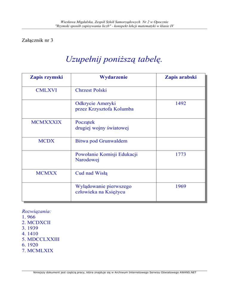 Wiesława Migdalska, Zespół Szkół Samorządowych Nr 2 w Opocznie "Rzymski sposób zapisywania liczb" - konspekt lekcji matematyki w klasie IV Załącznik nr 3 Uzupełnij poniższą tabelę. Zapis rzymski CMLXVI Wydarzenie Chrzest Polski Odkrycie Ameryki przez Krzysztofa Kolumba MCMXXXIX Początek drugiej wojny światowej MCDX Bitwa pod Grunwaldem Powołanie Komisji Edukacji Narodowej MCMXX Zapis arabski 1492 1773 Cud nad Wisłą Wylądowanie pierwszego człowieka na Księżycu 1969 Rozwiązania: 1. 966 2. MCDXCII 3. 1939 4. 1410 5. MDCCLXXIII 6. 1920 7. MCMLXIX Niniejszy dokument jest częścią pracy, która znajduje się w Archiwum Internetowego Serwisu Oświatowego AWANS.NET