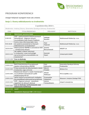 PROGRAM KONFERENCJI Uwaga! Kolejnośd wystąpieo może ulec zmianie. Sesja 1: Oceny oddziaływania na środowisko 2 października 2014 r. Moderator: Andrzej Dziura, Generalna Dyrekcja Ochrony Środowiska CZAS 9.00-9.30 9.30-9:55 9:55-10:20 10:20-10:45 10:45-11:10 TYTUŁ PREZENTACJI OOŚ - podsumowanie dotychczasowych doświadczeo - diagnoza sytuacji na przykładzie Kolei Dużych Prędkości Czemu służy informacja (jako rama do wydania pozwolenia) w Ocenach Oddziaływania na Środowisko? Wykorzystanie INSPIRE w procedurze OOŚ - standaryzacja danych Jak zadbad o jakośd informacji o środowisku: nowe technologie sprzymierzeocem przyrodników czy inwestorów? Czas na dyskusję 11.30-12.00 Przerwa kawowa 12:20-12:40 12:40-13:00 13:00-13:20 13:20-13:40 13:40-14:00 INSTYTUCJA Rejestracja i poranna kawa 11:10-11:30 12.00-12:20 PRELEGENT Bank Inwentaryzacji Przyrodniczych węzłem infrastruktury INSPIRE Prawa autorskie do dokumentacji o stanie środowiska i jego ochronie Niepewnośd danych a ryzyko inwestycyjne na przykładzie doświadczeo spółki eksploracyjnej PD CO Jakośd danych przyrodniczych niezbędna do prawidłowej waloryzacji przyrodniczej OOŚ - diagnoza sytuacji - wywołanie zagadnieo do dalszych dyskusji Czas na dyskusję i podsumowanie sesji Zakooczenie konferencji 14.00-15.00 Lunch Od 14.40 Zwiedzanie ekspozycji CNK (140 miejsc) Jadwiga Ronikier Multiconsult Polska Sp. z o.o. Piotr Poborski Multiconsult Polska Sp. z o.o. Jaromir Borzuchowski MGGP S.A. Dominik Koped Uniwersytet Łódzki Piotr Dobrzyoski Marcin Pchałek Witold Wołoszyn Przemysław Chylarecki Joanna Tomaszkiewicz Generalna Dyrekcja Ochrony Środowiska Behave Eco PD Co Spółka z o.o. Muzeum i Instytut Zoologii PAN ekspert zewnętrzny Sesja 2: Wykorzystanie danych o środowisku w edukacji i turystyce 2 października 2014 r. Moderator: Maciej Nowak, Uniwersytet im. Adama Mickiewicza w Poznaniu CZAS TYTUŁ PREZENTACJI PRELEGENT 9.00-9.30 Rejestracja i poranna kawa 9.30-9:50 Rola GIS w integracji badao różnorodności Maciej biologicznej na szczeblu edukacyjnym, Nowak naukowym i administracyjnym 9:50-10:10 10:10-10:30 Jak zainspirowad młodych ludzi? GIS kluczem do ciekawych projektów edukacyjnych Czas w las – edukacja w Lasach Paostwowych Marta Samulowska GISonLine, Centralny Ośrodek Turystyki Górskiej, Uniwersytet Jagiellooski Lokalna Grupa Działania Doliną Wieprza i Leśnym Szlakiem, GISExpert Sp. z o.o. 10:50-11:10 Najlepszy pomysł na ochronę krajobrazu w Europie - jak skutecznie edukowad i angażowad społecznośd w ochronę przyrody? 11:10-11:30 Czas na dyskusję 11.30-12.00 Przerwa kawowa 12.00-12:20 Na wirtualnym szlaku - Geoportal Małopolskich Szlaków Turystycznych narzędziem do promocji regionu Tomasz Gacek, Mateusz Troll, Tomasz Gołąbek 12:20-12:40 Jak promowad przyrodę i turystykę w cyfrowym świecie? Łukasz Prażmo 12:40-13:00 Zrozumied miłośników natury 13:20-13:40 13:40-14:00 14.00-15.00 Lunch Od 14.40 Zwiedzanie ekspozycji CNK (140 miejsc) Esri Polska Sp. z o.o. Dyrekcja Generalna Lasów Paostwowych Drzewa pomniki przyrody jako obiekty kulturowe Zasoby geologiczne dla rozwoju geoturystyki Laserowi Odkrywcy – nieinwazyjne i społecznościowe badanie zasobów archeologicznych na terenach leśnych Czas na dyskusję i podsumowanie sesji Zakooczenie konferencji Uniwersytet im. Adama Mickiewicza w Poznaniu, Zespół Parków Krajobrazowych Województwa Wielkopolskiego Anna Pikus Piotr Dobrzyoski, Jacek Bożek Marek Cieślak, Tomasz Szuszkiewicz 10:30-10:50 13:00-13:20 INSTYTUCJA Krzysztof Kierzkowski Magdalena Sidorczuk Maciej Sztampke Generalna Dyrekcja Ochrony Środowiska oraz Klub Gaja Dolnośląski Zespół Parków Krajobrazowych SAS Institute Sp z o.o. Paostwowy Instytut Geologiczny Paostwowy Instytut Badawczy Fundacja Centrum GeoHistorii Sesja 3: Prezentacja wyników projektów naukowych 2 października 2014 r. Moderator: Stanisław Lewioski, Centrum Badao Kosmicznych Polskiej Akademii Nauk CZAS 9.00-9.30 9.30-9:50 9:50-10:10 10:10-10:30 10:30-10:50 10:50-11:10 TYTUŁ PREZENTACJI Modelowanie obiegu materii z wykorzystaniem modelu SWAT w programie Zintegrowanego Monitoringu Środowiska Przyrodniczego (ZMŚP) Lotnicze i terenowe skanowanie laserowe środowiska leśnego - aktualne problemy badawcze Czy przeszłośd pomaga nam przewidzied przyszłośd lasów Karpat? Nowe perspektywy w analizie i modelowaniu zmian powierzchni lasów Automatyzacja procesu aktualizacji map pokrycia i użytkowania terenu w oparciu o wielo- i hiper-spektralne zobrazowania teledetekcyjne - projekt SaLMaR Nowoczesne technologie teledetekcyjne w geologii Czas na dyskusję 11.30-12.00 Przerwa kawowa 12:20-12:40 12:40-13:00 13:00-13:20 13:20-13:40 13:40-14:00 INSTYTUCJA Rejestracja i poranna kawa 11:10-11:30 12.00-12:20 PRELEGENT Identyfikacja siedlisk Natura 2000 metodami teledetekcyjnymi na przykładzie torfowisk zasadowych w dolinie Biebrzy Kompleksowy monitoring procesów hydro-meteorologicznych obszarów Natura 2000 z wykorzystaniem teledetekcji naziemnej i lotniczej Nowe metody badao jakości wód wykorzystujące technikę teledetekcji lotniczej - przykłady zastosowao Zastosowanie obrazów hiperspektralnych AISA do badania roślinności terenów miejskich Teledetekcja hiperspektralna w monitoringu obszarów zanieczyszczonych metalami ciężkimi Czas na dyskusję i podsumowanie sesji Zakooczenie konferencji 14.00-15.00 Lunch Od 14.40 Zwiedzanie ekspozycji CNK (140 miejsc) Joanna Gudowicz, Alfred Stach Uniwersytet im. Adama Mickiewicza w Poznaniu Krzysztof Stereoczak Instytut Badawczy Leśnictwa Katarzyna Ostapowicz Uniwersytet Jagiellooski Piotr Wężyk Uniwersytet Rolniczy w Krakowie Mirosław Kamioski Paostwowy Instytut Geologiczny Paostwowy Instytut Badawczy Dominik Koped Uniwersytet Łódzki Jarosław Chormaoski Szkoła Główna Gospodarstwa Wiejskiego Małgorzata Słapioska Szkoła Główna Gospodarstwa Wiejskiego, Uniwersytet Warszawski Anna Jarocioska Uniwersytet Warszawski Bogdan Zagajewski Uniw
