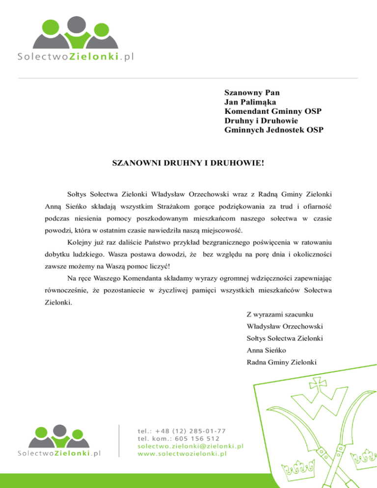 Szanowny Pan Jan Palimąka Komendant Gminny OSP Druhny i Druhowie Gminnych Jednostek OSP SZANOWNI DRUHNY I DRUHOWIE! Sołtys Sołectwa Zielonki Władysław Orzechowski wraz z Radną Gminy Zielonki Anną Sieńko składają wszystkim Strażakom gorące podziękowania za trud i ofiarność podczas niesienia pomocy poszkodowanym mieszkańcom naszego sołectwa w czasie powodzi, która w ostatnim czasie nawiedziła naszą miejscowość. Kolejny już raz daliście Państwo przykład bezgranicznego poświęcenia w ratowaniu dobytku ludzkiego. Wasza postawa dowodzi, że bez względu na porę dnia i okoliczności zawsze możemy na Waszą pomoc liczyć! Na ręce Waszego Komendanta składamy wyrazy ogromnej wdzięczności zapewniając równocześnie, że pozostaniecie w życzliwej pamięci wszystkich mieszkańców Sołectwa Zielonki. Z wyrazami szacunku Władysław Orzechowski Sołtys Sołectwa Zielonki Anna Sieńko Radna Gminy Zielonki
